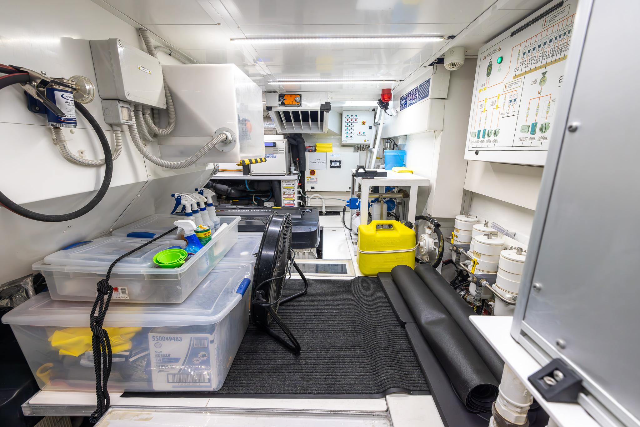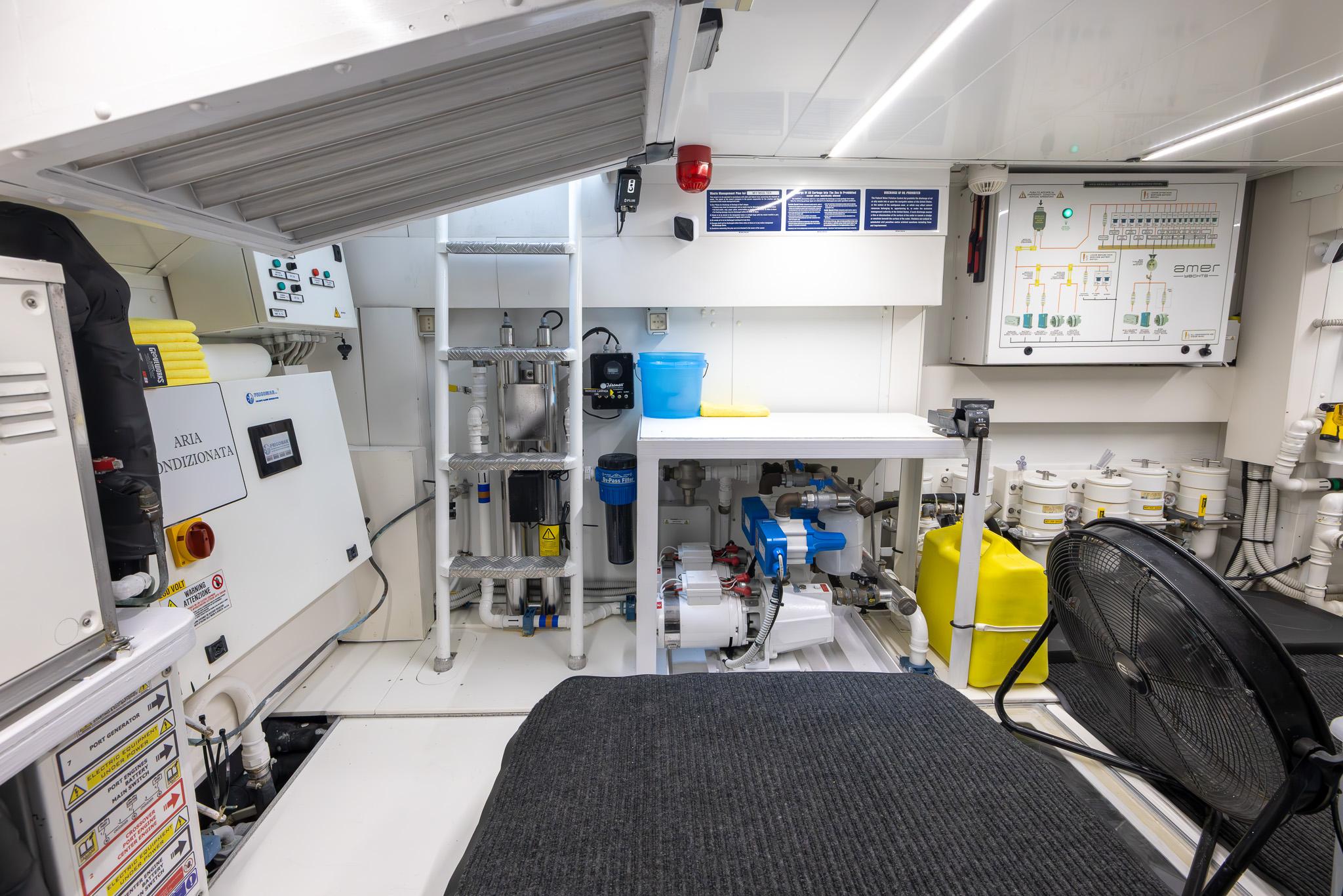 Посадка на борт Sea Metri V осуществляется через гидравлическую купально-спусковую платформу, покрытую тиком, кормовой трап с тиковым покрытием или шестиступенчатую лестницу MarQuipt по правому борту у боковой двери. В кормовом гараже для тендера размещён надувной тендер Rinieri длиной 12 футов с четырёхтактным подвесным мотором Suzuki мощностью 50 л.с. В кормовом кокпите расположены лежак для загара, обеденная зона и лестница на флайбридж. По правому борту находится пост управления двигателями. Доступ в машинное отделение расположен по левому борту сразу перед кормовой палубой. Бортовые проходы и носовая часть полностью покрыты тиком. На носу установлены матрасы для загара и ящики для хранения.