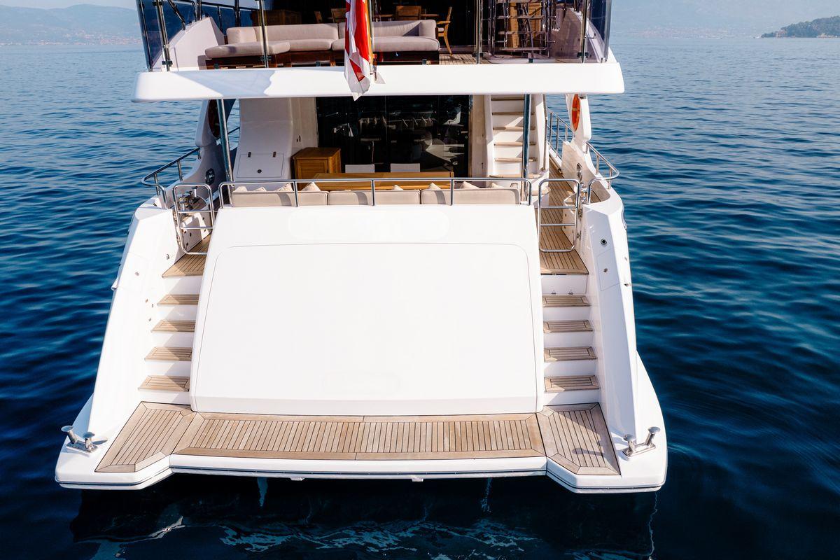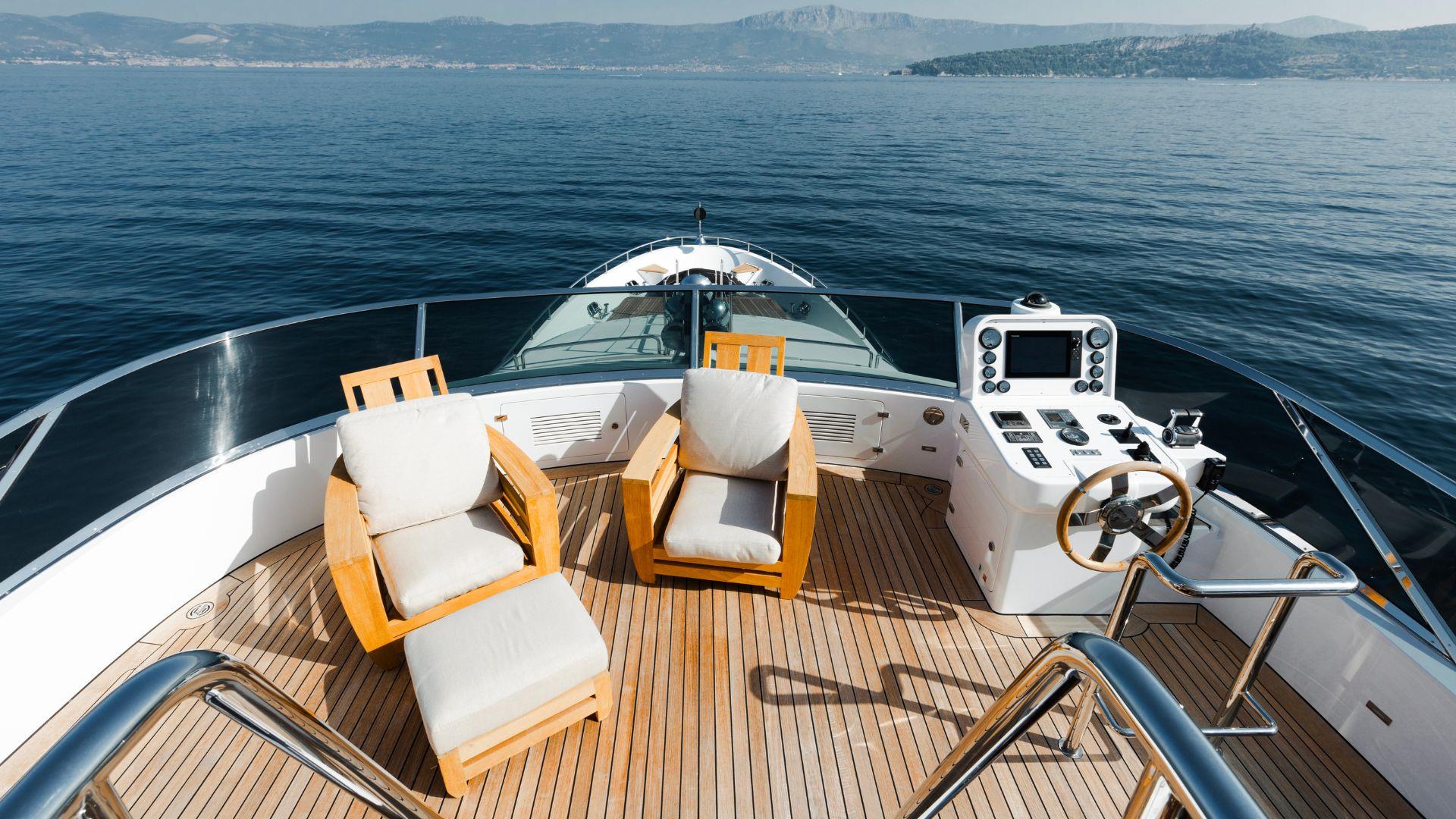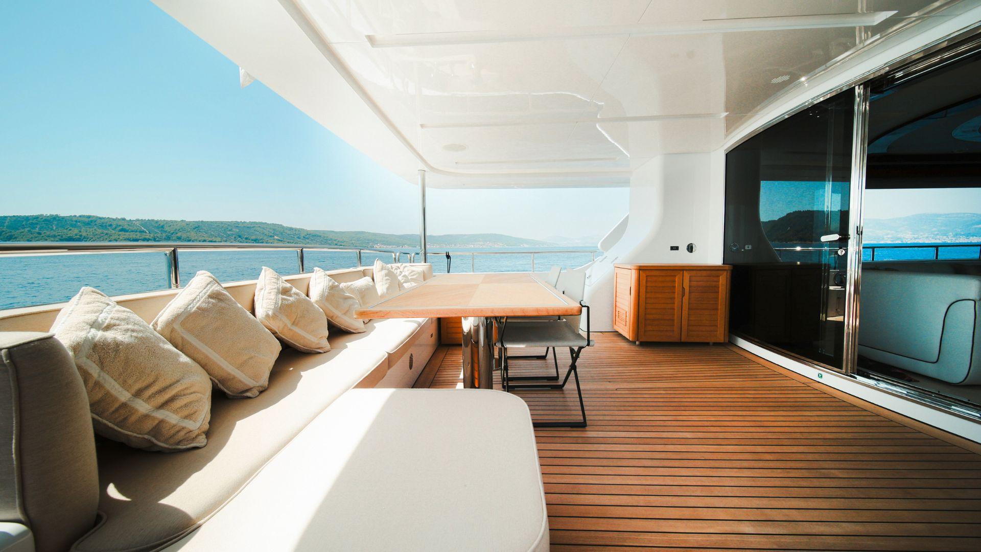 Просторный сандек Afina оборудован большой тиковой софой, обращённой к скрытому 55-дюймовому телевизору. В носовой части находится бар с газовым грилем, а в кормовой — обширная зона для загорания. Тент на палубе оснащён системой охлаждения с распылением водяного тумана.