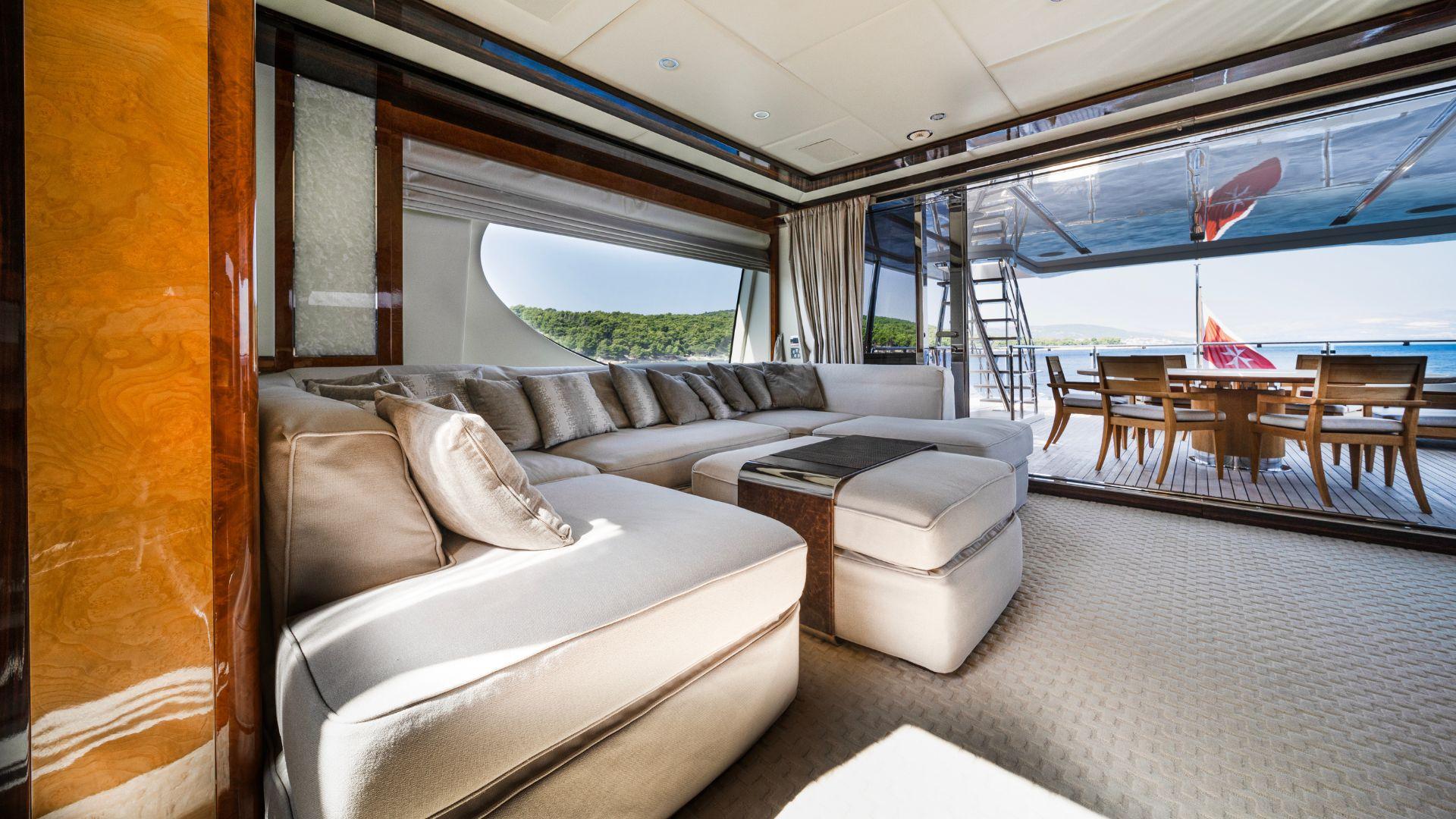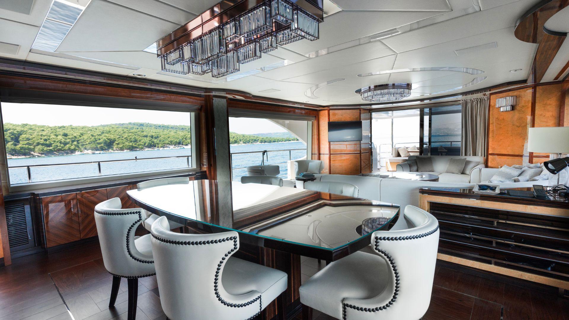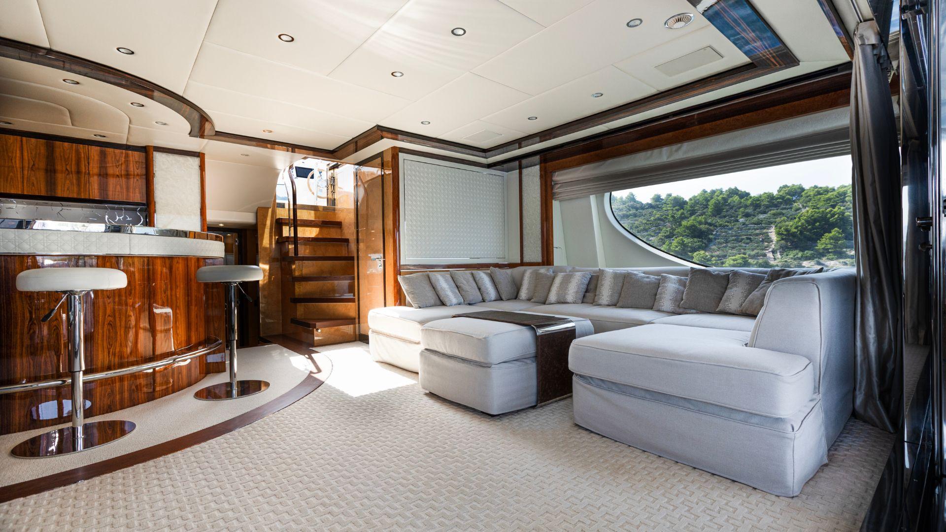 Панорамные окна на главной палубе наполняют салон естественным светом, а глянцевые поверхности из янтарного дерева в сочетании с ониксом и светлой мягкой мебелью создают изысканную атмосферу сдержанной роскоши и спокойного уюта.