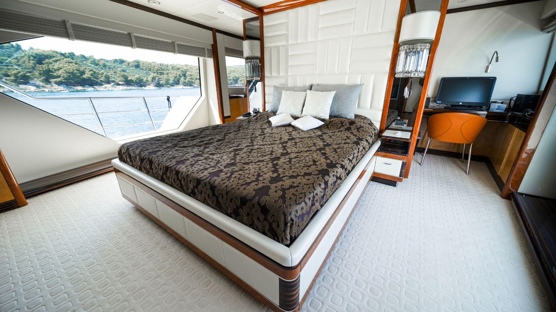 Вся носовая часть главной палубы Afina отведена под индивидуально спроектированную каюту Владельца, увеличенную по сравнению с другими яхтами Benetti 108. Помимо просторной спальни и ванных комнат, здесь предусмотрены отдельный кабинет, полноценная гардеробная и личная прачечная. На верхней палубе расположена зона отдыха и бар.