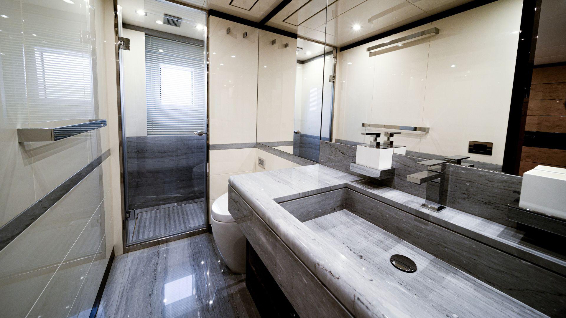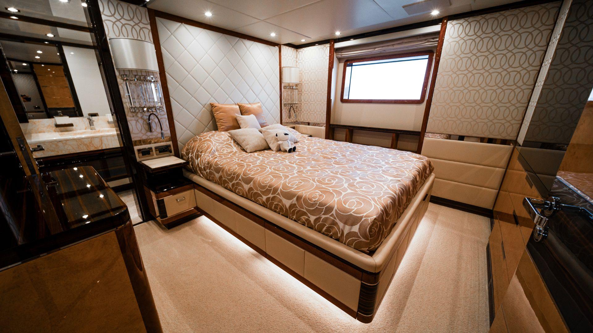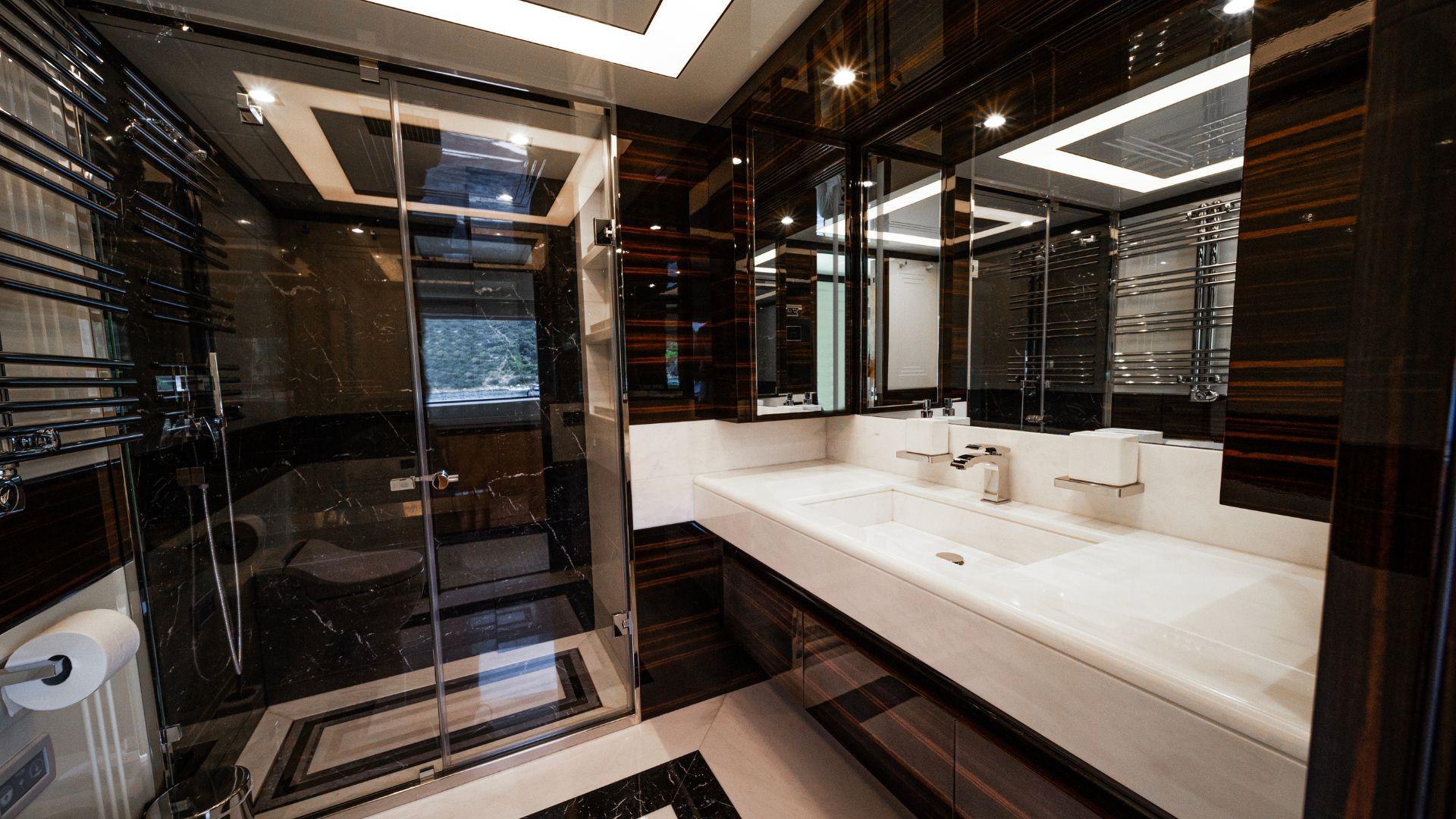 Лестница из светлого ясеня ведёт на нижнюю палубу, где размещены четыре гостевые каюты (2 VIP с двуспальными кроватями и 2 каюты с раздельными кроватями), оформленные в спокойных тонах. Каждая каюта оснащена собственной просторной ванной комнатой с отделкой мрамором.