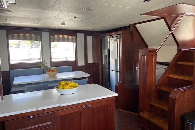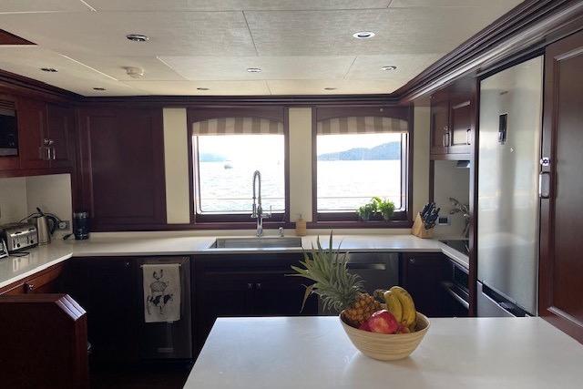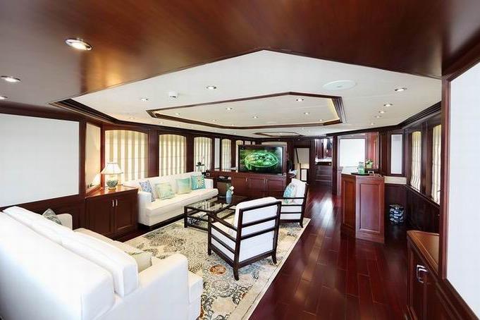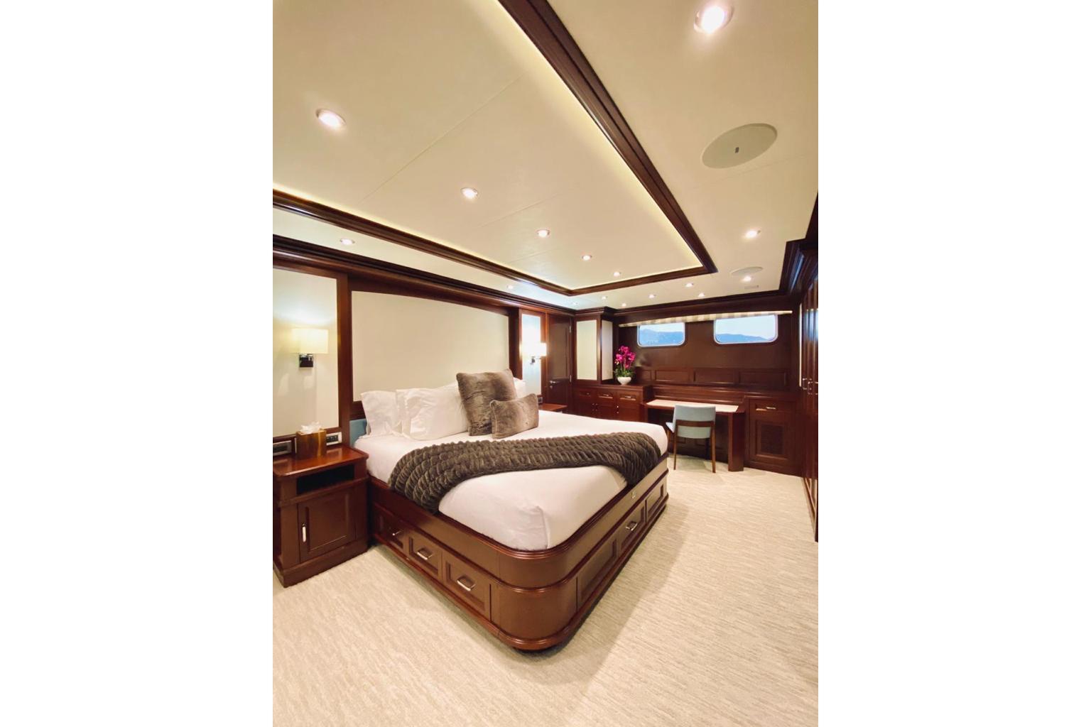 Интерьер, разработанный студией Kirschtein Interior Designs (Лондон), выполнен в классическом североамериканском стиле с отделкой из вишнёвого дерева и мягкой мебелью нейтральных тонов, идеально подходящей для длительного проживания на борту. Яхта размещает до восьми гостей в четырёх каютах с собственными ванными комнатами, а также до пяти членов экипажа — в носовых каютах (две ванные комнаты) и в каюте механика в кормовой части (с собственной ванной).