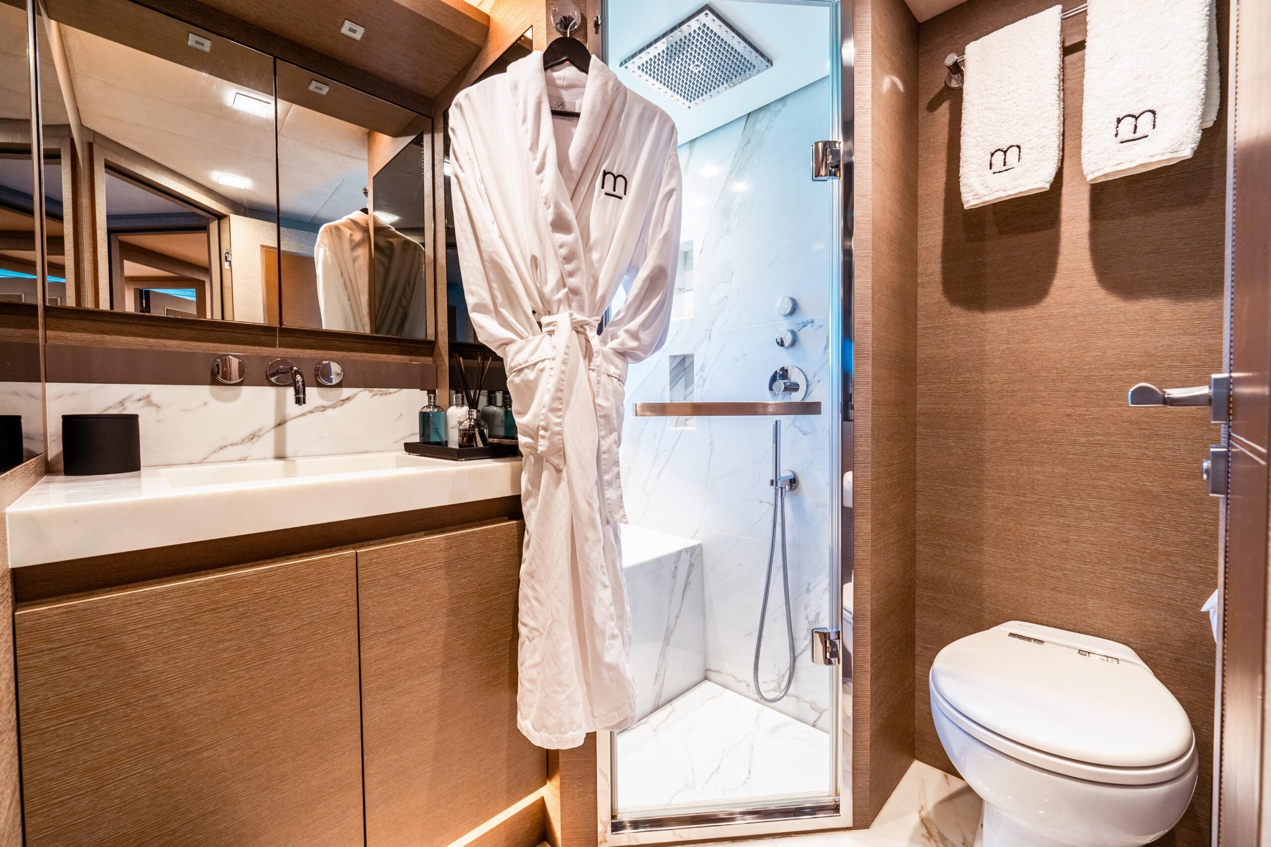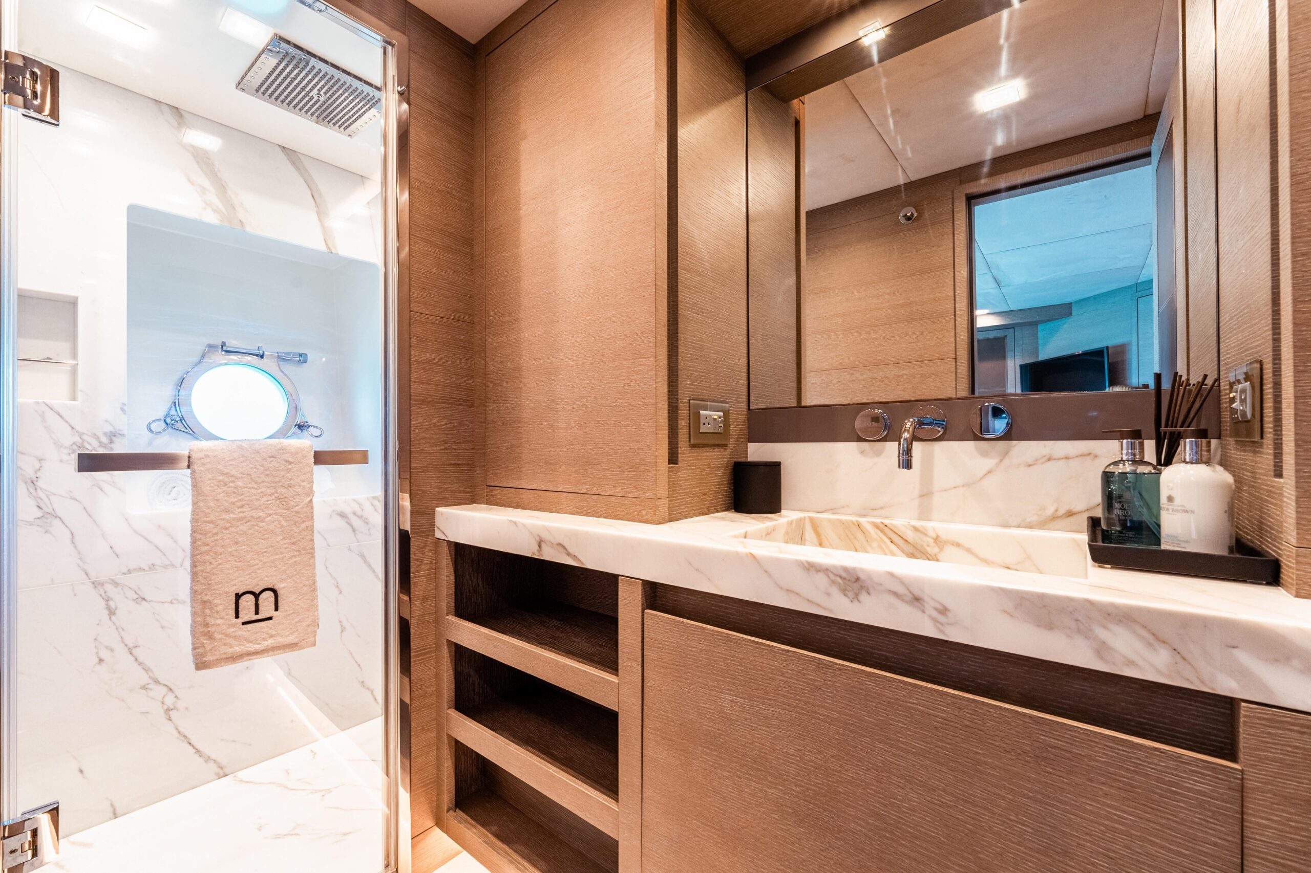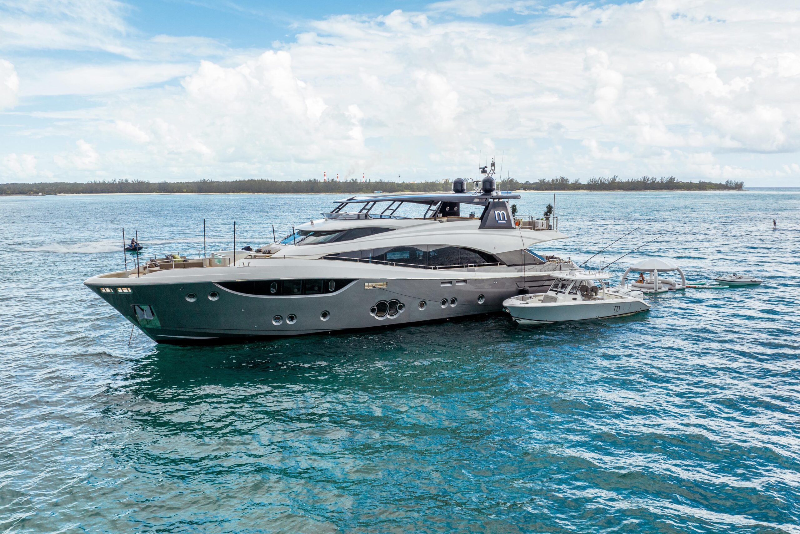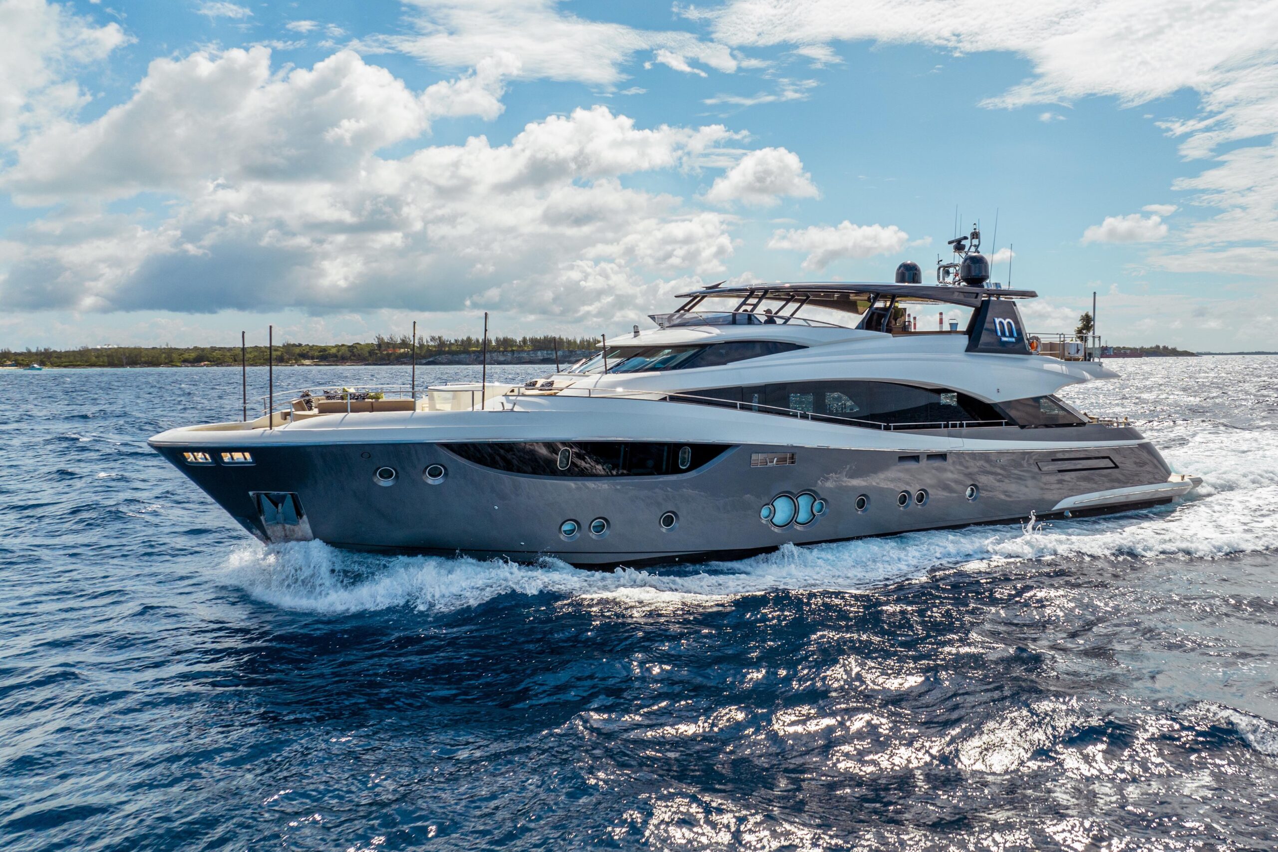 Благодаря выразительному профилю M притягивает взгляд: её стально-серый корпус с большими окнами и строгими линиями уверенно поднимается над водой, а просторный карбоновый T-top формирует характер флайбриджа. И издалека, и у причала её силуэт мощный, узнаваемый и его невозможно не заметить.