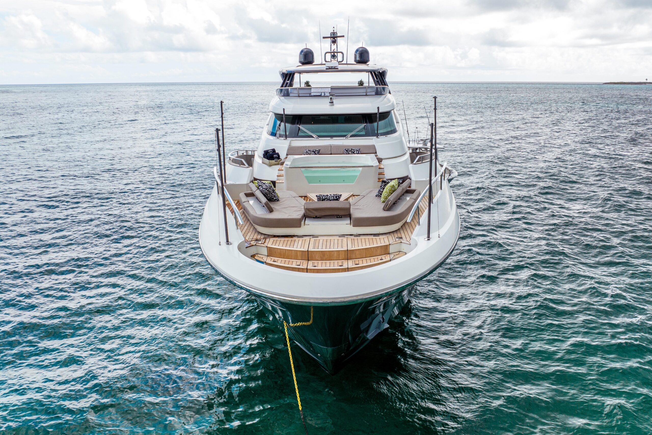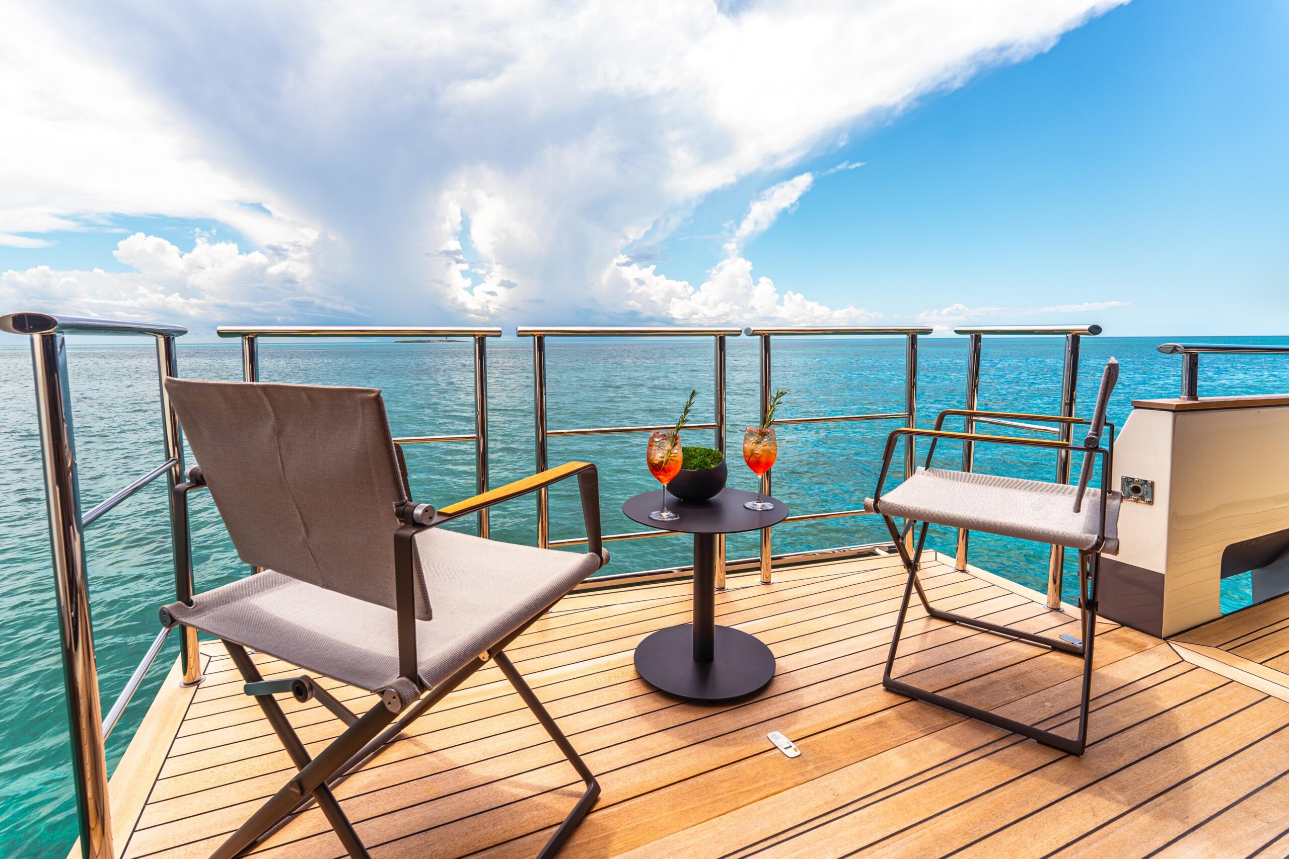 В носовой части португальская палуба ведёт к продуманной лаунж-зоне на фордеке — идеальной для уединения от оживлённой кормовой палубы. Большой диван, джакузи, две лежанки для загара и возможность организовать «кинотеатр» для просмотра фильмов создают атмосферу полной приватности с видом на море.