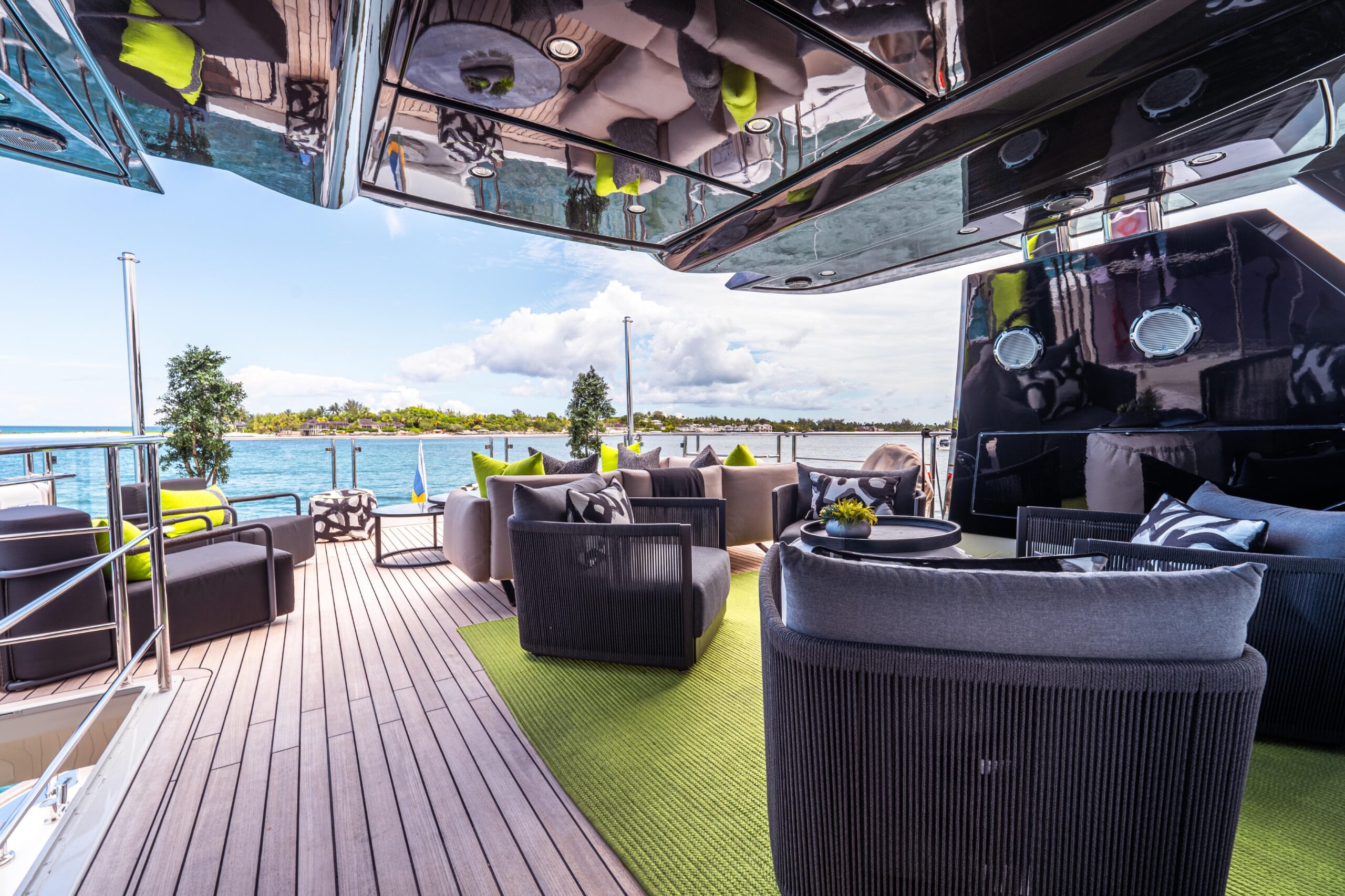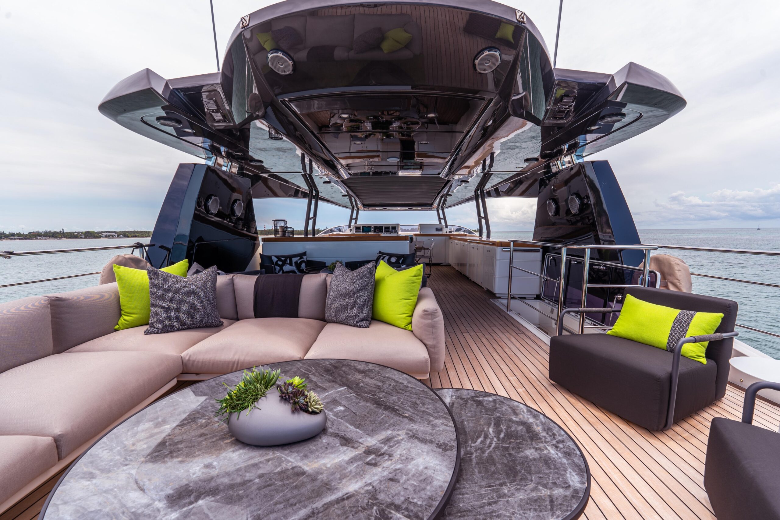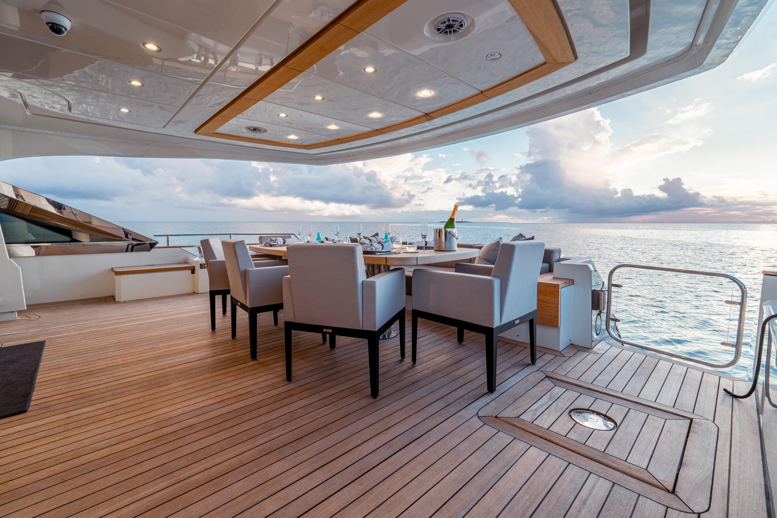 Сердце отдыха на открытом воздухе — просторный флайбридж площадью 70 м², укрытый выдвижным карбоновым T-top длиной 6 метров. Это пространство разделено на три зоны: формальная обеденная зона с большим круглым столом до 12 гостей и камбузом/BBQ в нескольких шагах, крытая зона отдыха с четырьмя креслами, а в корме — ещё одна зона с диваном и лежаками. Настоящее убежище верхней палубы для отдыха и приёма гостей днём и ночью.