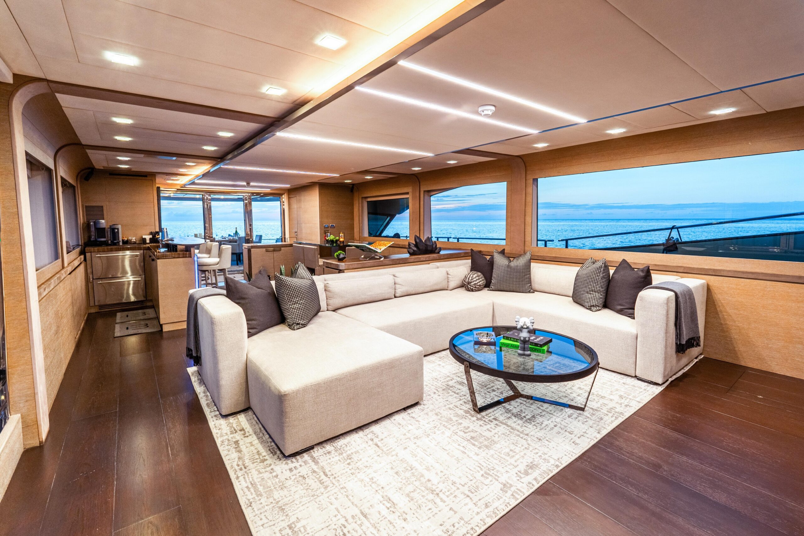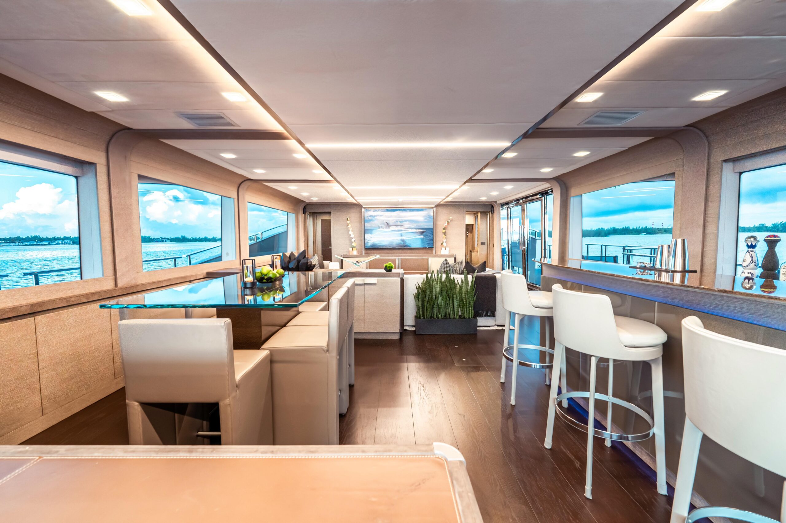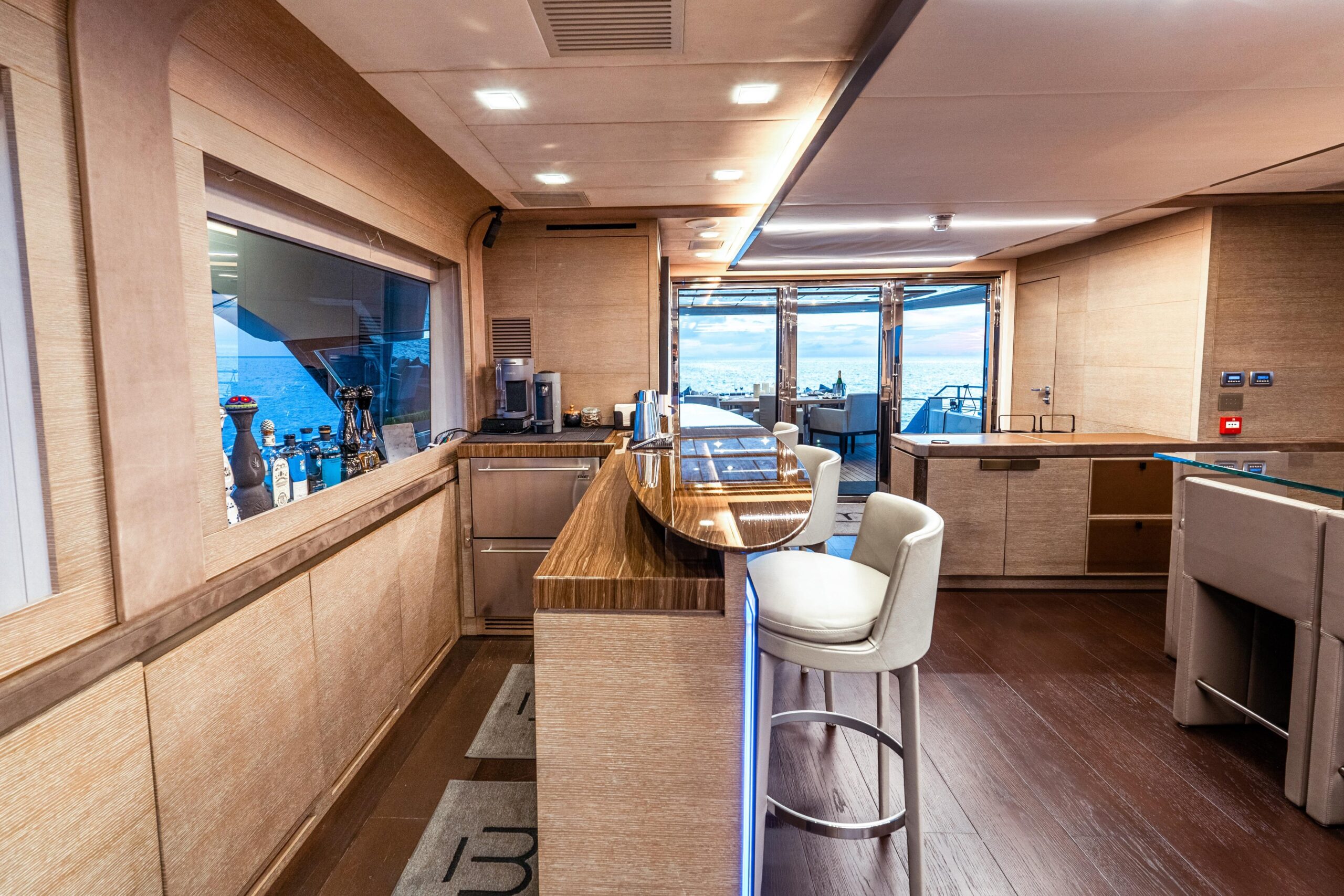 Сердце отдыха на открытом воздухе — просторный флайбридж площадью 70 м², укрытый выдвижным карбоновым T-top длиной 6 метров. Это пространство разделено на три зоны: формальная обеденная зона с большим круглым столом до 12 гостей и камбузом/BBQ в нескольких шагах, крытая зона отдыха с четырьмя креслами, а в корме — ещё одна зона с диваном и лежаками. Настоящее убежище верхней палубы для отдыха и приёма гостей днём и ночью.