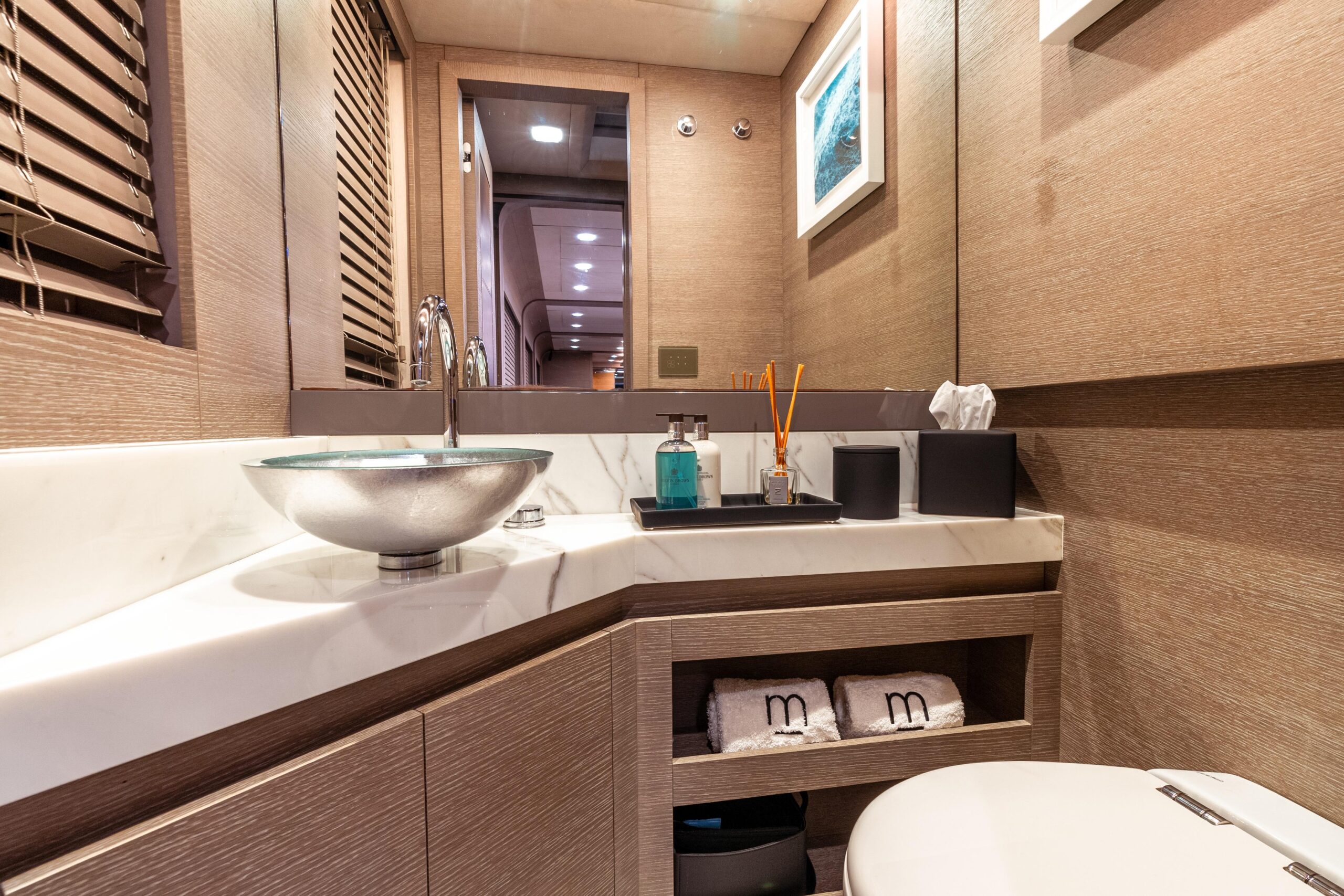 Внутри MCY 105 не кричит о роскоши — она говорит о ней тихо. Ручная отделка тика и дуба в мягких натуральных оттенках создаёт ощущение спокойствия. Палитра богатая, но сдержанная — атмосфера одновременно уютная и утончённая.