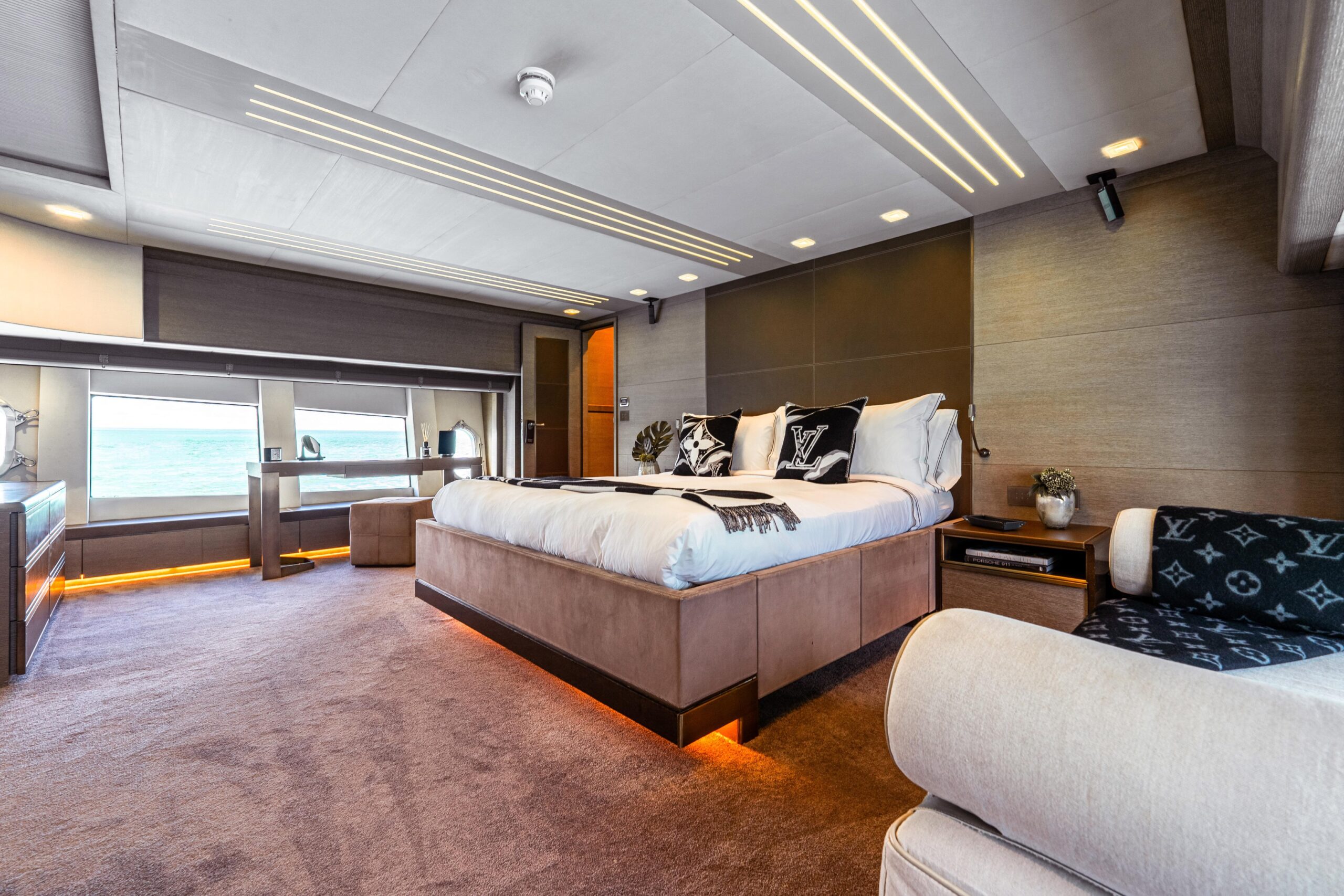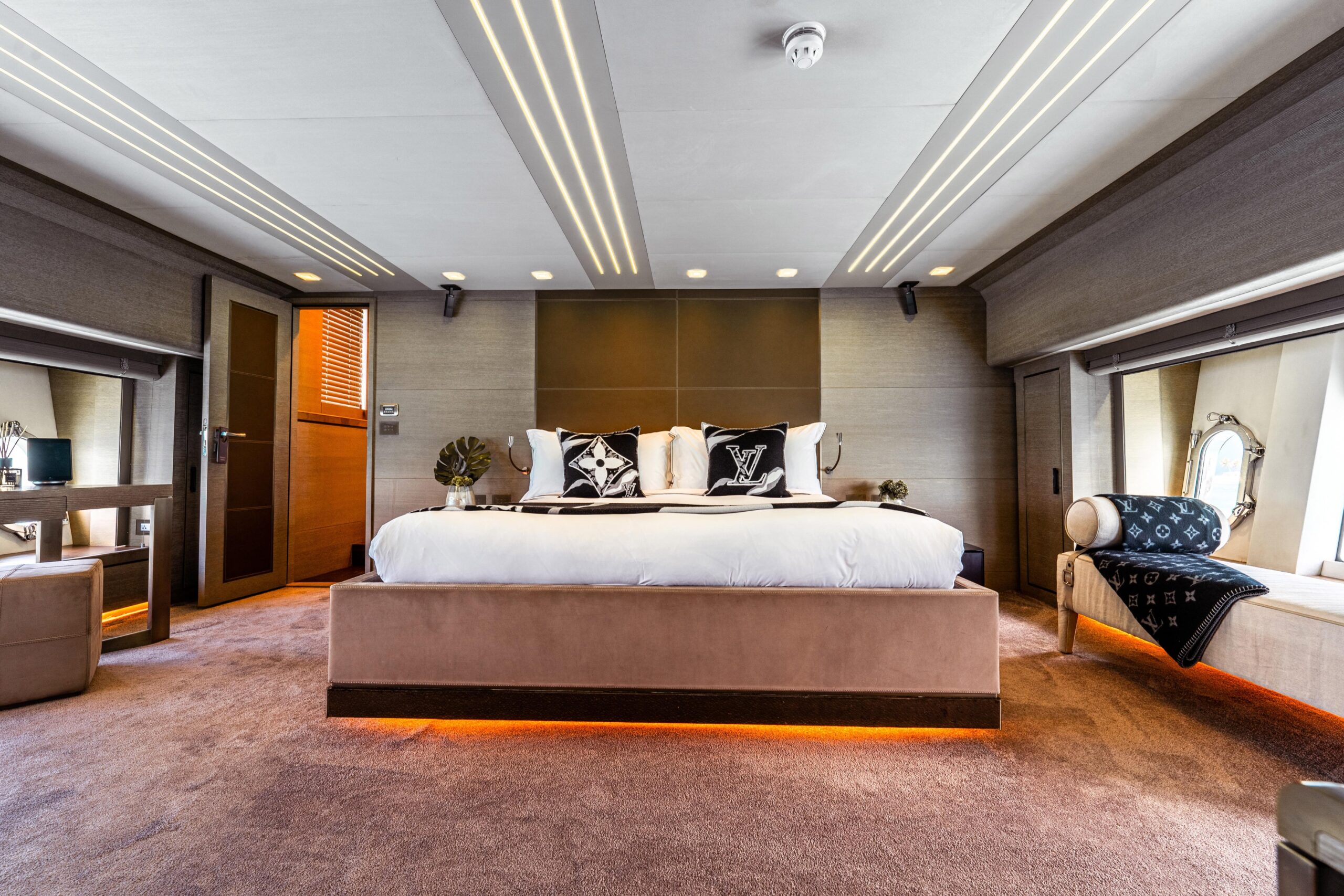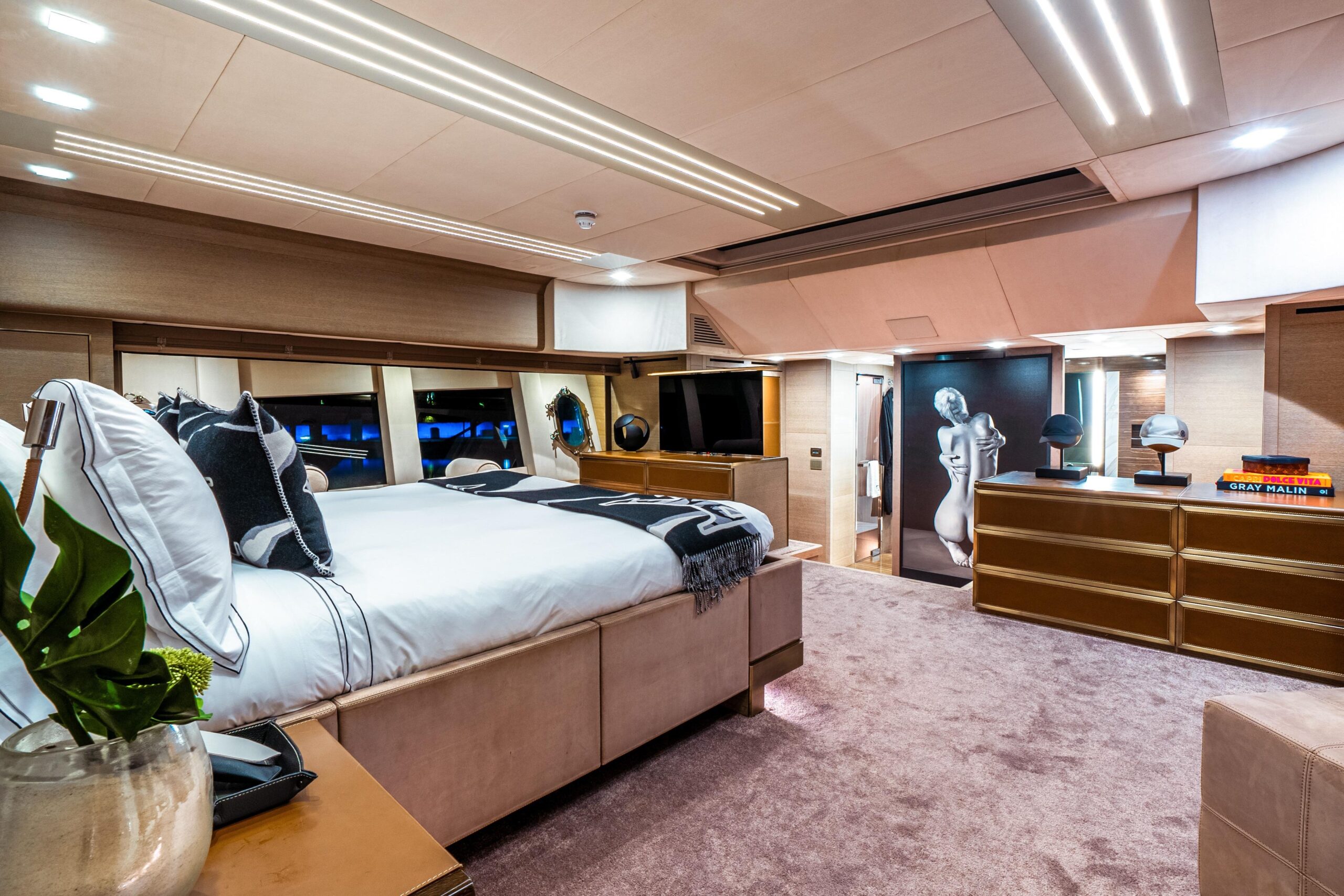 Особенно удачное решение планировки — перенос камбуза на нижнюю палубу, что освобождает главную палубу для просторных зон отдыха и обеденной зоны. Полноразмерная каюта владельца по всей ширине корпуса, доступная через приватный проход по правому борту, — это двухуровневое пространство, больше напоминающее бутик-апартаменты, чем каюту.