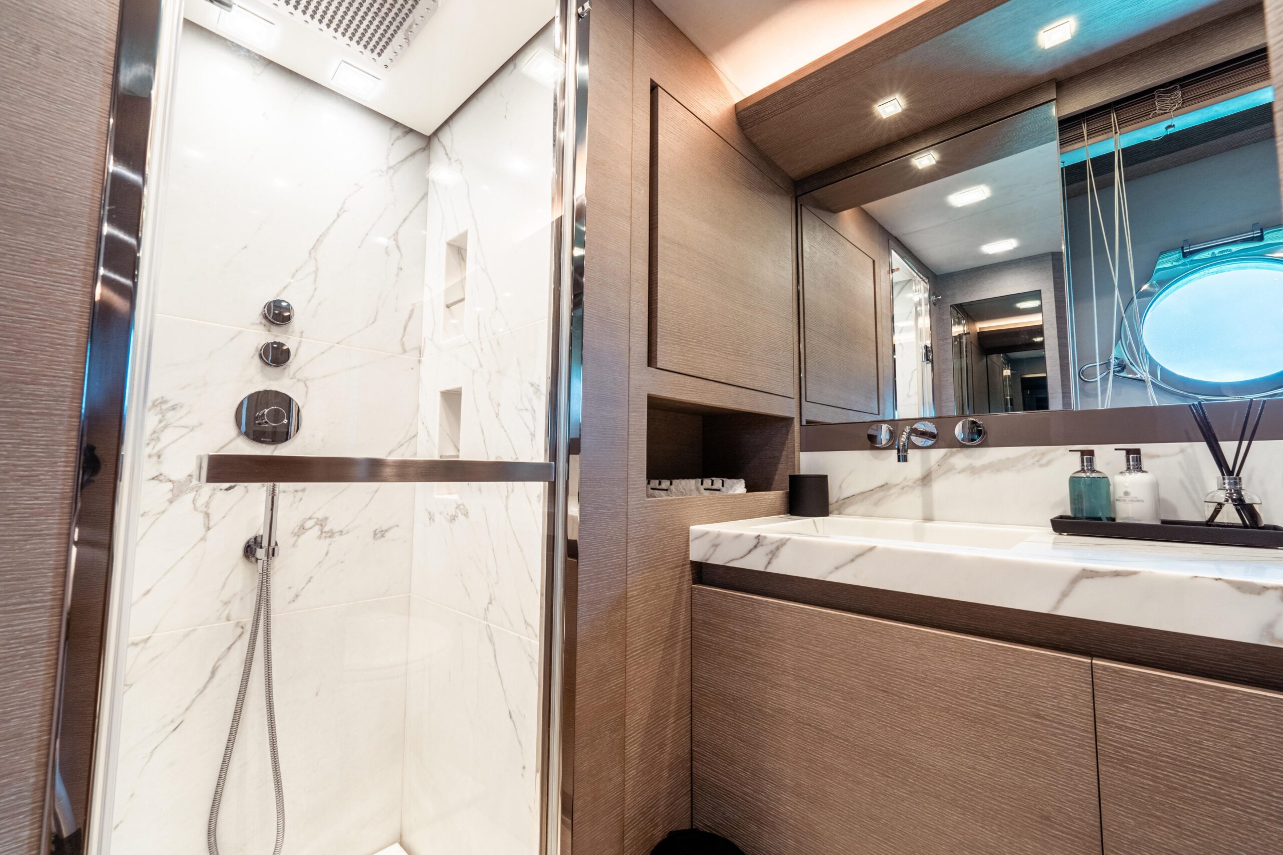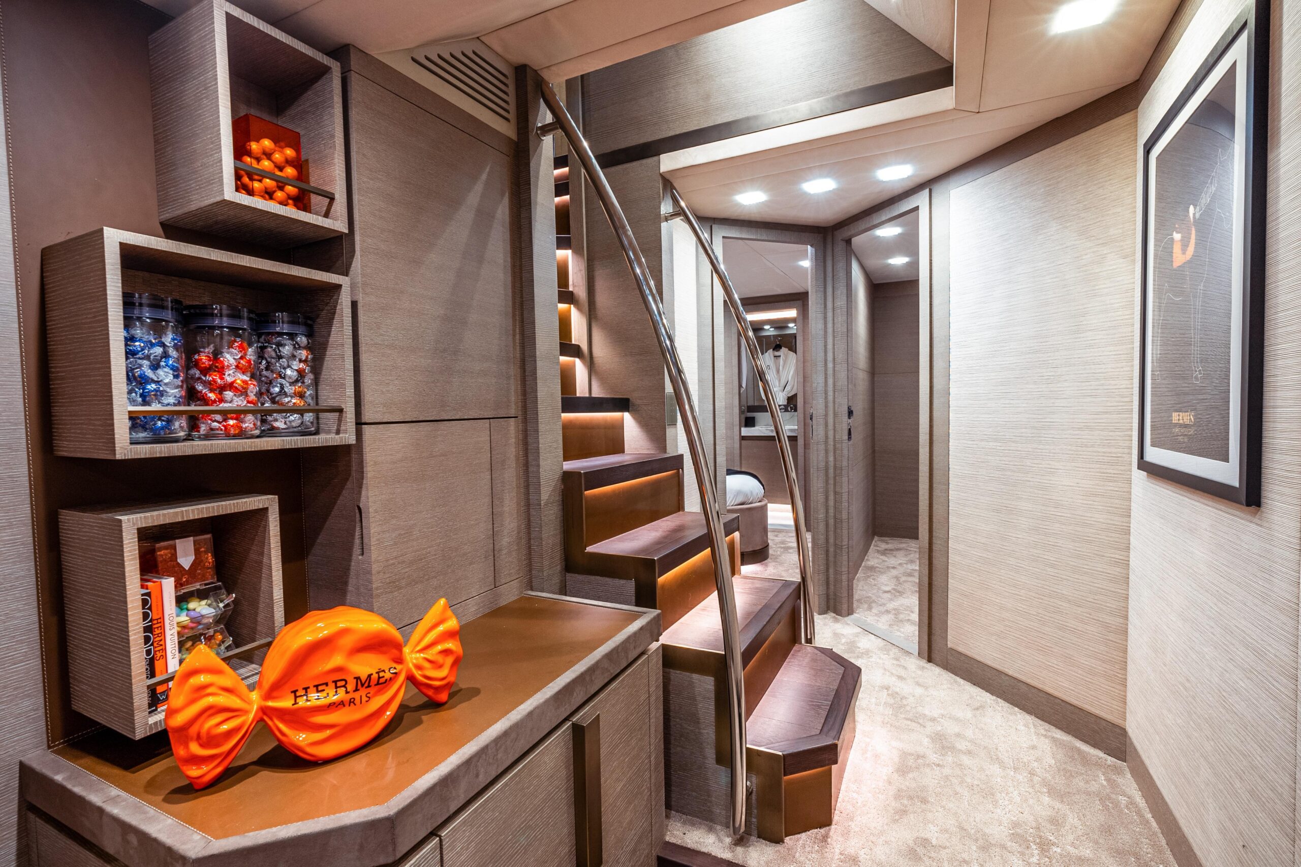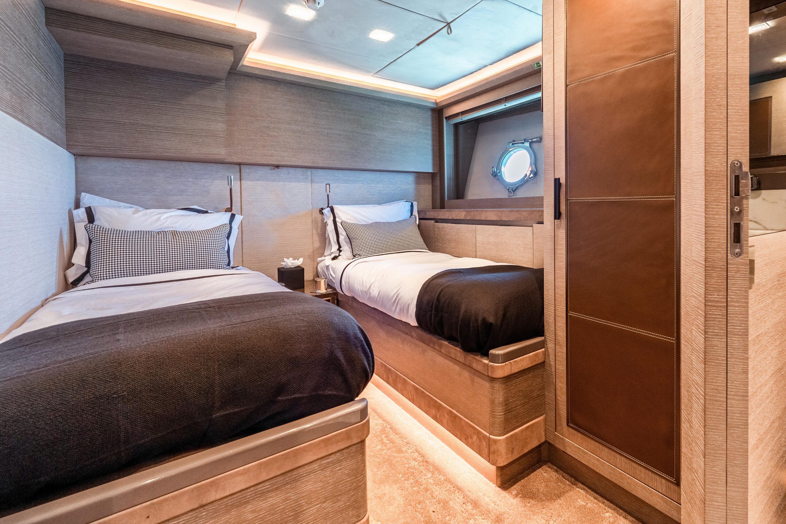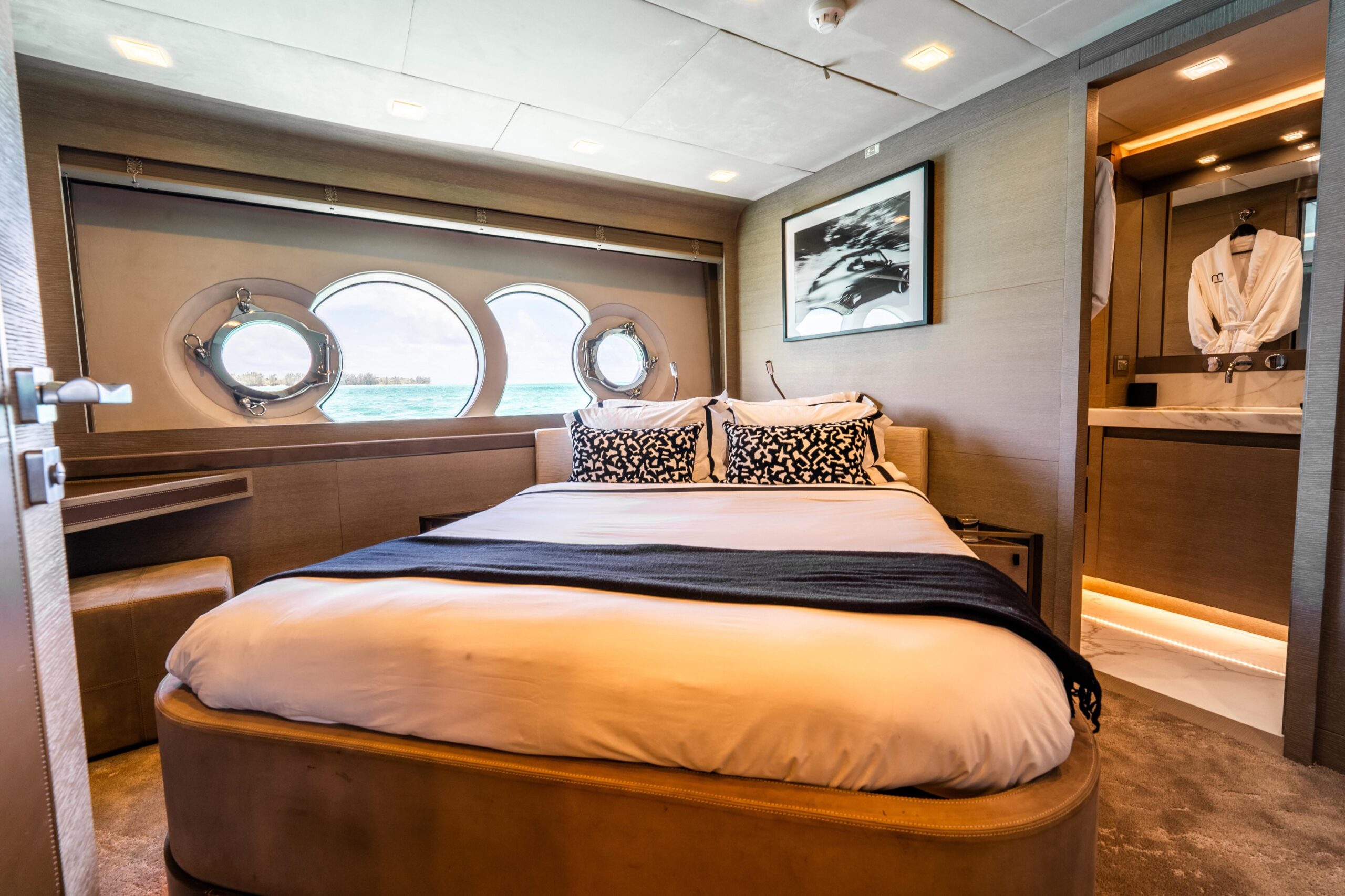 Особенно удачное решение планировки — перенос камбуза на нижнюю палубу, что освобождает главную палубу для просторных зон отдыха и обеденной зоны. Полноразмерная каюта владельца по всей ширине корпуса, доступная через приватный проход по правому борту, — это двухуровневое пространство, больше напоминающее бутик-апартаменты, чем каюту.