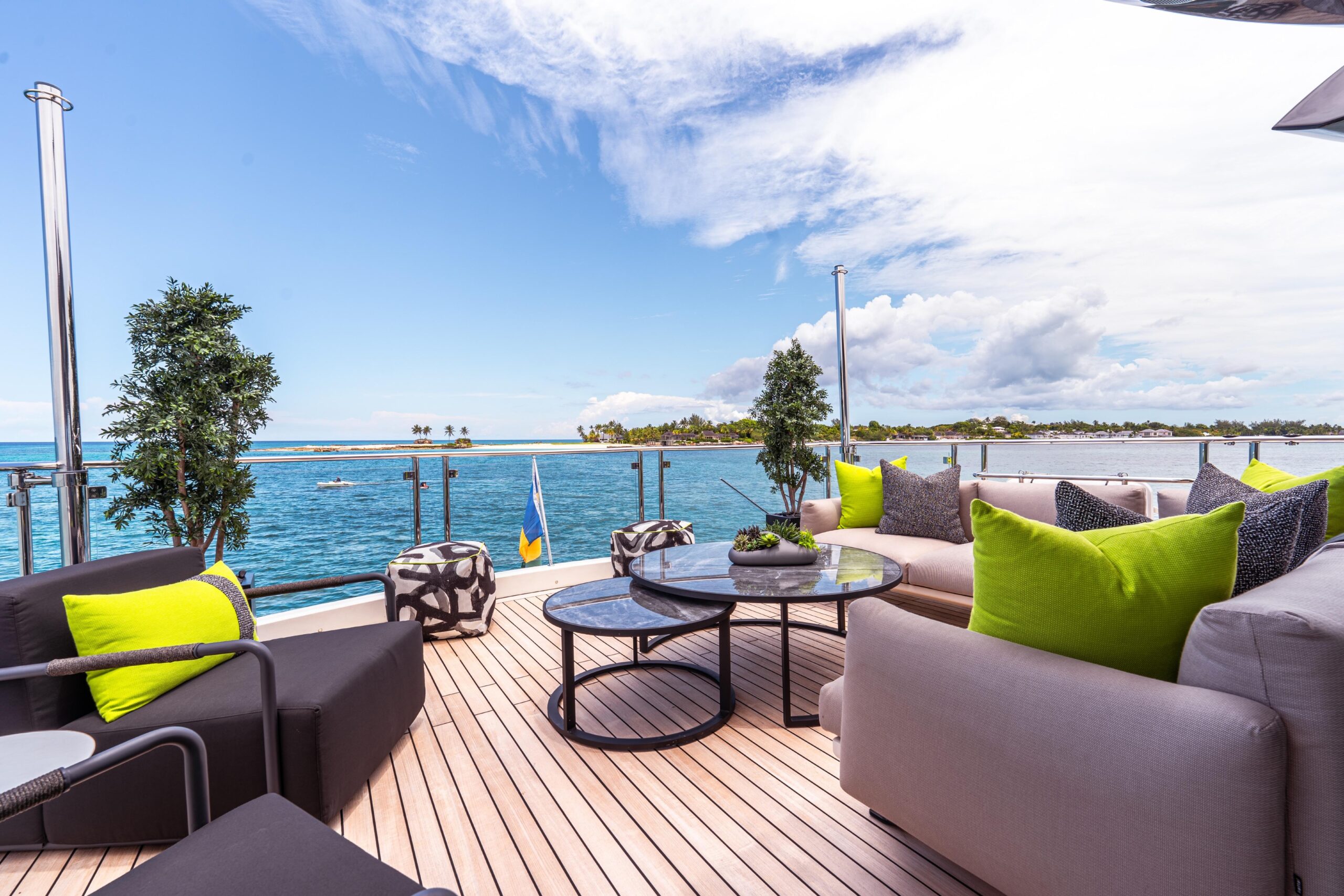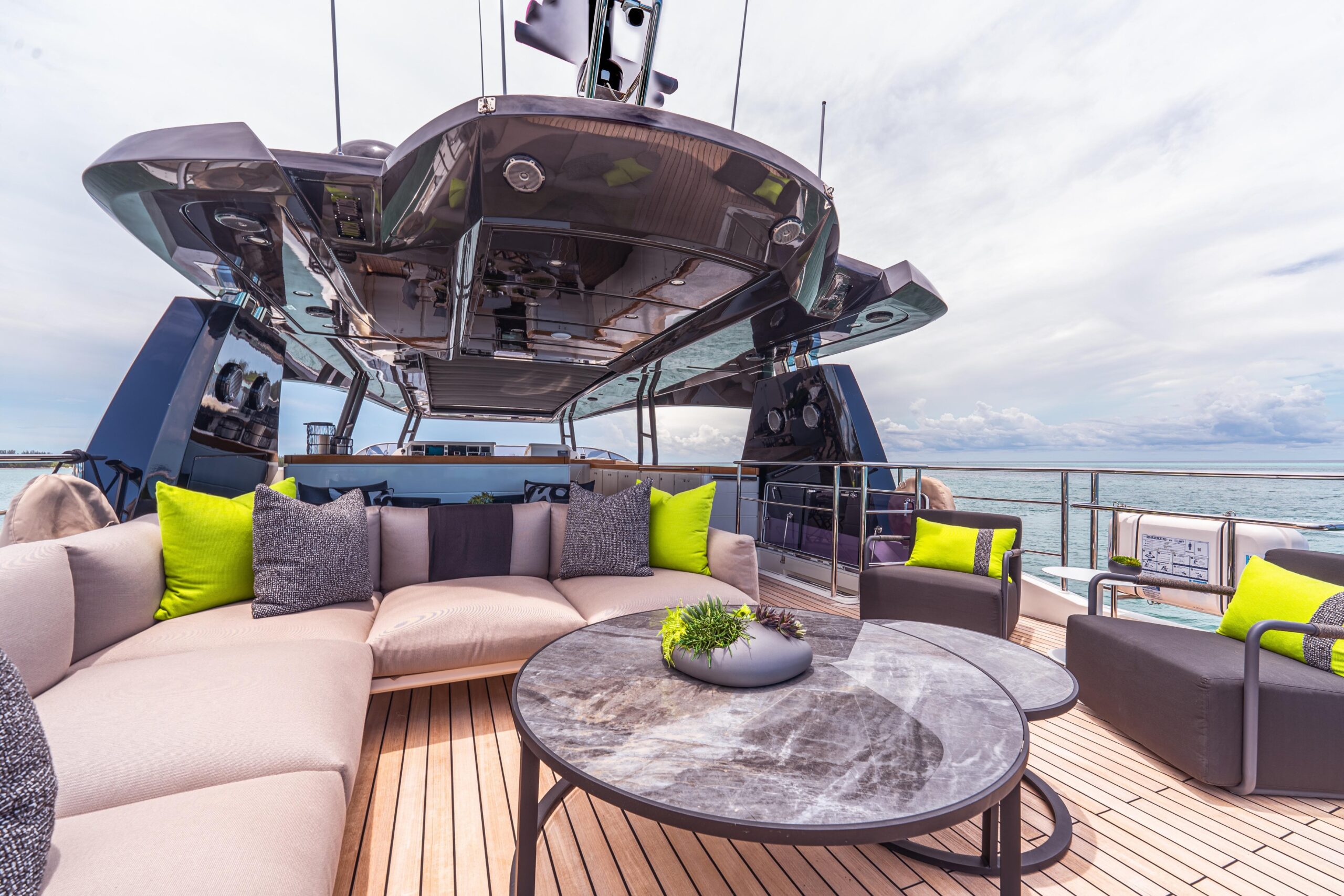 Лежаки, спинки, подушки и коктейльные столики для зоны загара в кормовой части флайбриджа