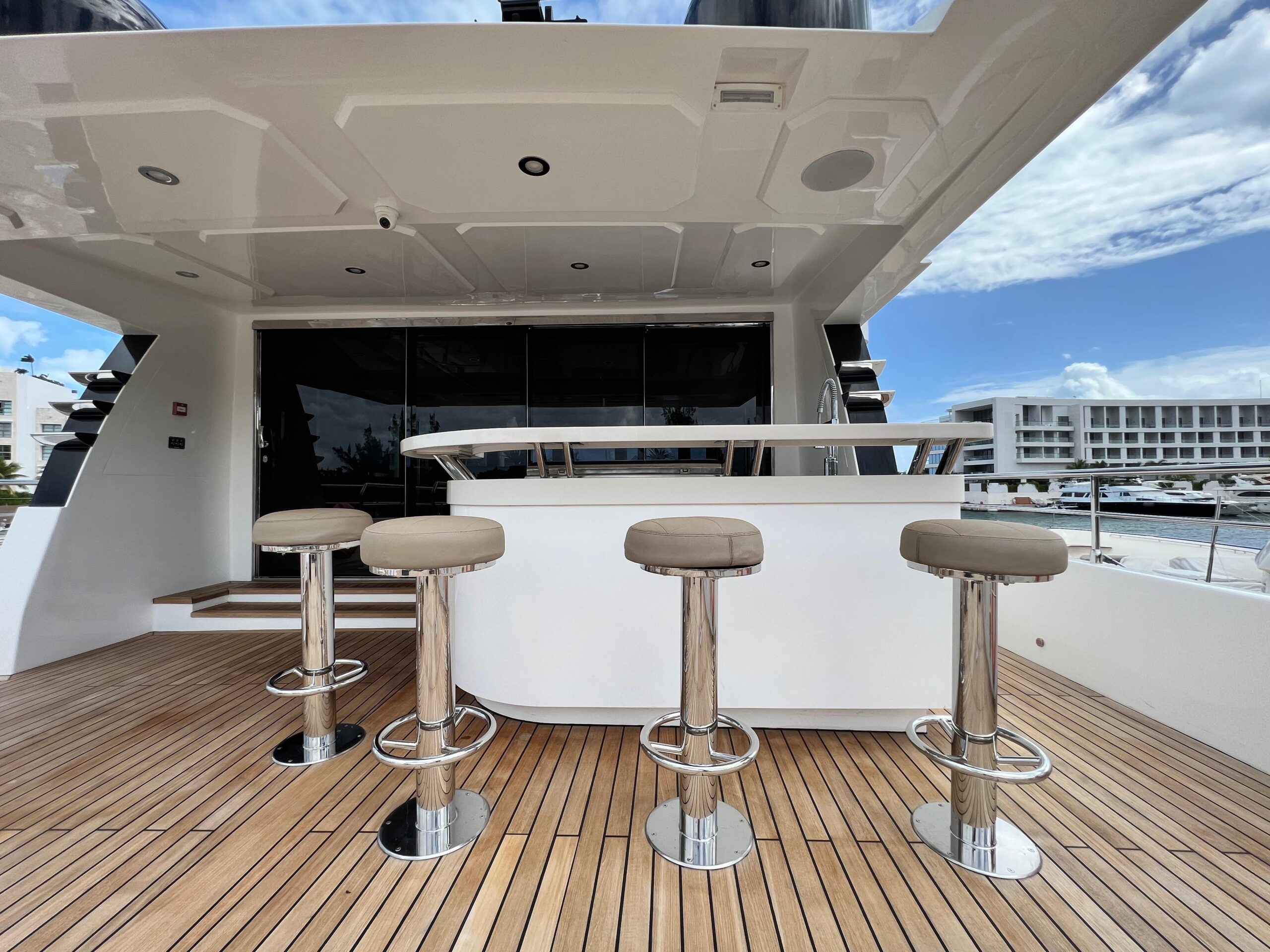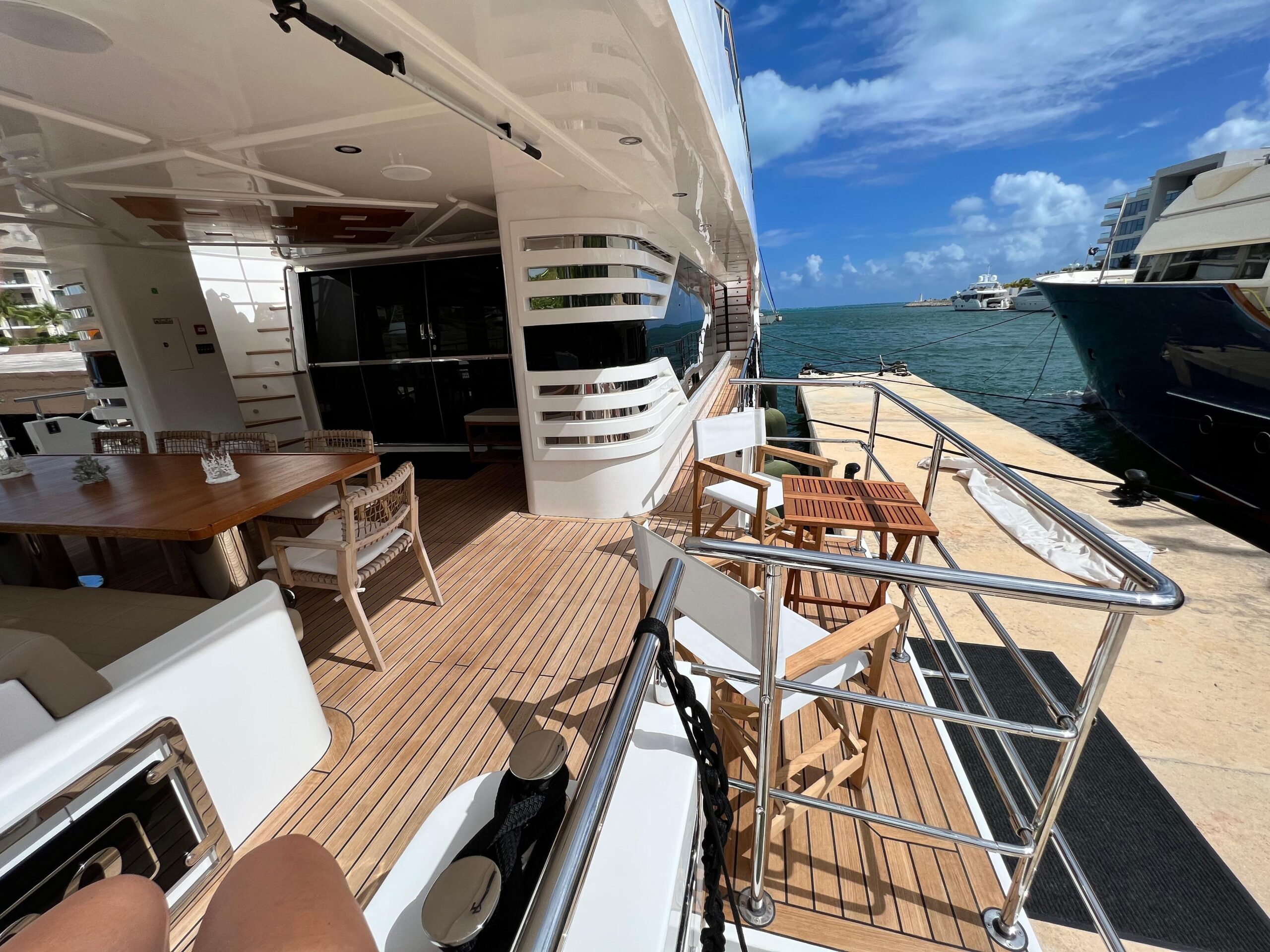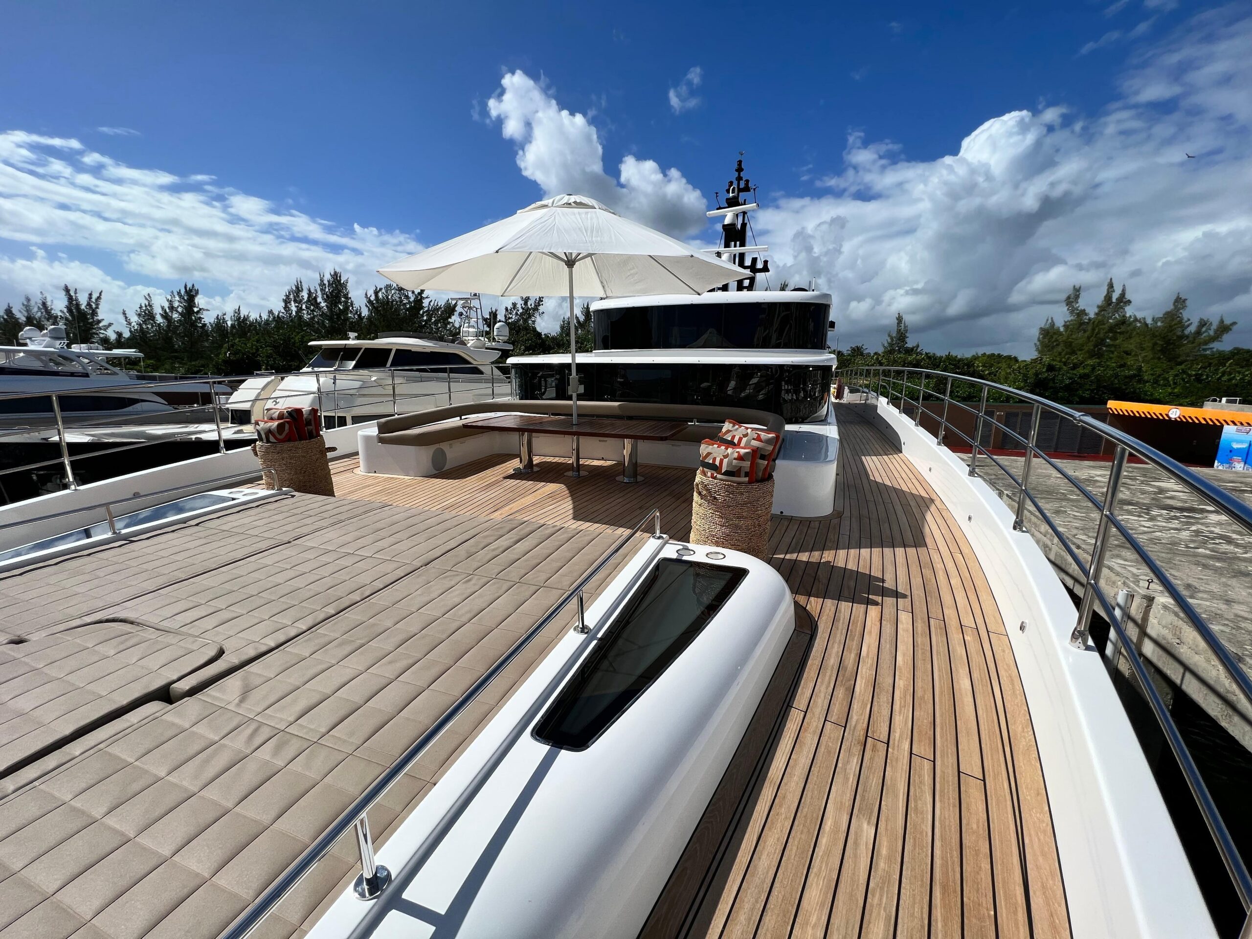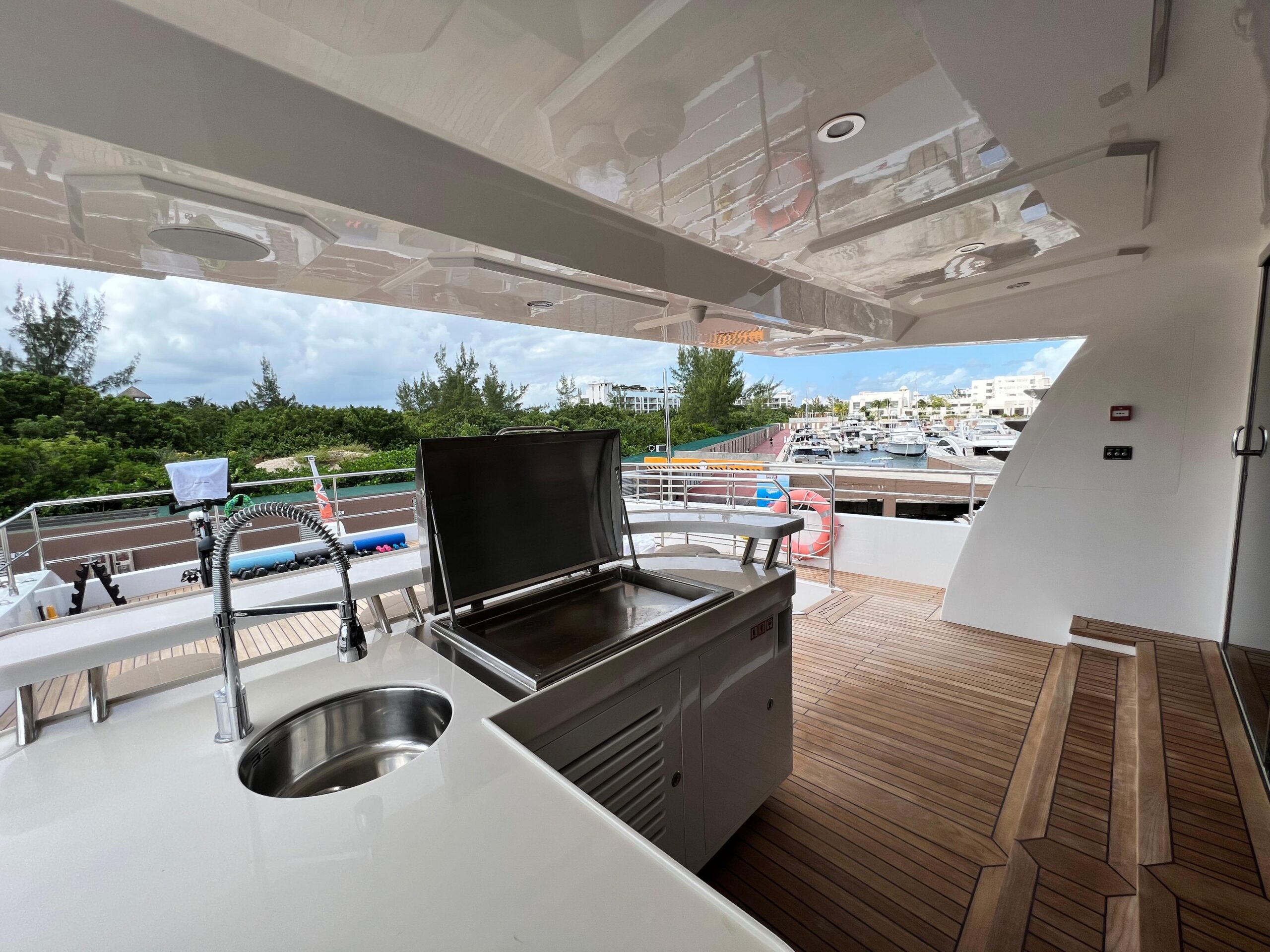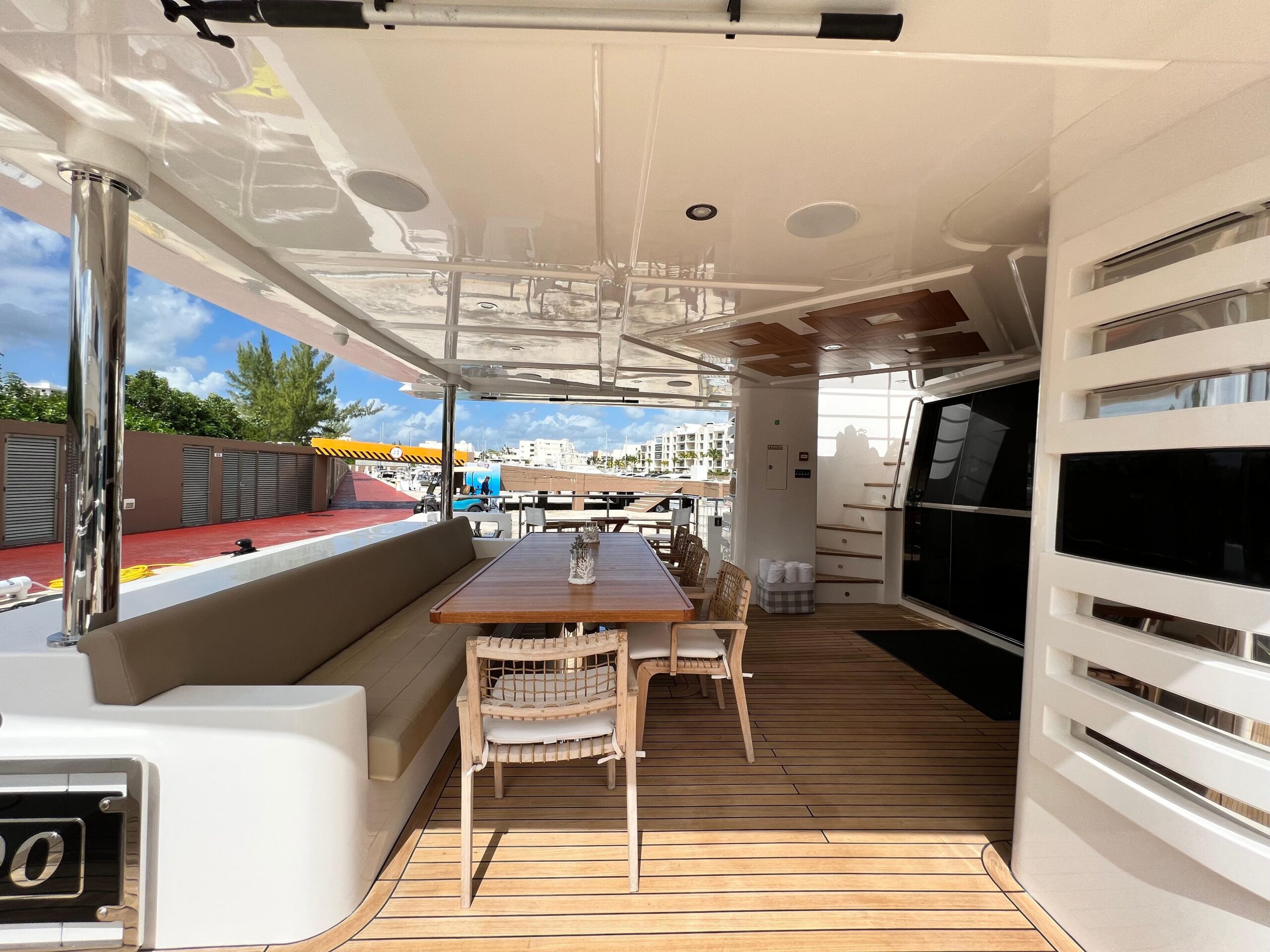 Сандек занимает почти всю длину яхты и включает бар с грилем, обеденный стол на открытом воздухе и 2 очень большие лежаки для загара с общей вместимостью до 10 гостей. Главный салон и кормовая палуба также оборудованы обеденными зонами на 12 гостей и двумя гидравлическими балконами, которые при необходимости увеличивают пространство кормовой палубы.