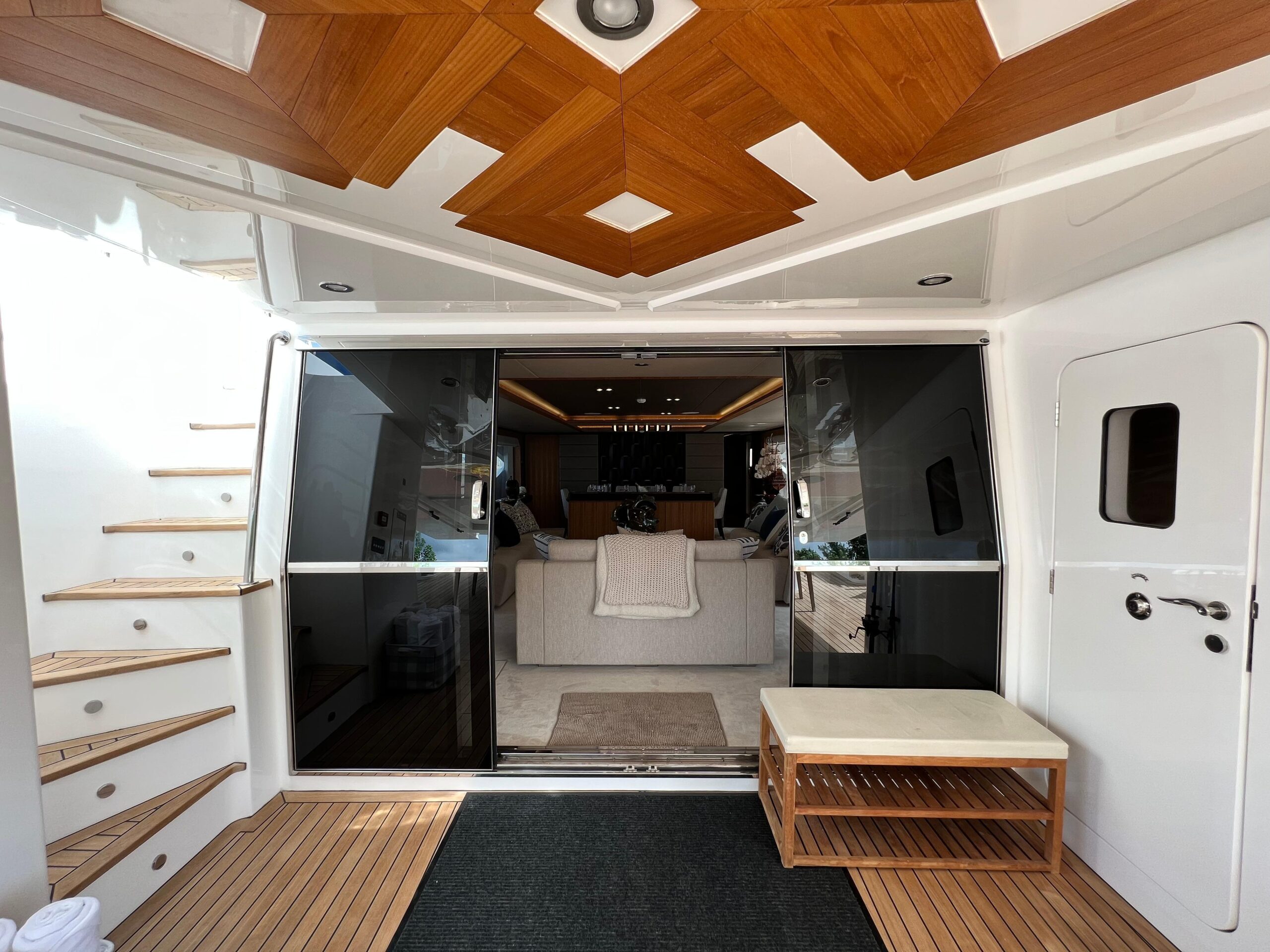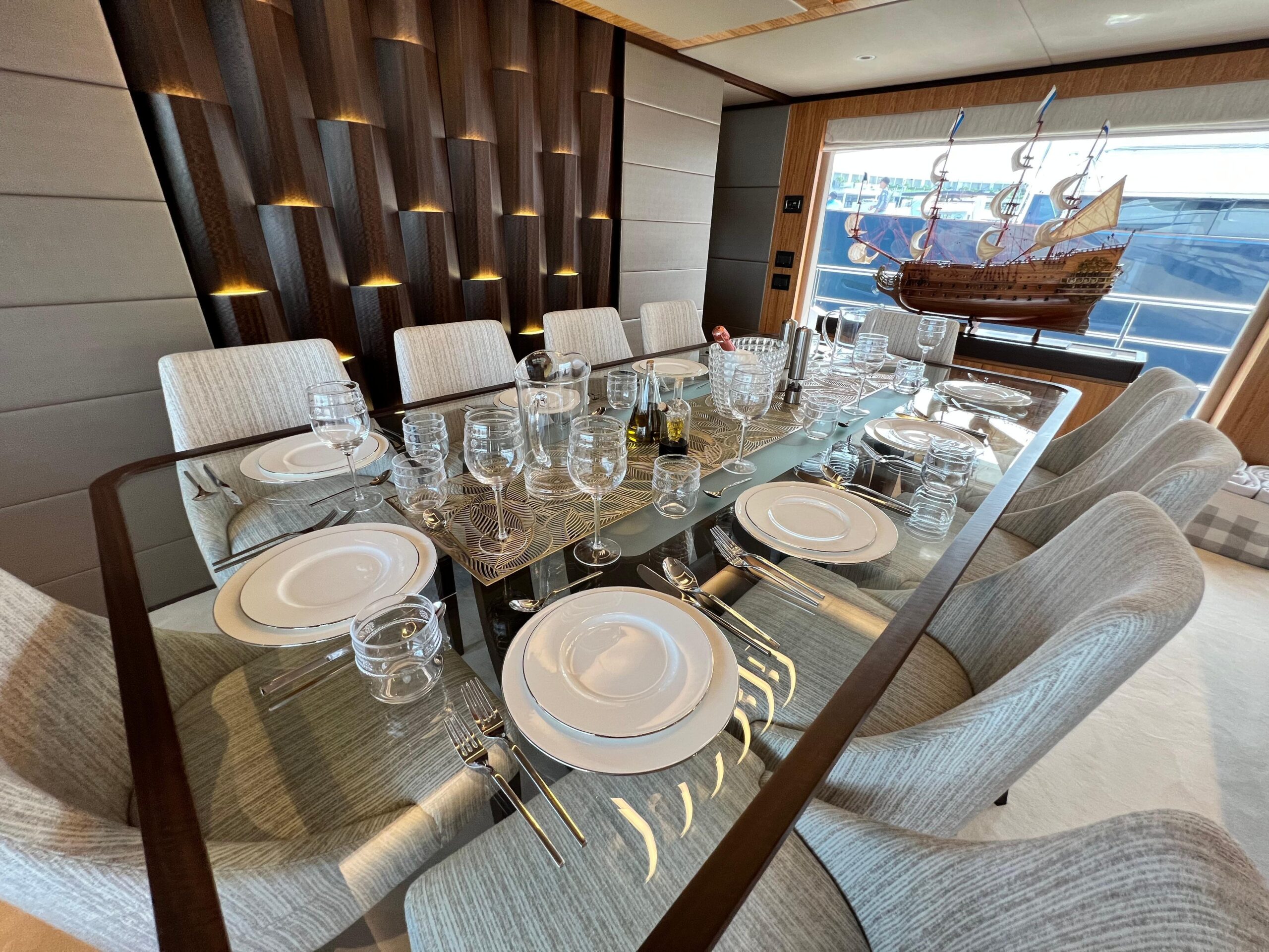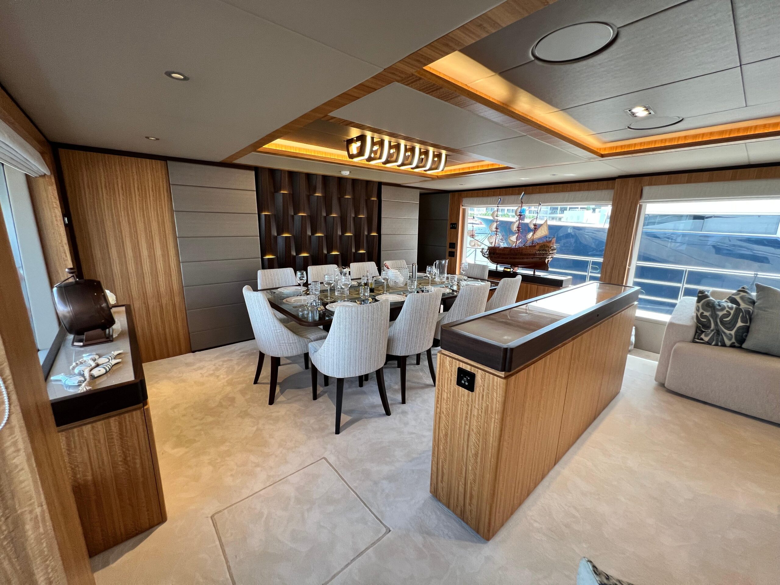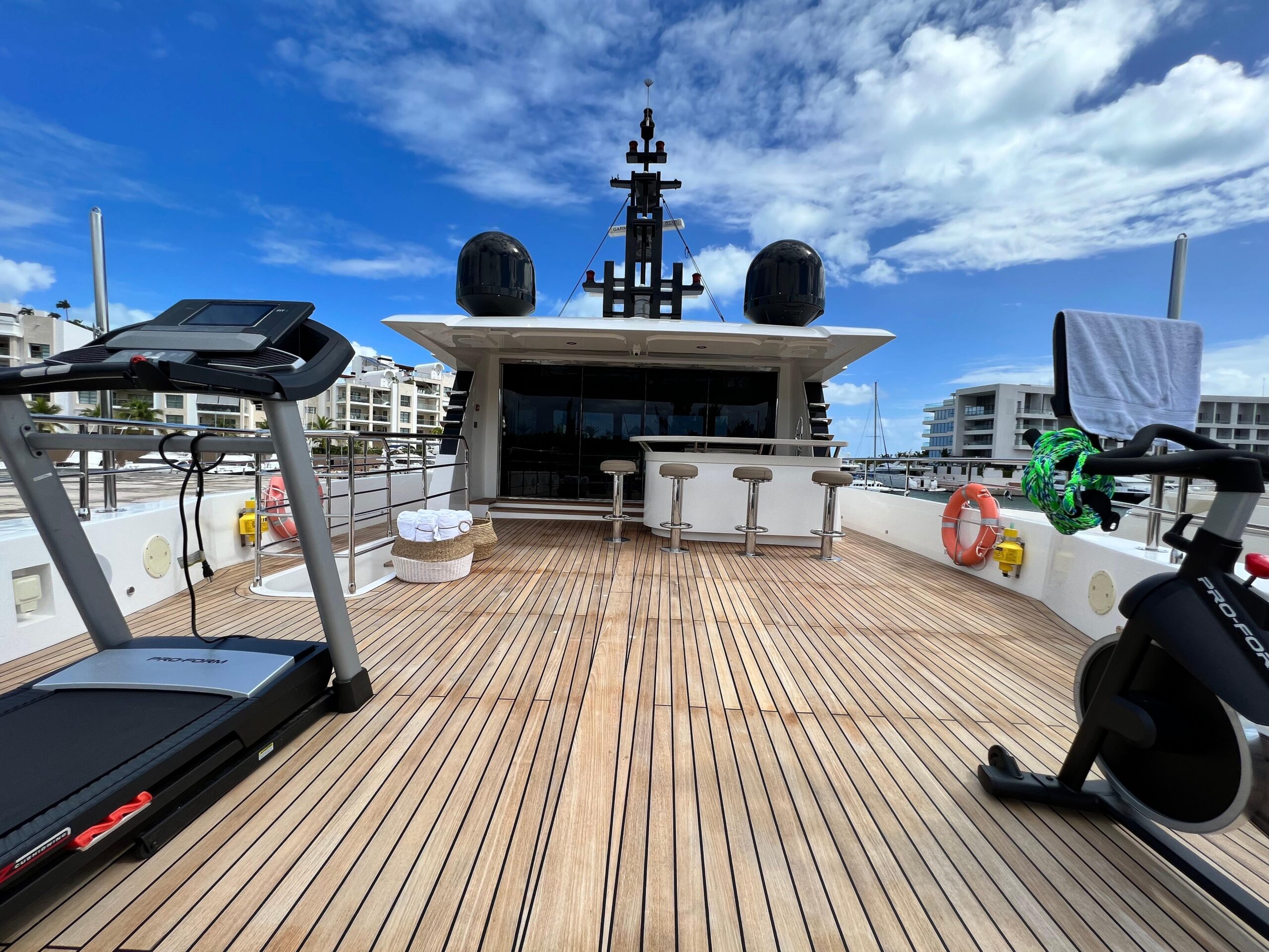 Сандек занимает почти всю длину яхты и включает бар с грилем, обеденный стол на открытом воздухе и 2 очень большие лежаки для загара с общей вместимостью до 10 гостей. Главный салон и кормовая палуба также оборудованы обеденными зонами на 12 гостей и двумя гидравлическими балконами, которые при необходимости увеличивают пространство кормовой палубы.