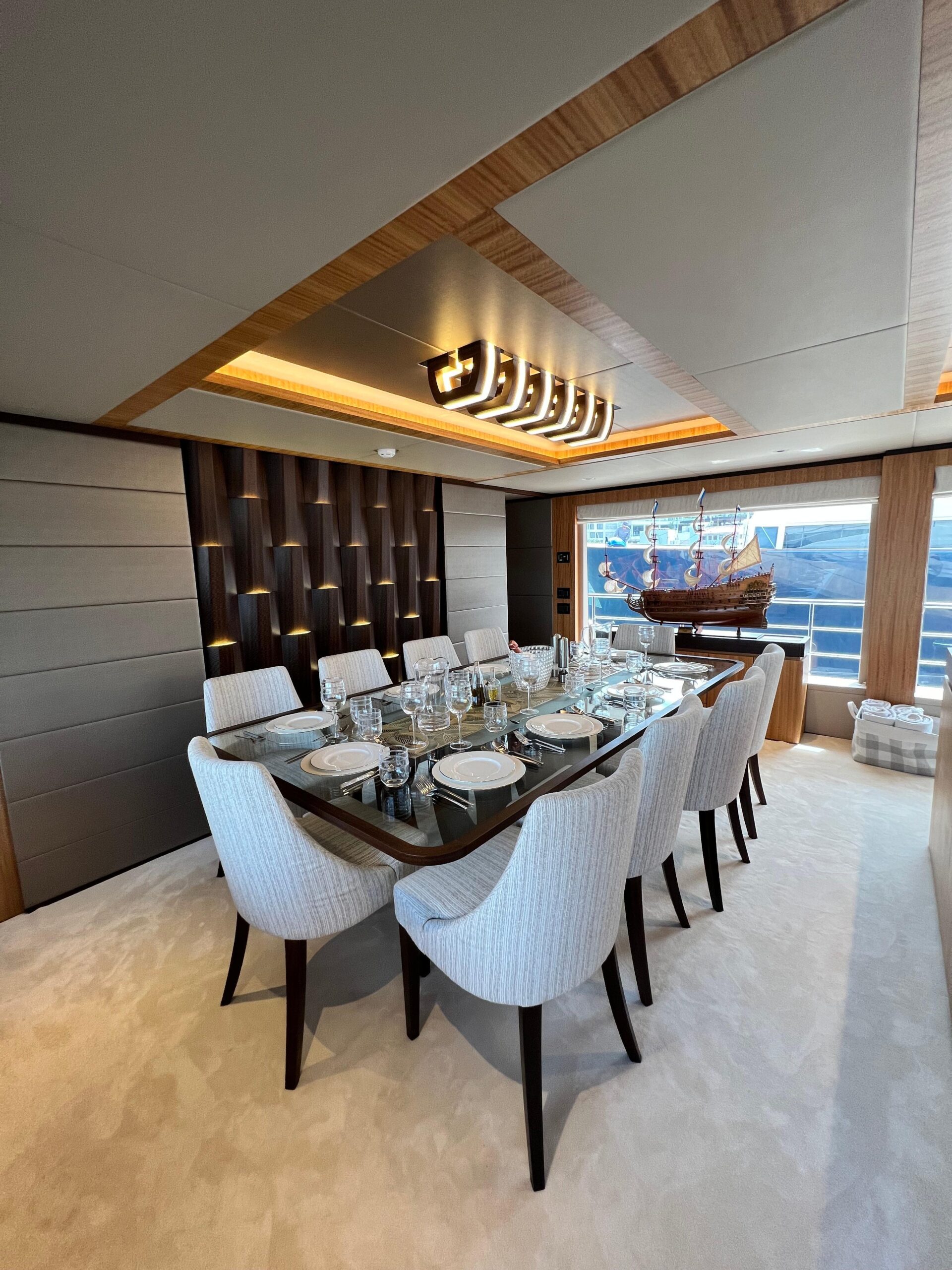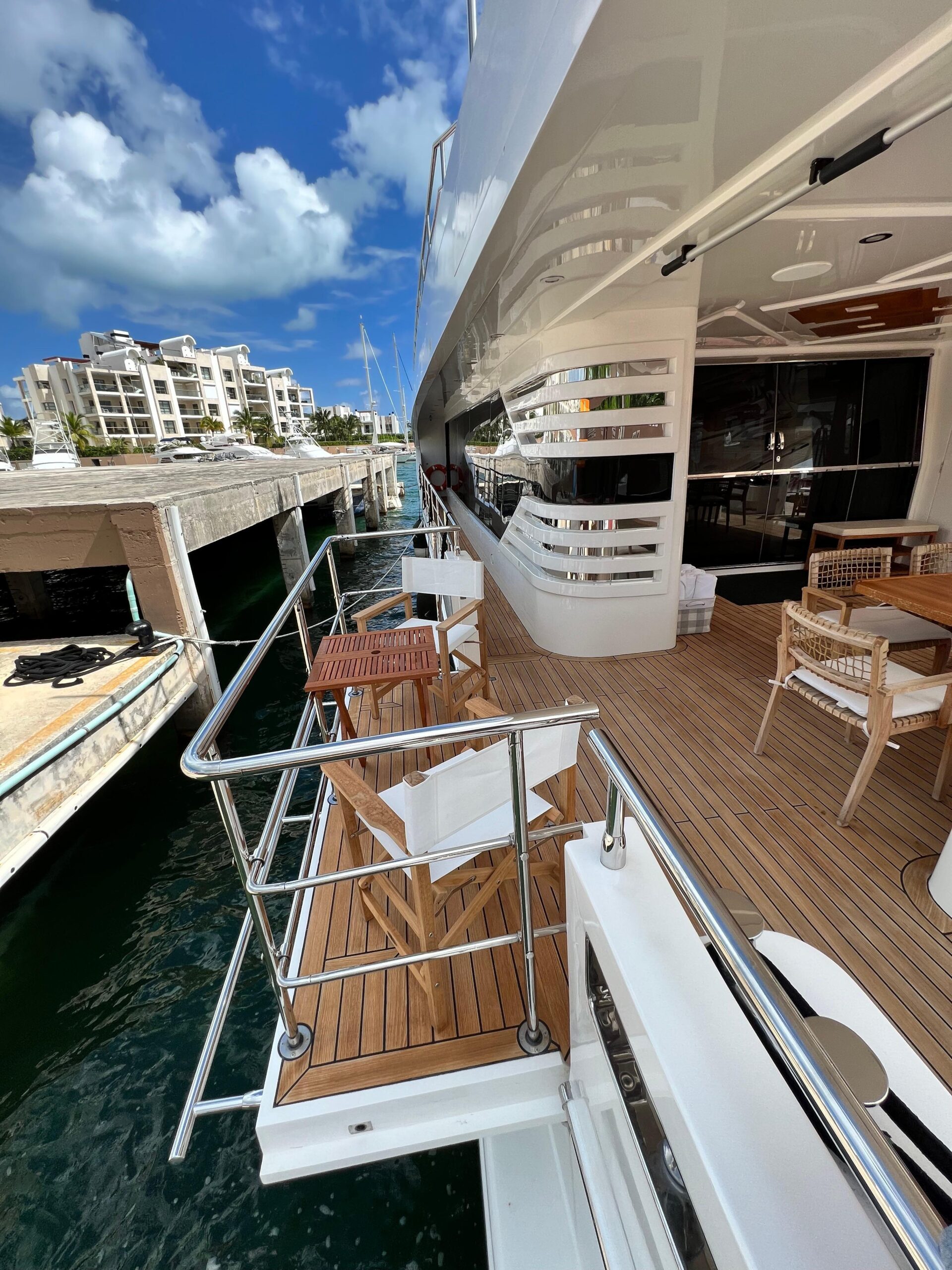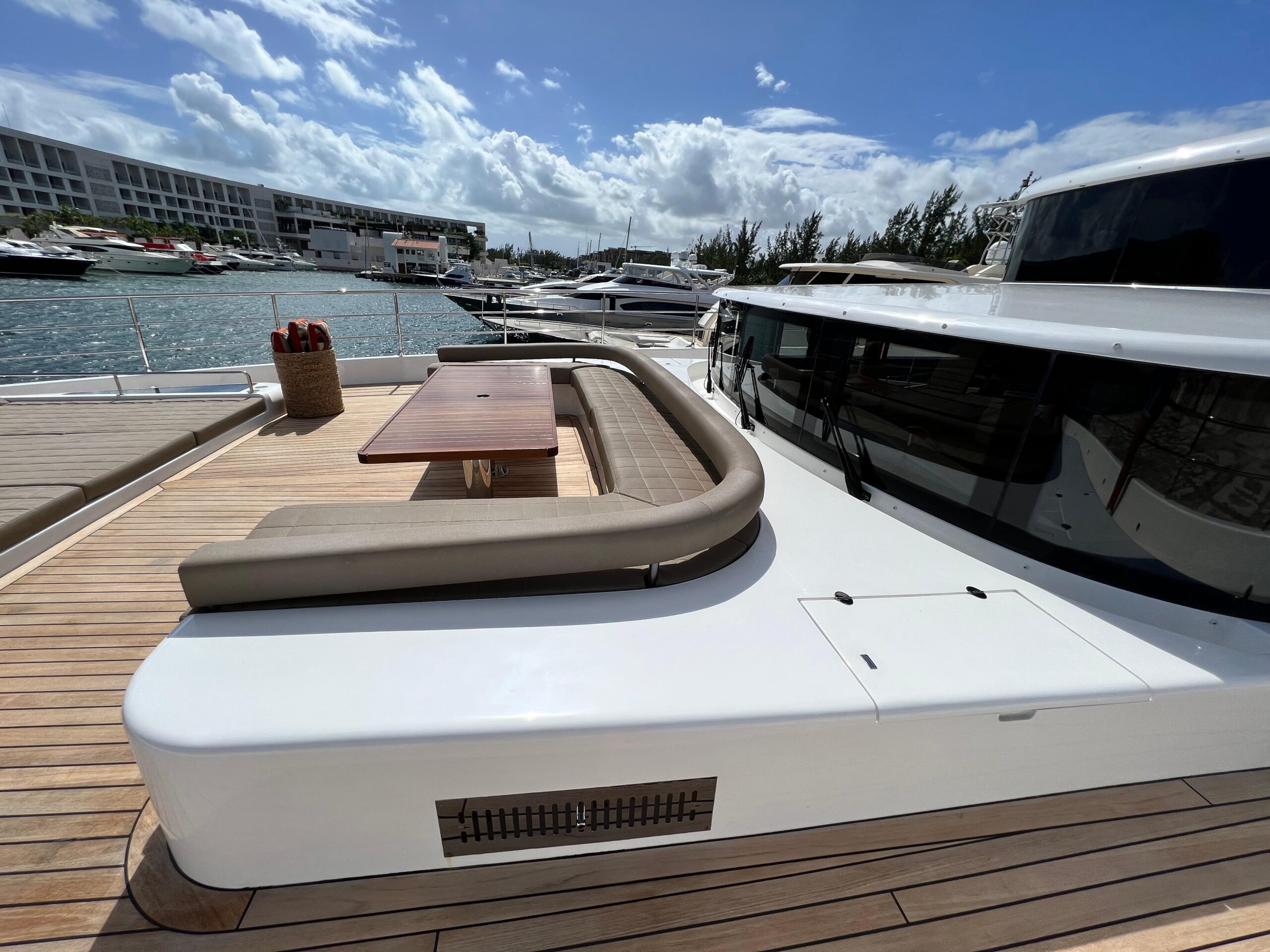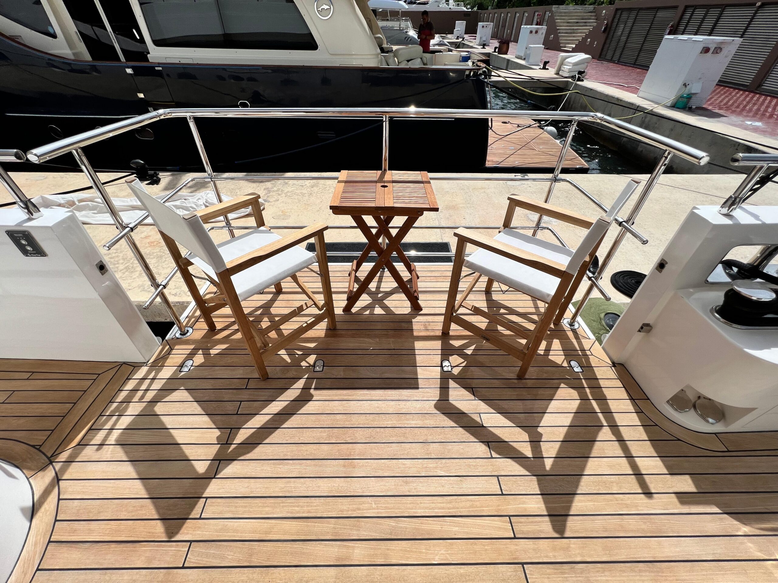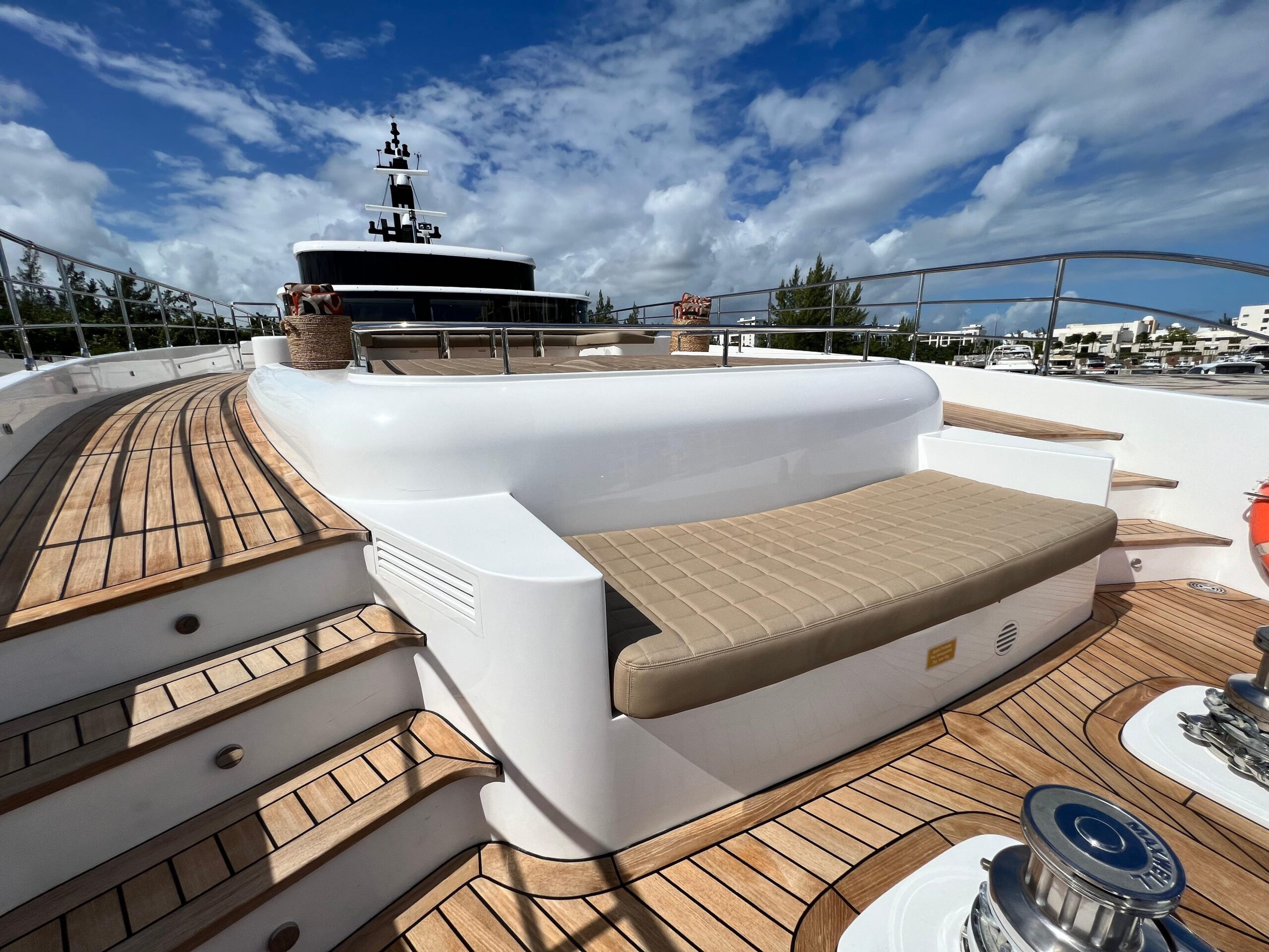 Сандек занимает почти всю длину яхты и включает бар с грилем, обеденный стол на открытом воздухе и 2 очень большие лежаки для загара с общей вместимостью до 10 гостей. Главный салон и кормовая палуба также оборудованы обеденными зонами на 12 гостей и двумя гидравлическими балконами, которые при необходимости увеличивают пространство кормовой палубы.