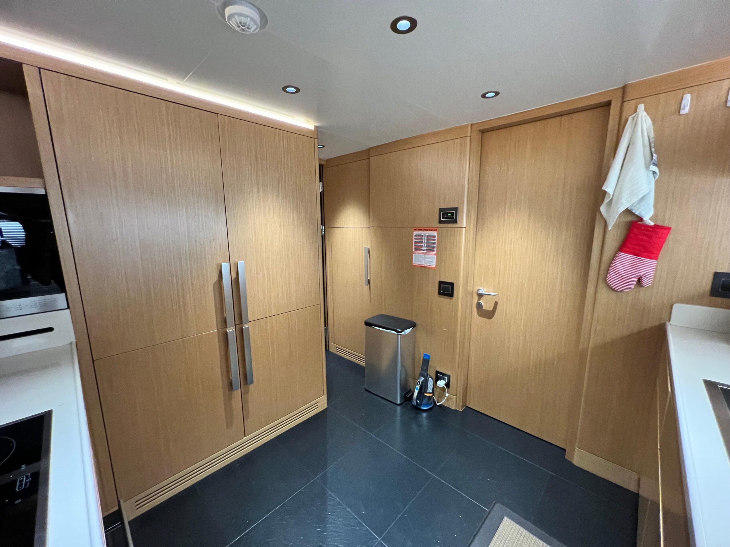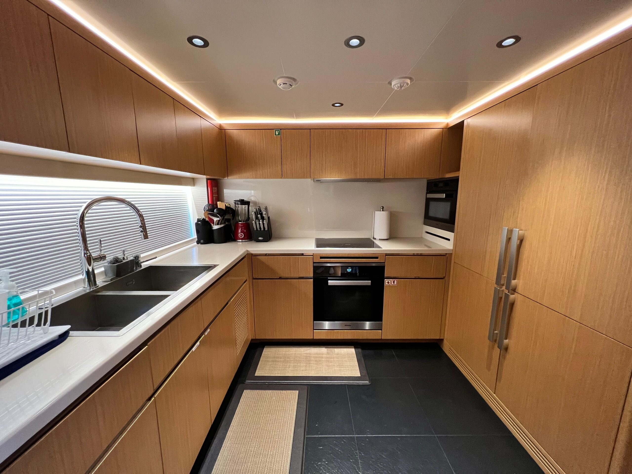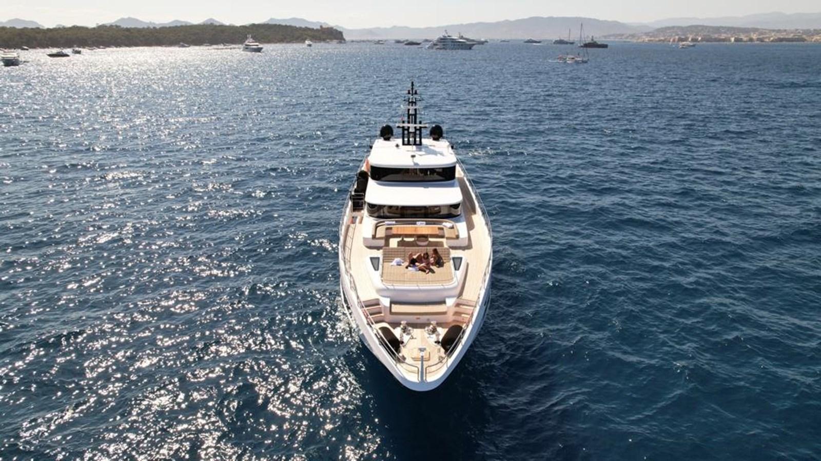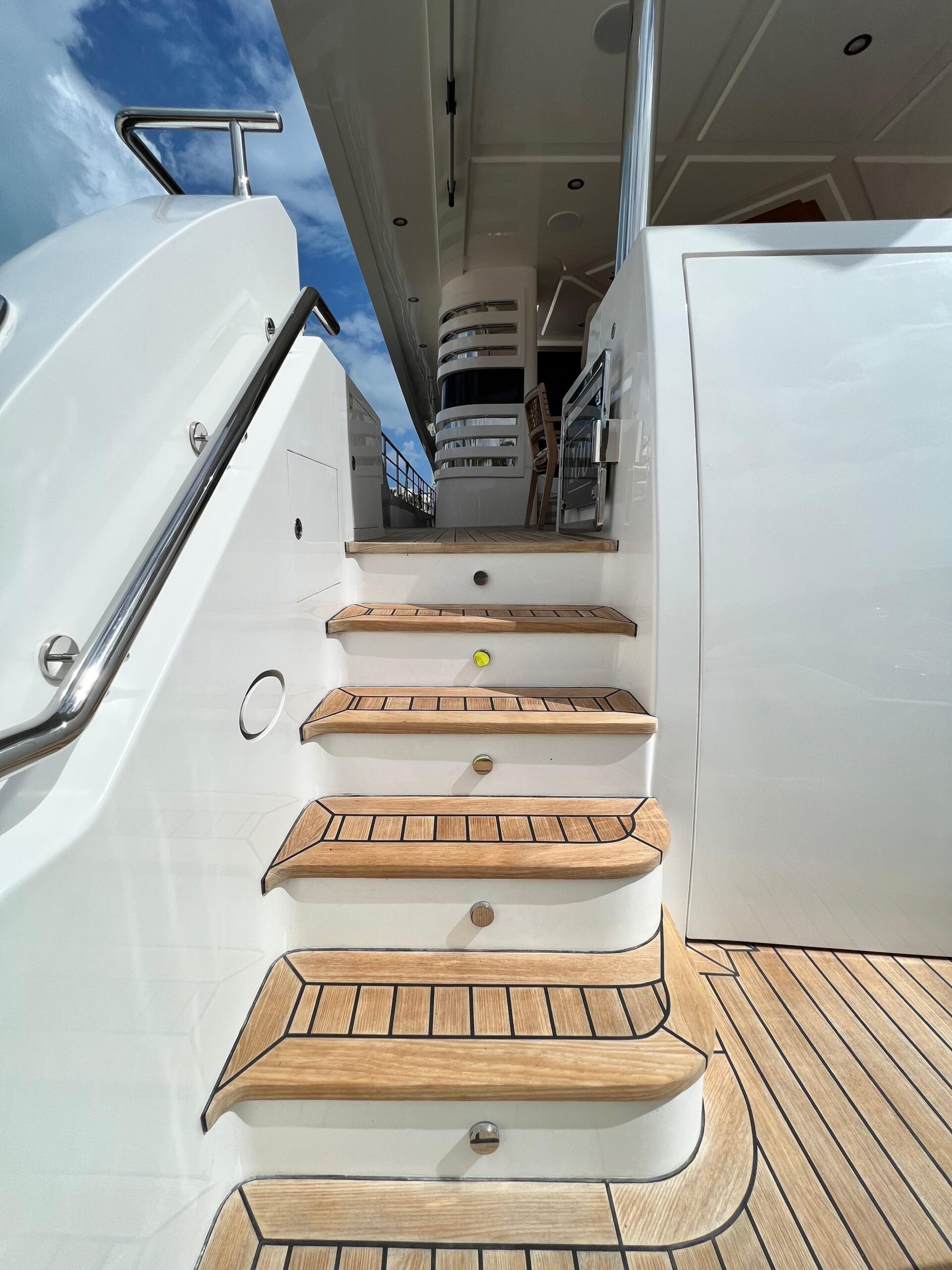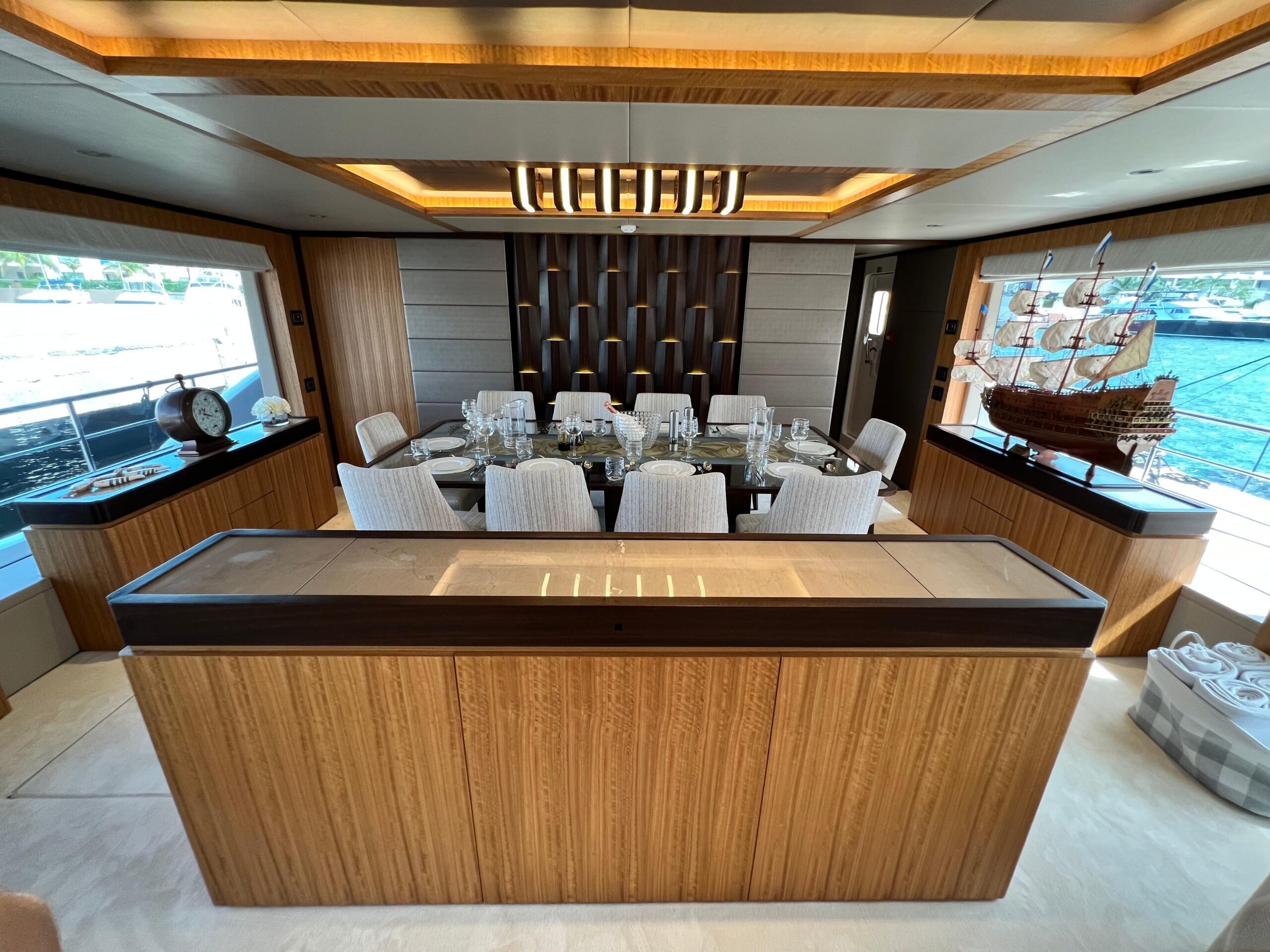 Сандек занимает почти всю длину яхты и включает бар с грилем, обеденный стол на открытом воздухе и 2 очень большие лежаки для загара с общей вместимостью до 10 гостей. Главный салон и кормовая палуба также оборудованы обеденными зонами на 12 гостей и двумя гидравлическими балконами, которые при необходимости увеличивают пространство кормовой палубы.