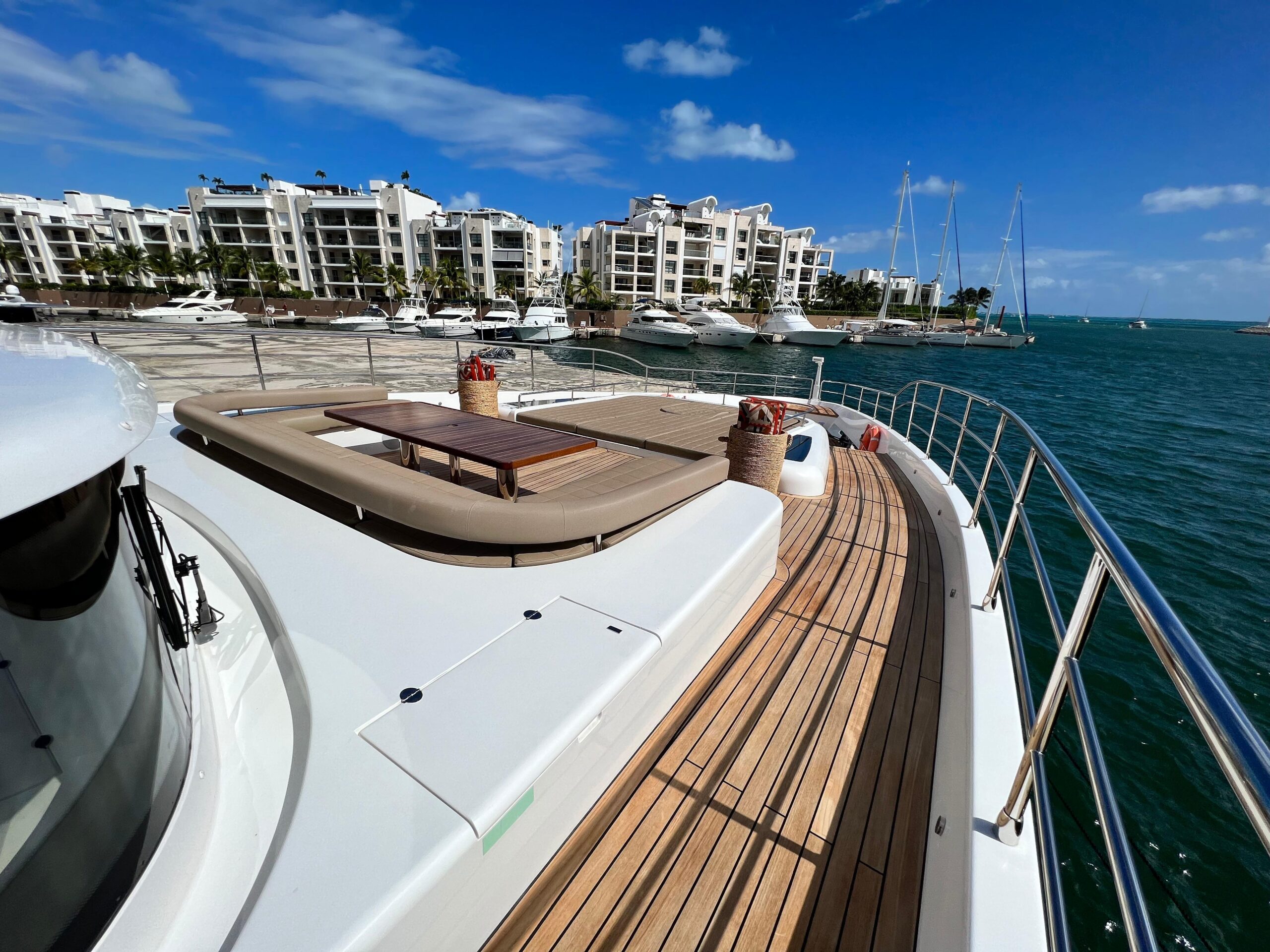 Сандек занимает почти всю длину яхты и включает бар с BBQ, обеденный стол на открытом воздухе и 2 очень больших лежака для загара, рассчитанных в общей сложности на 10 гостей. Главный салон и кормовая палуба также предлагают обеденные зоны для 12 гостей и 2 гидравлических балкона, увеличивающих пространство кормовой палубы по требованию.