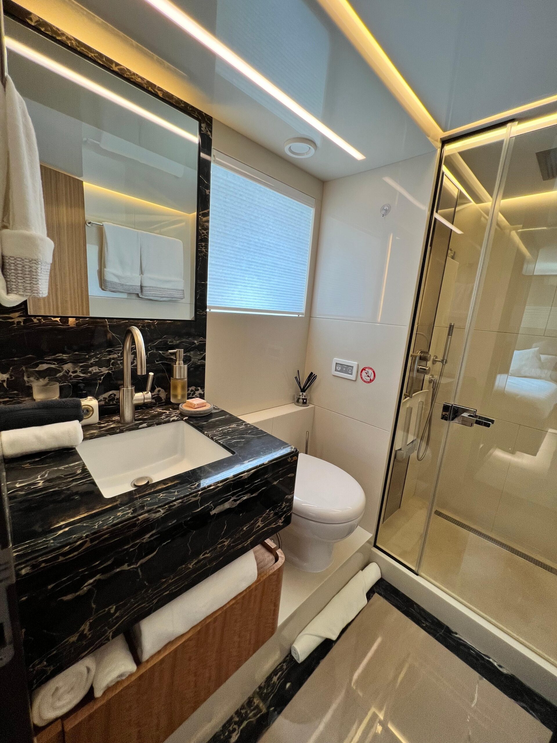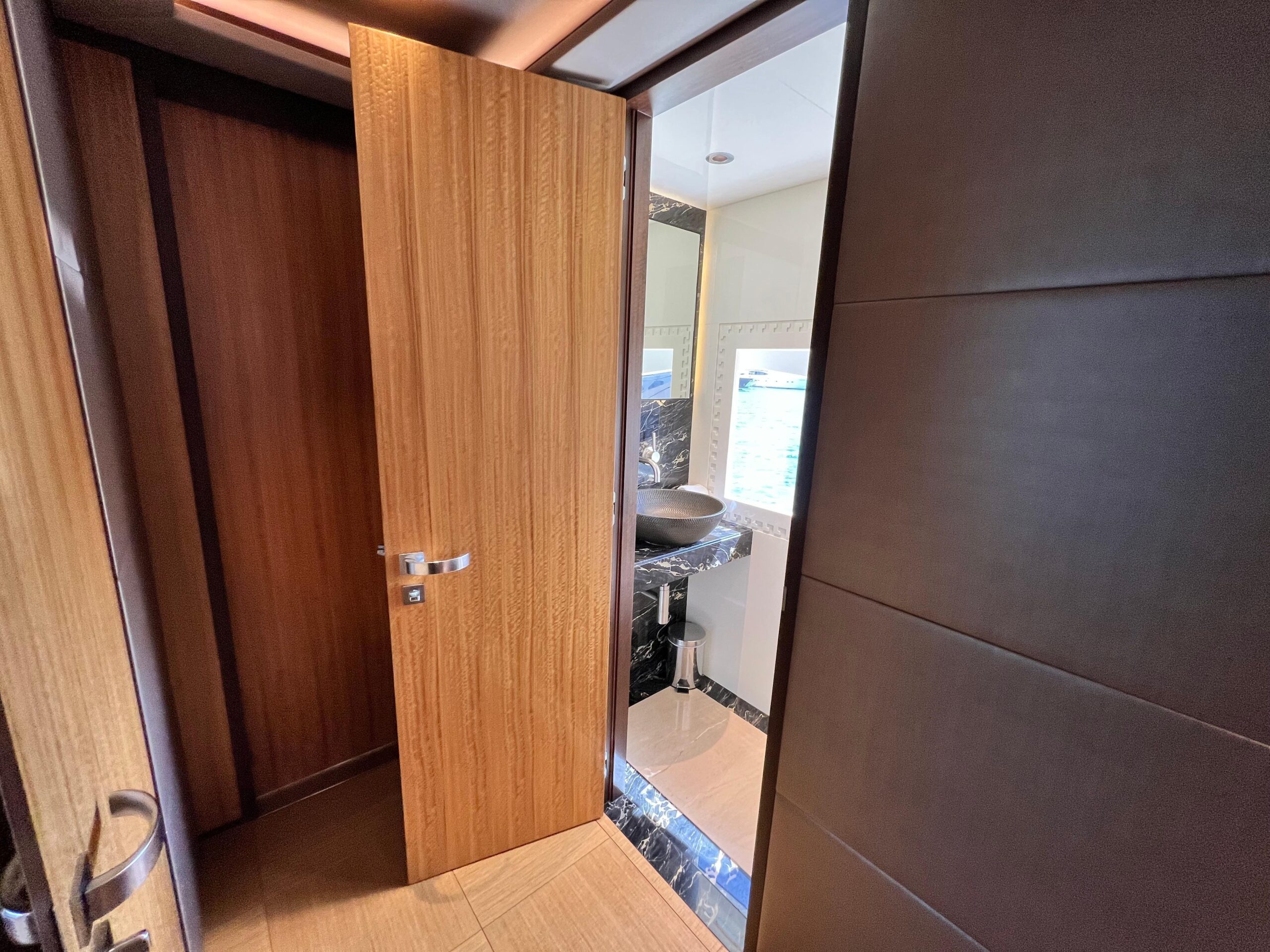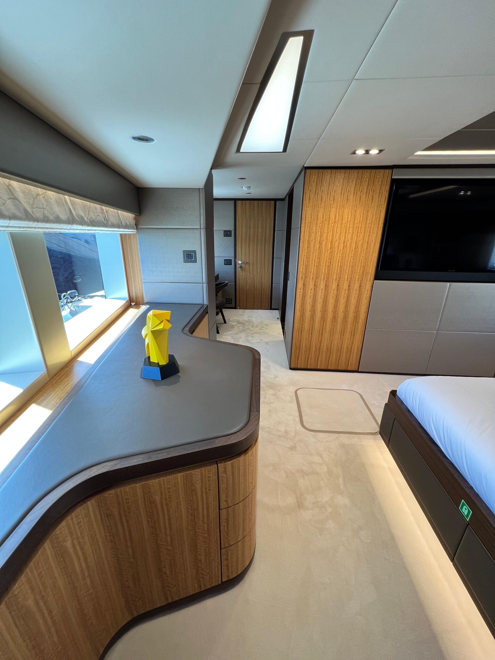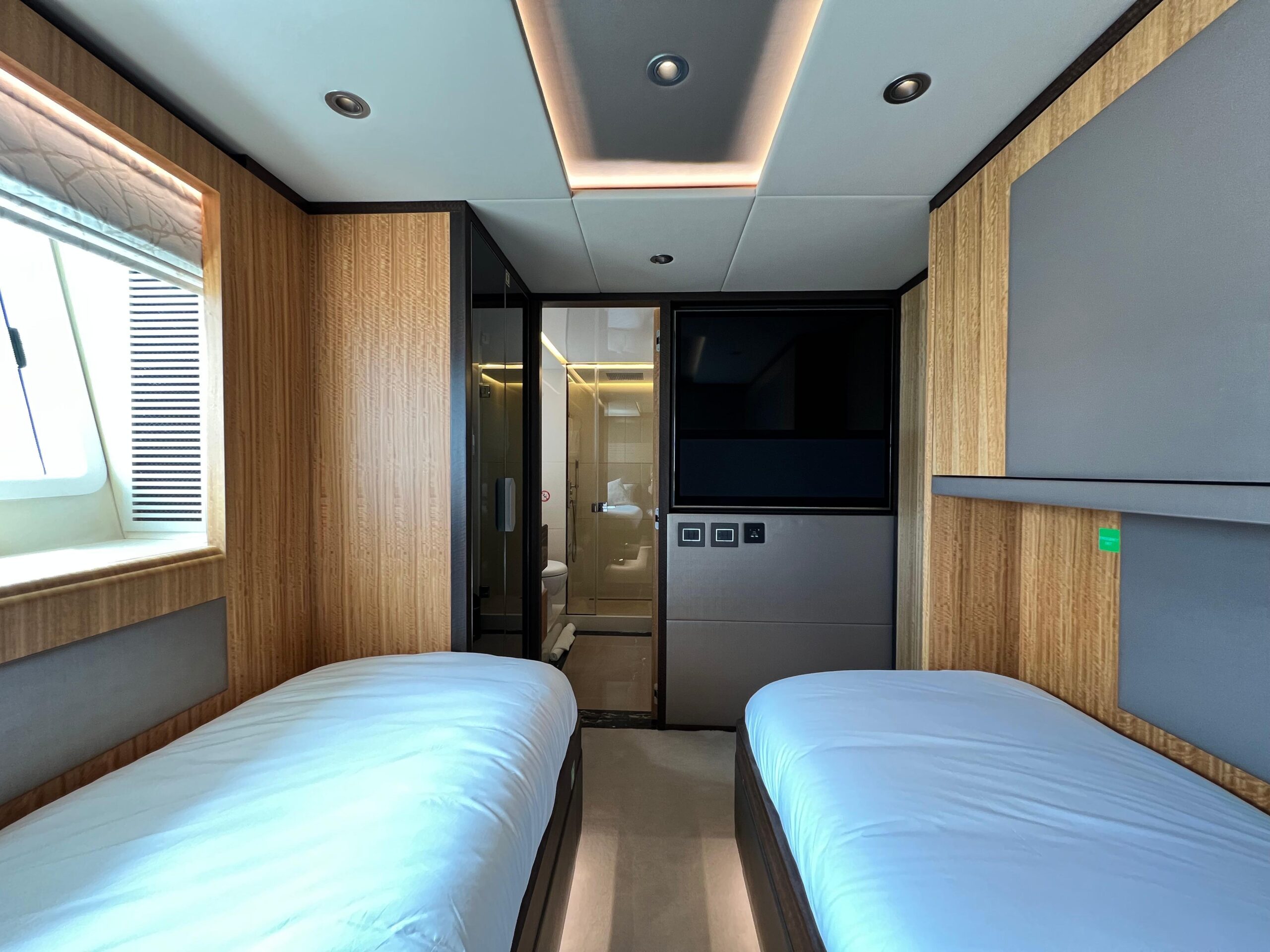 Яхта может разместить до 12 гостей в пяти роскошных и просторных каютах, включая мастер-каюту во всю ширину корпуса на главной палубе, 2 VIP-каюты с двуспальными кроватями и 2 двухместные каюты с дополнительными кроватями Pullman на нижней палубе.