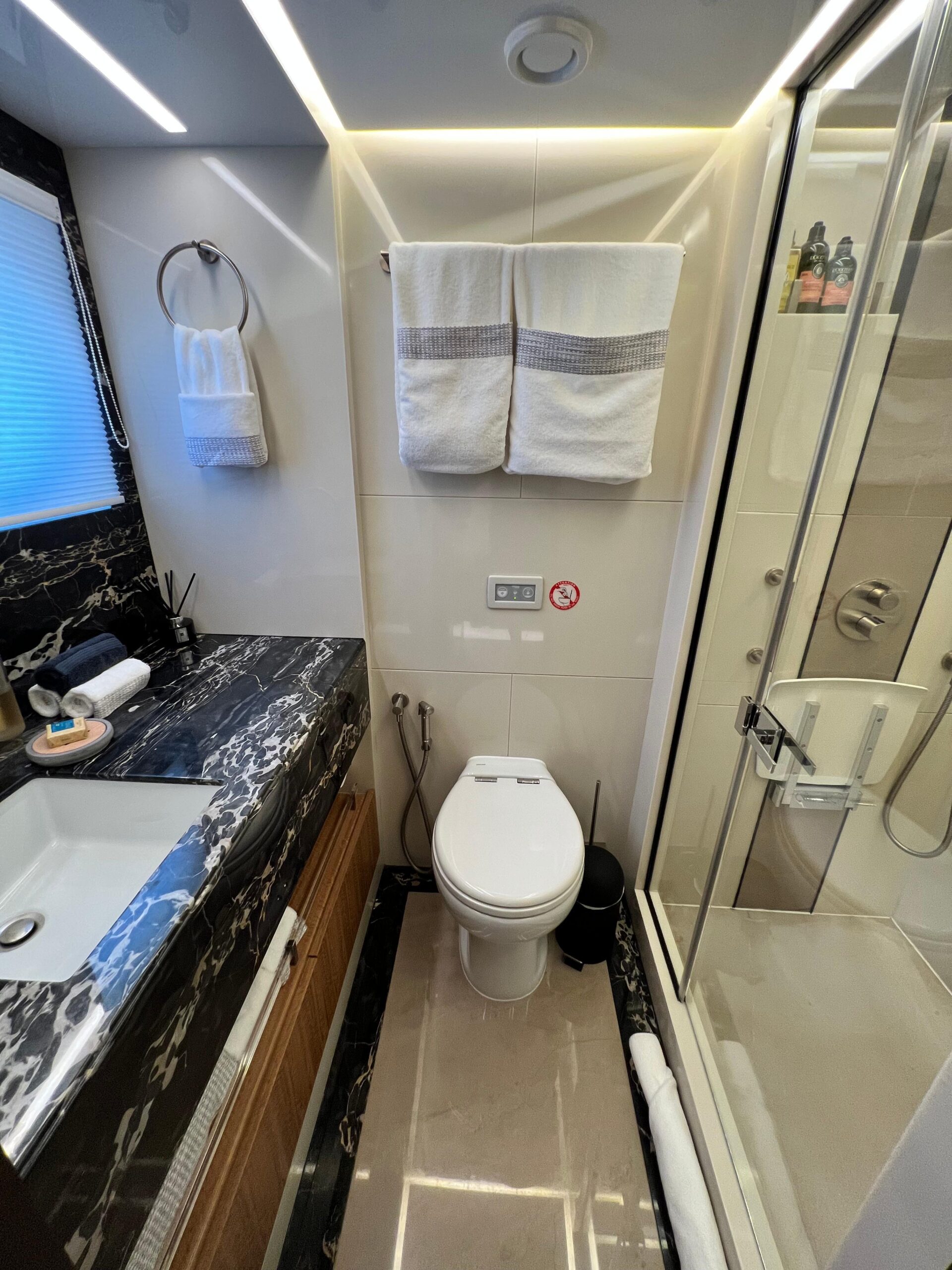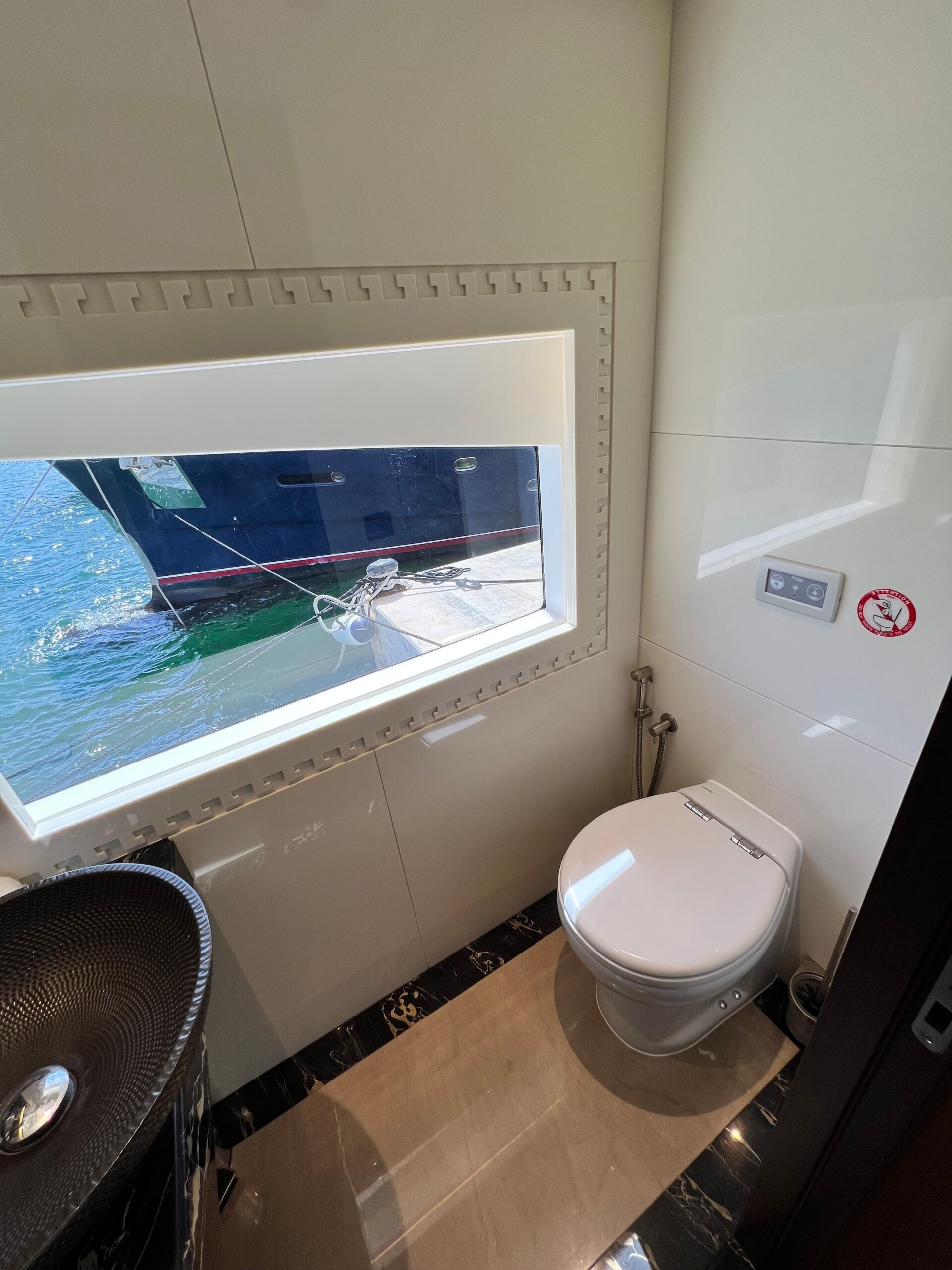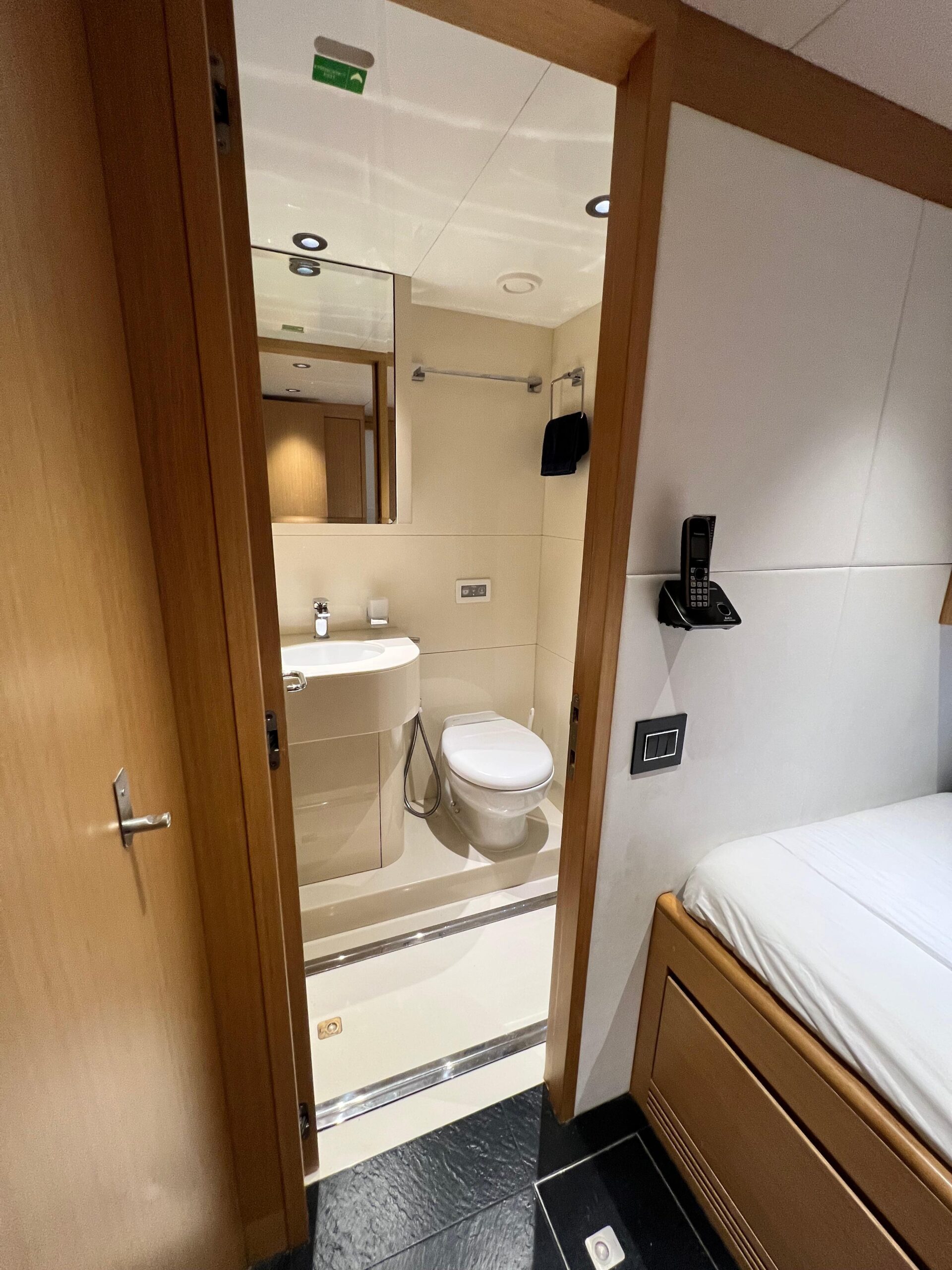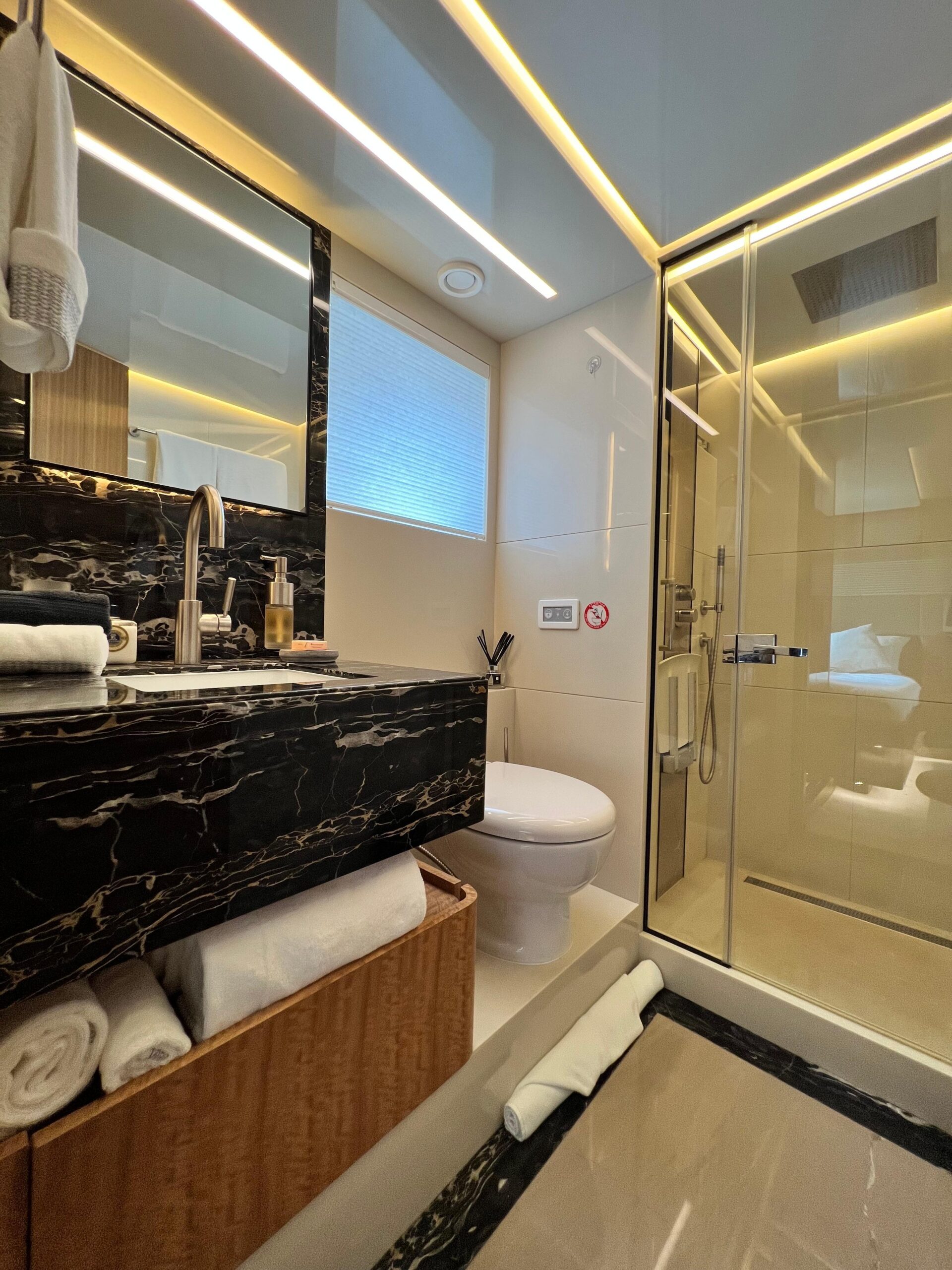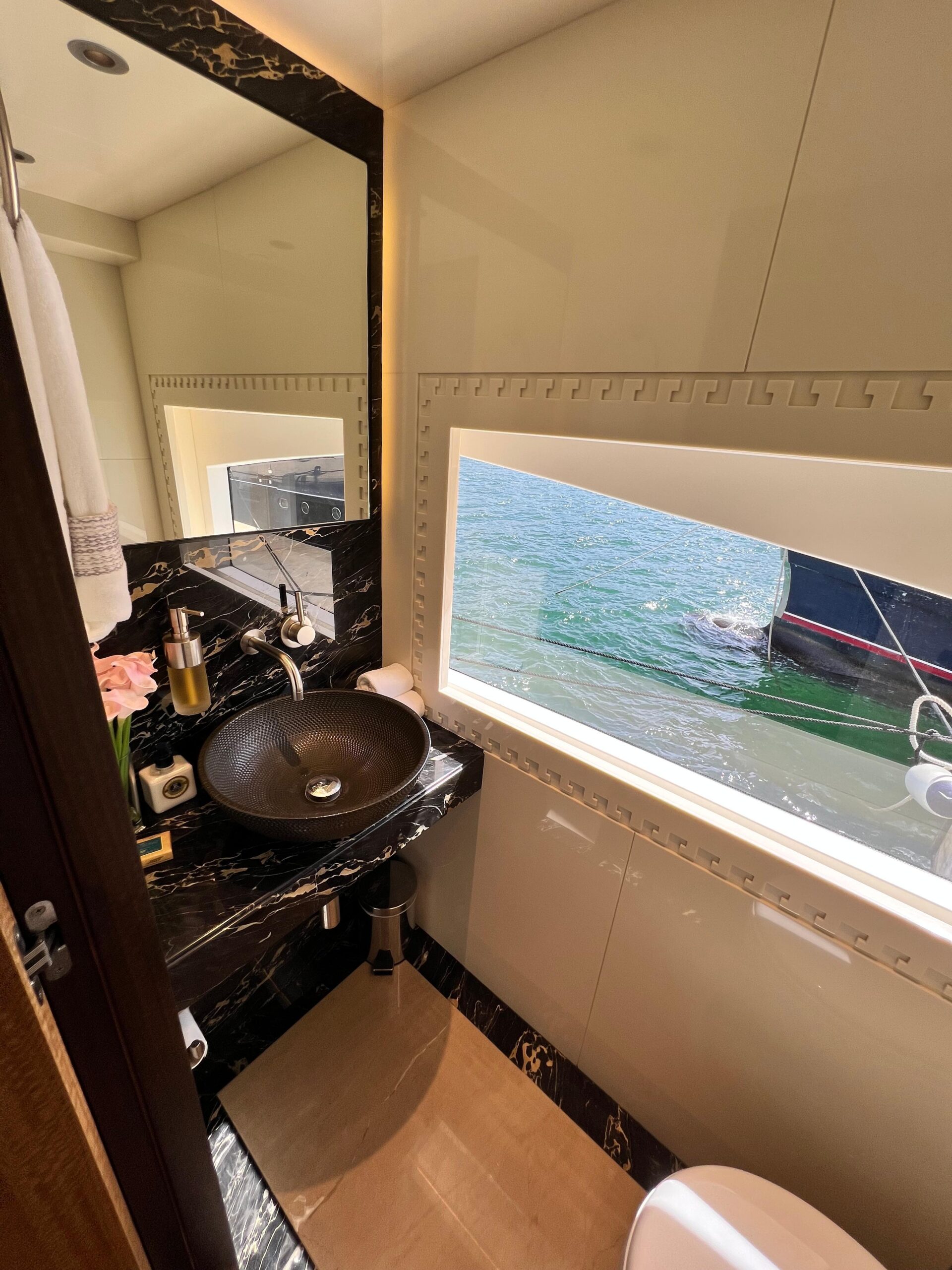 Яхта может разместить до 12 гостей в пяти роскошных и просторных каютах, включая мастер-каюту во всю ширину корпуса на главной палубе, 2 VIP-каюты с двуспальными кроватями и 2 двухместные каюты с дополнительными кроватями Pullman на нижней палубе.