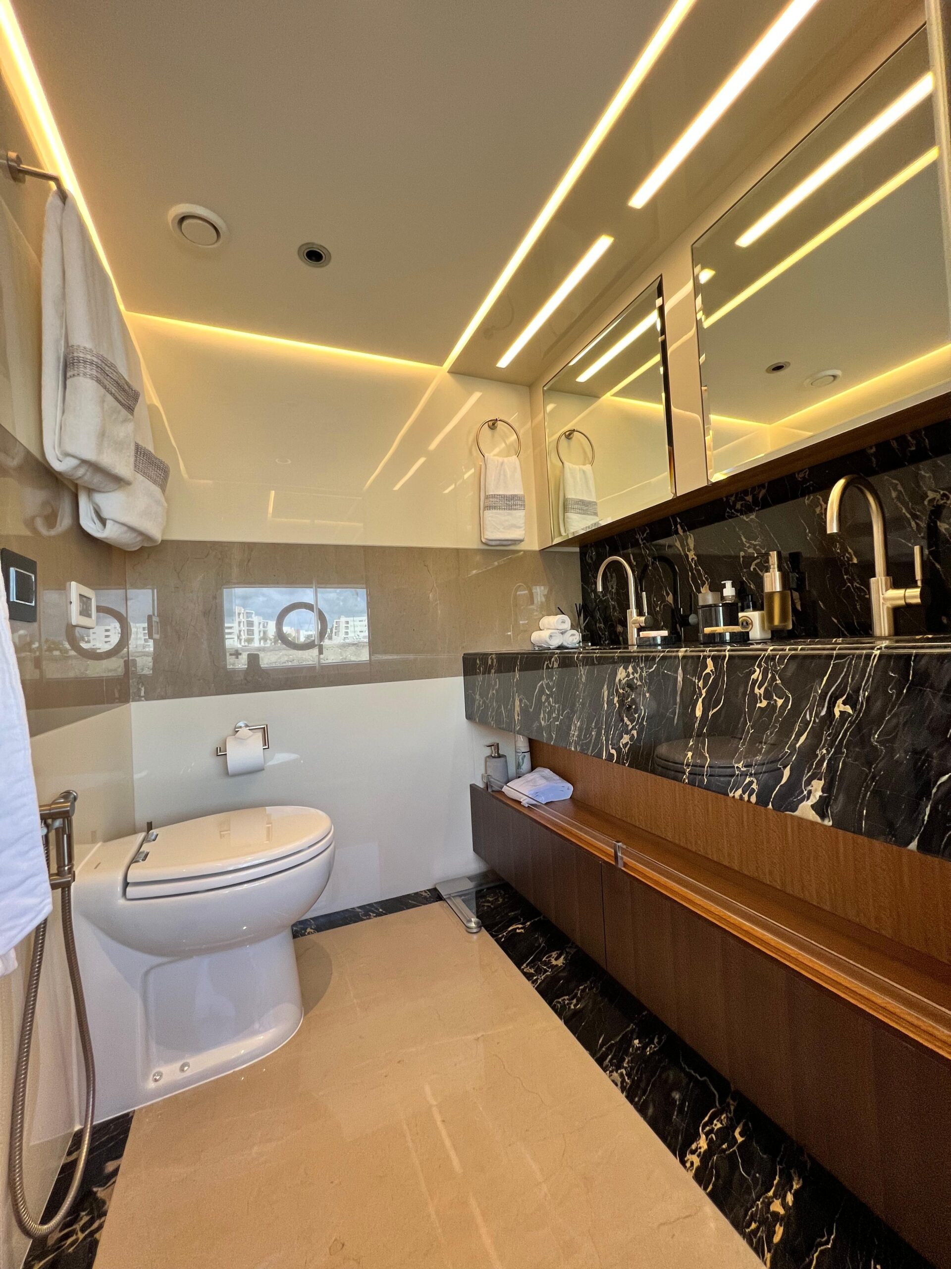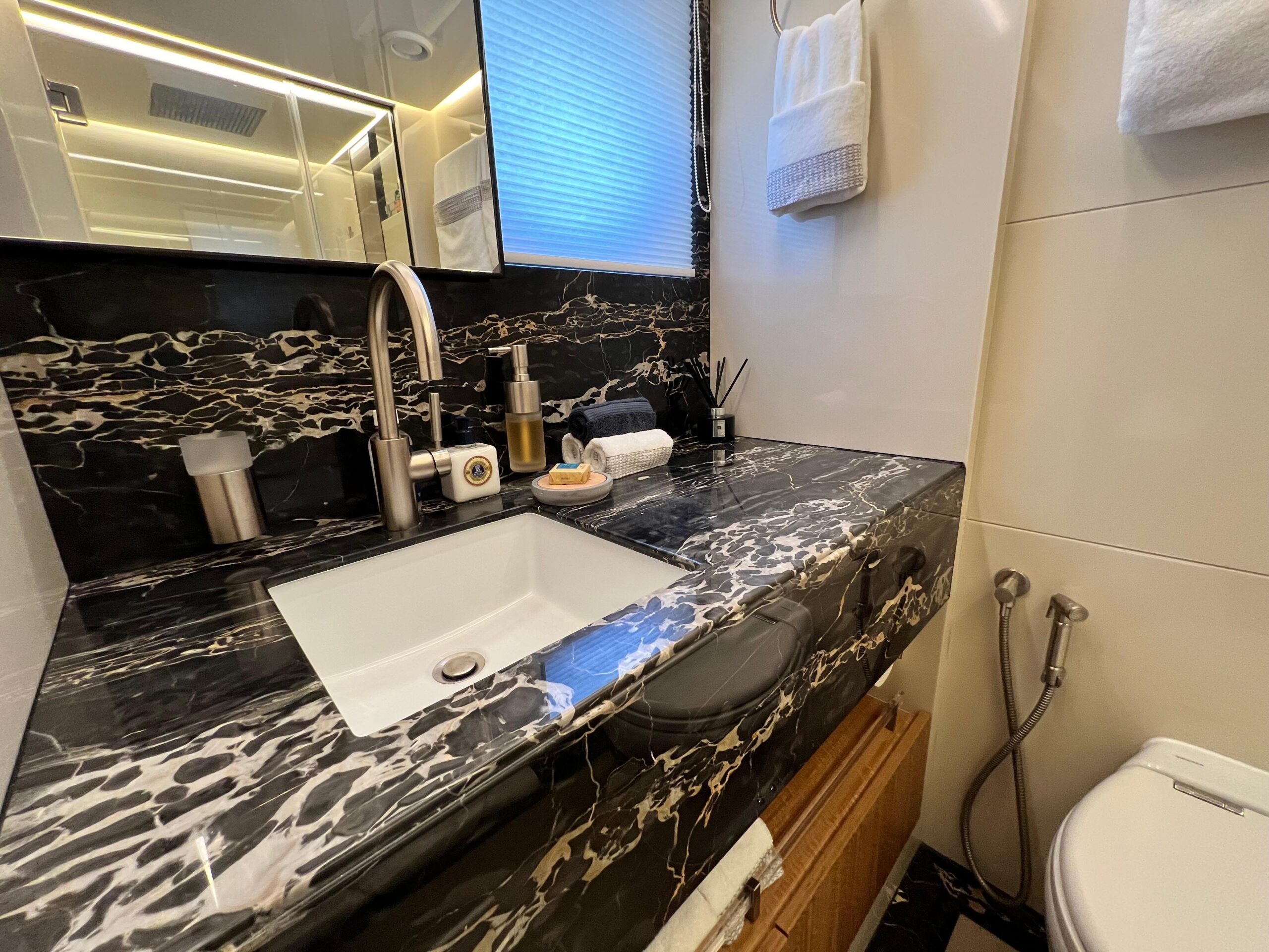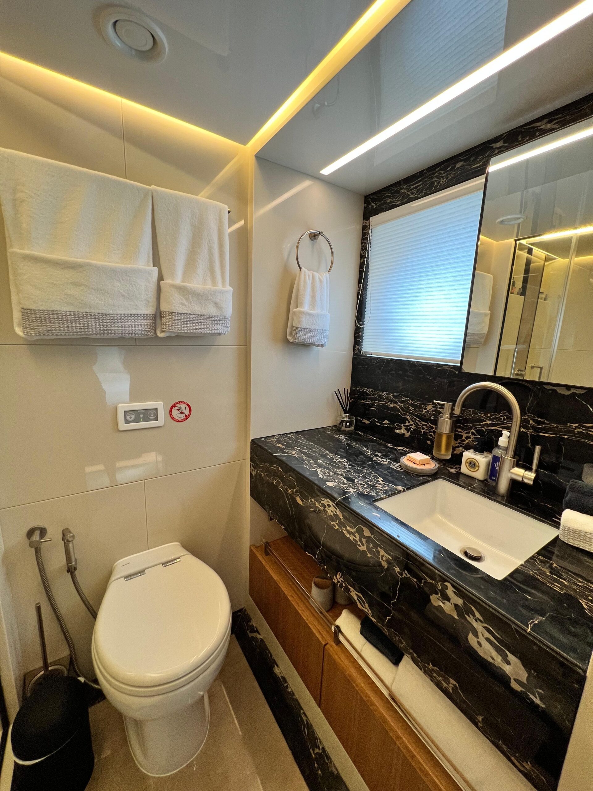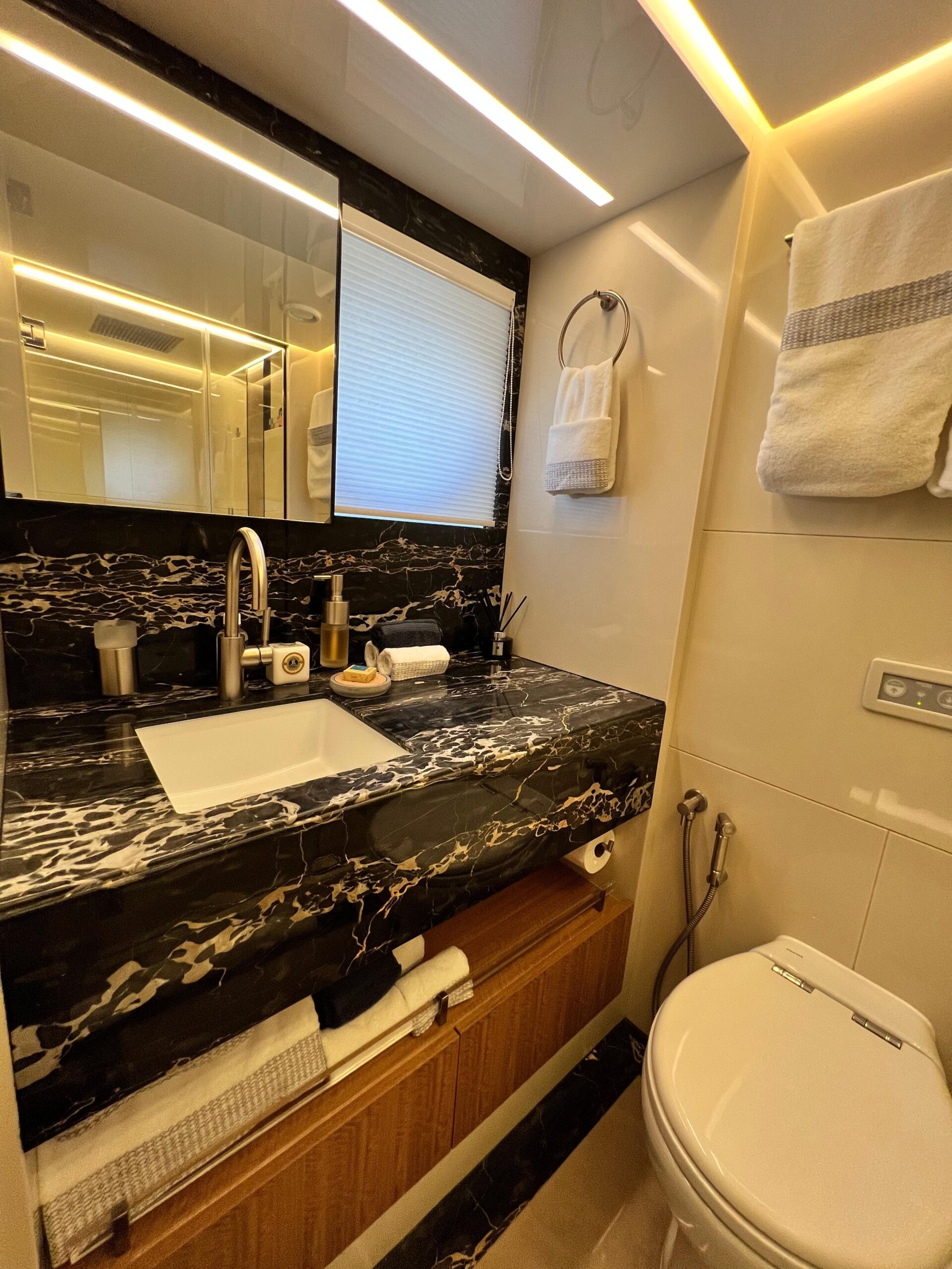 Яхта может разместить до 12 гостей в пяти роскошных и просторных каютах, включая мастер-каюту во всю ширину корпуса на главной палубе, 2 VIP-каюты с двуспальными кроватями и 2 двухместные каюты с дополнительными кроватями Pullman на нижней палубе.