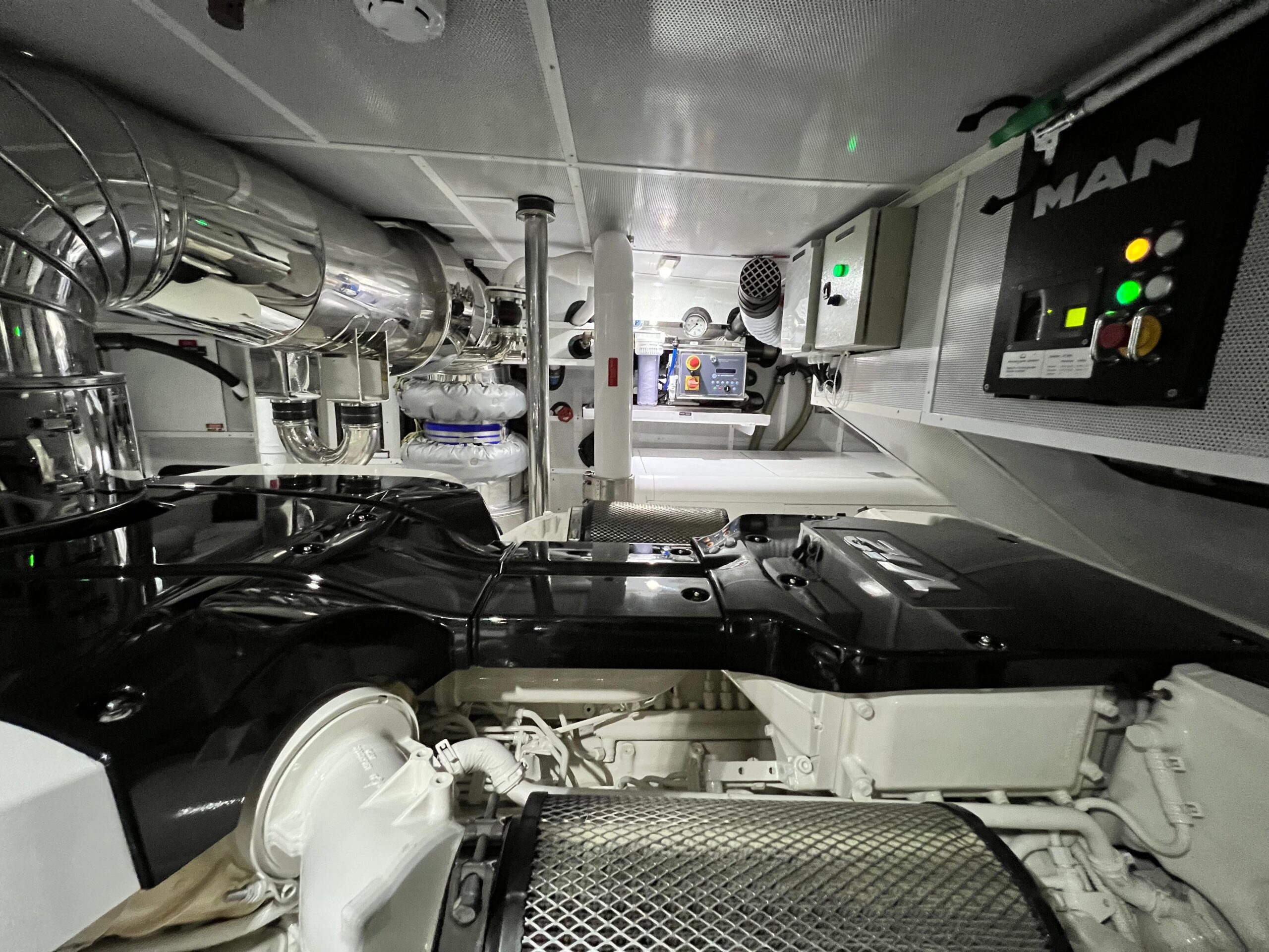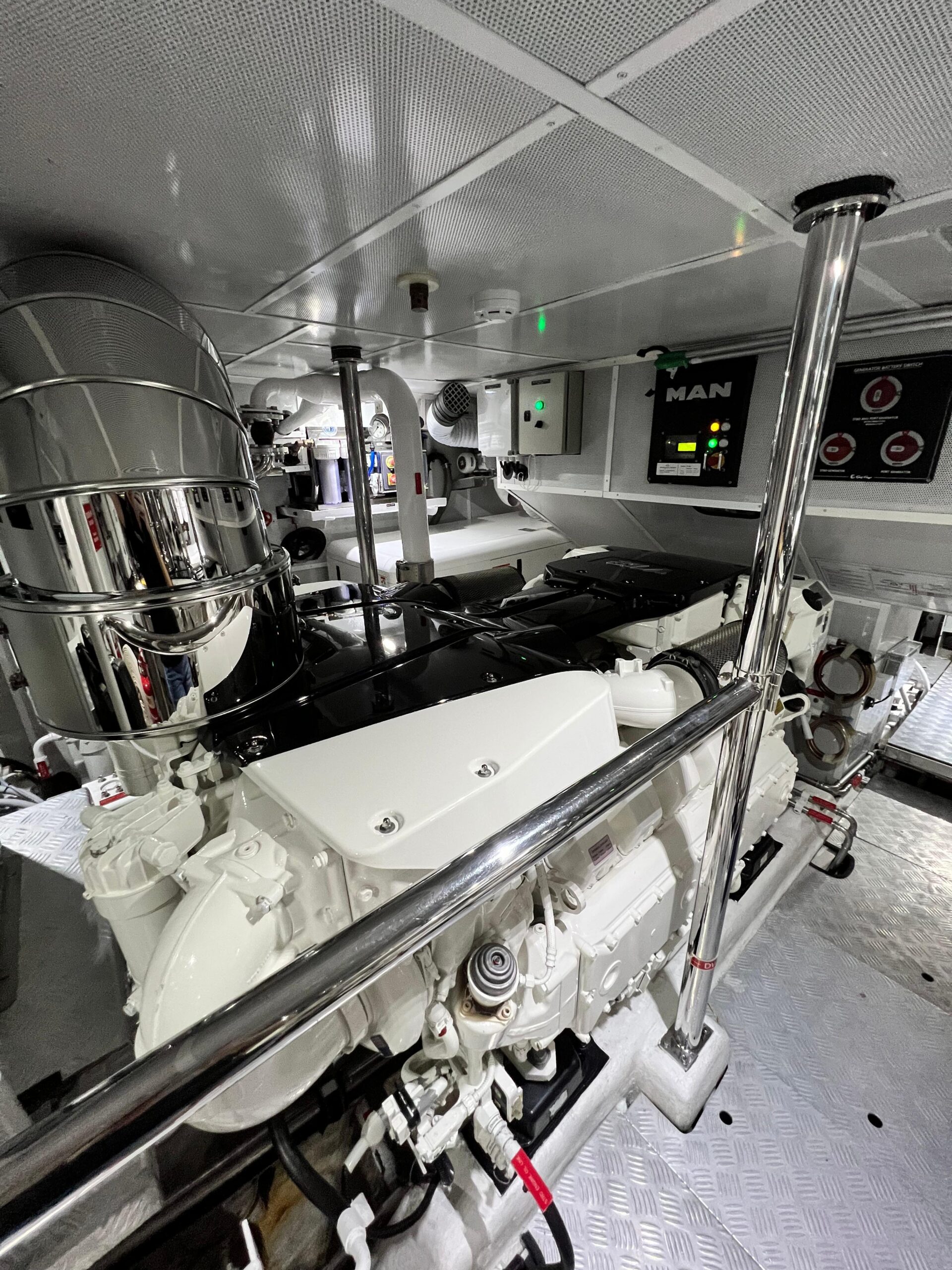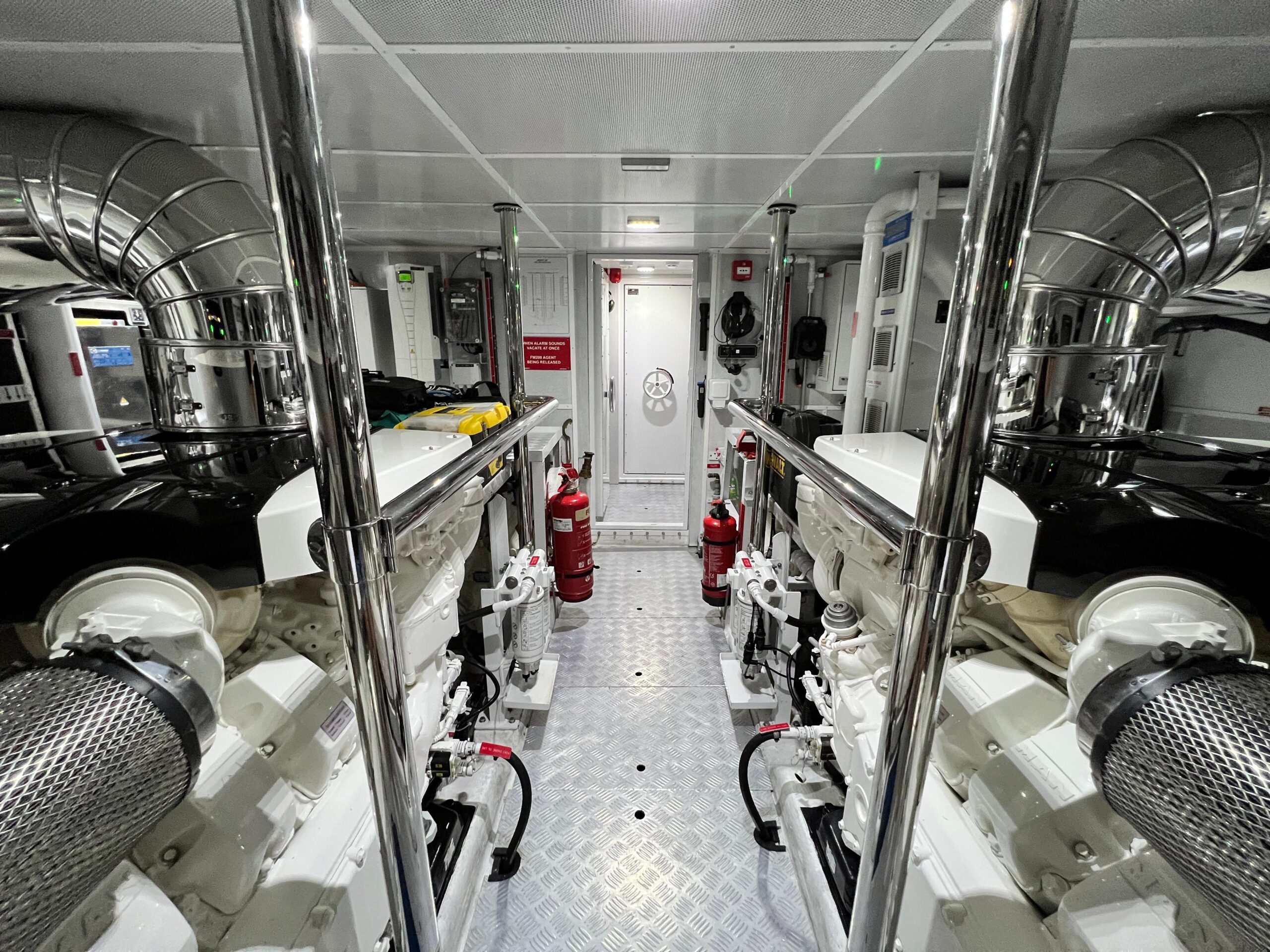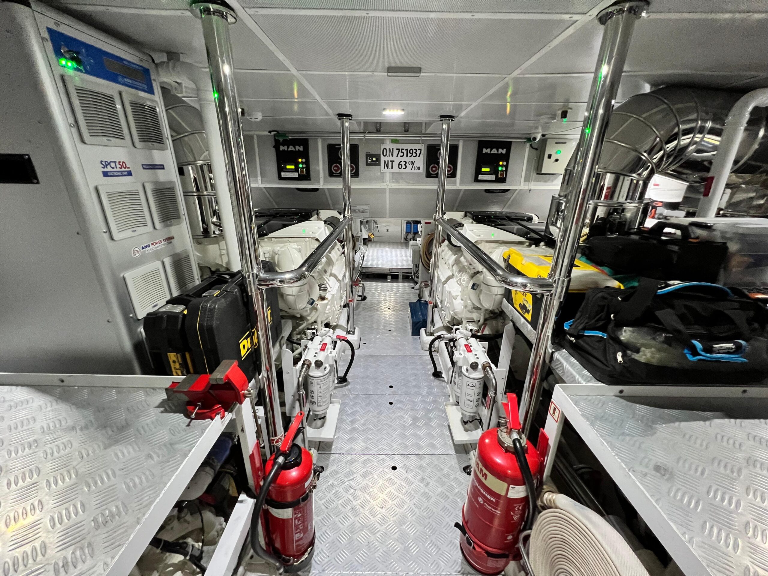 Два двигателя MAN V12 и общий запас топлива 15 700 литров обеспечивают крейсерскую скорость 17 узлов и максимальную скорость 23 узла. Это мореходная и комфортная полуводоизмещающая яхта с низким расходом топлива, отлично оснащённая для дальних круизов.