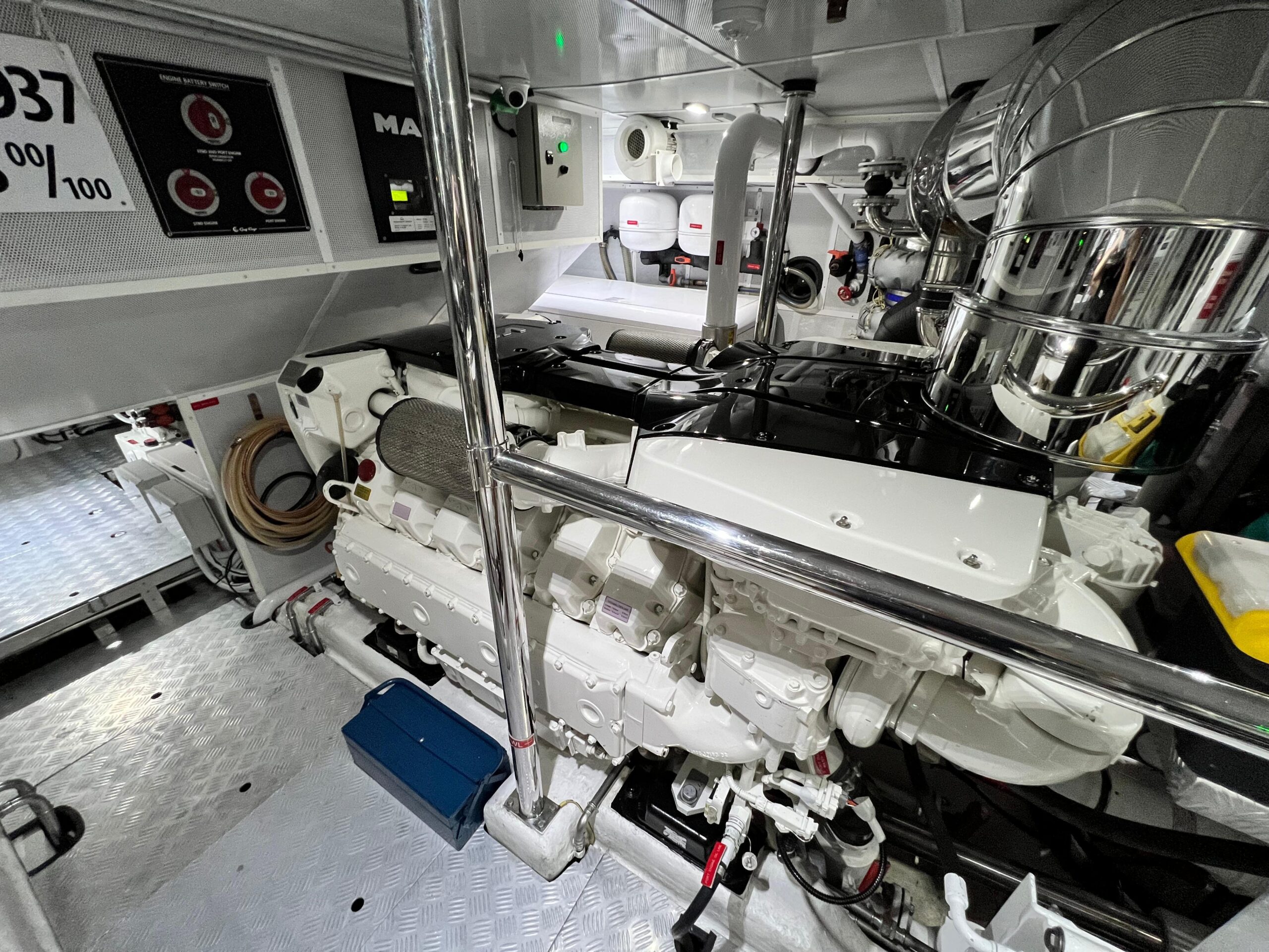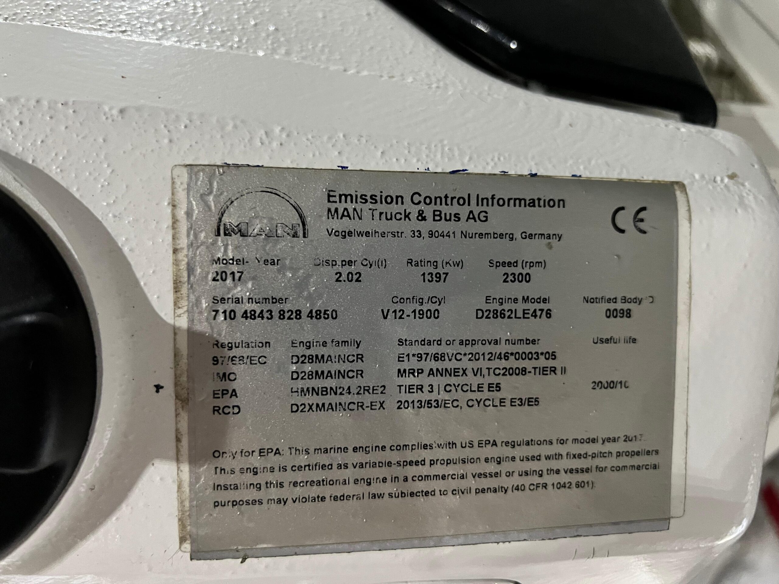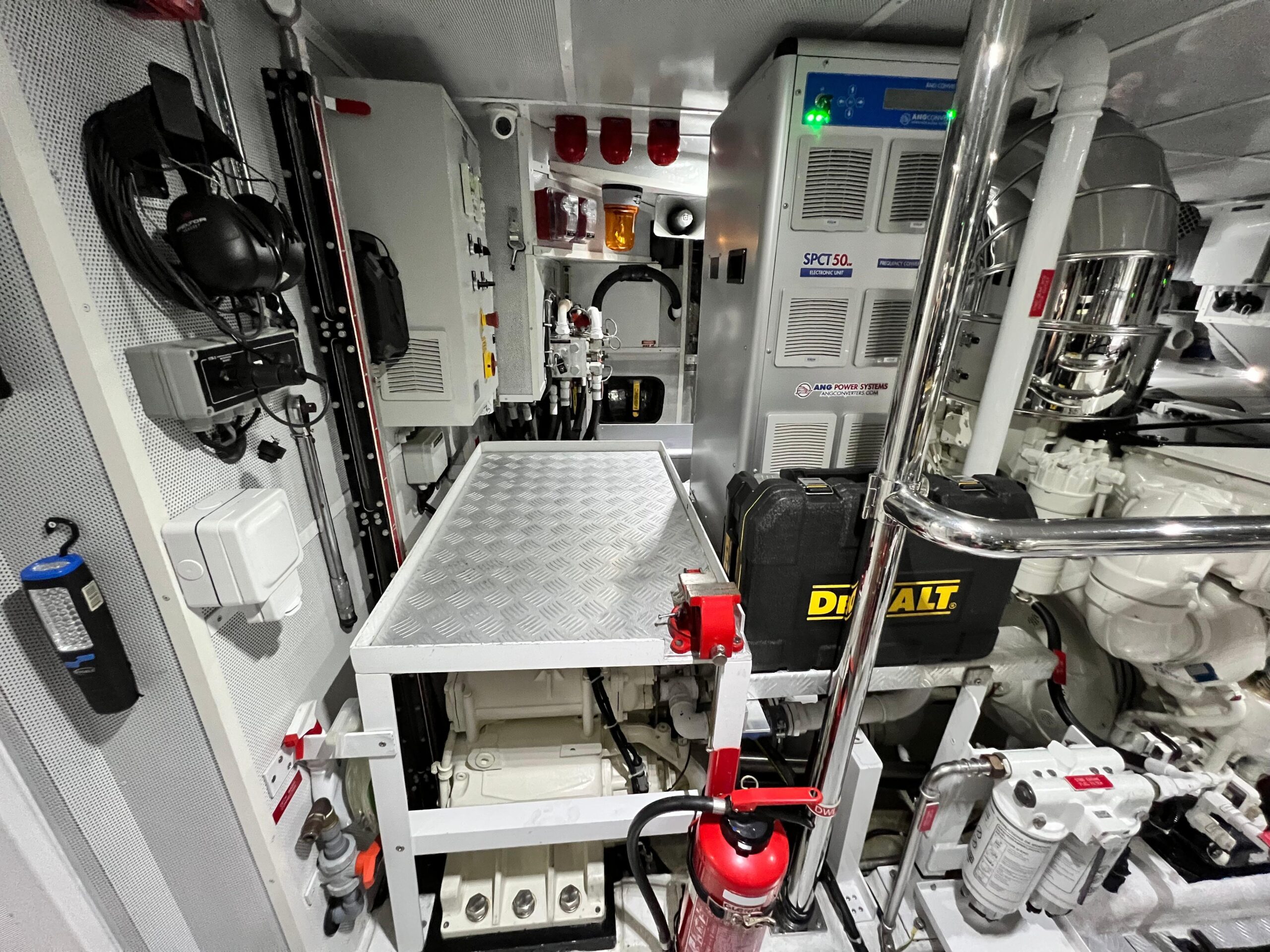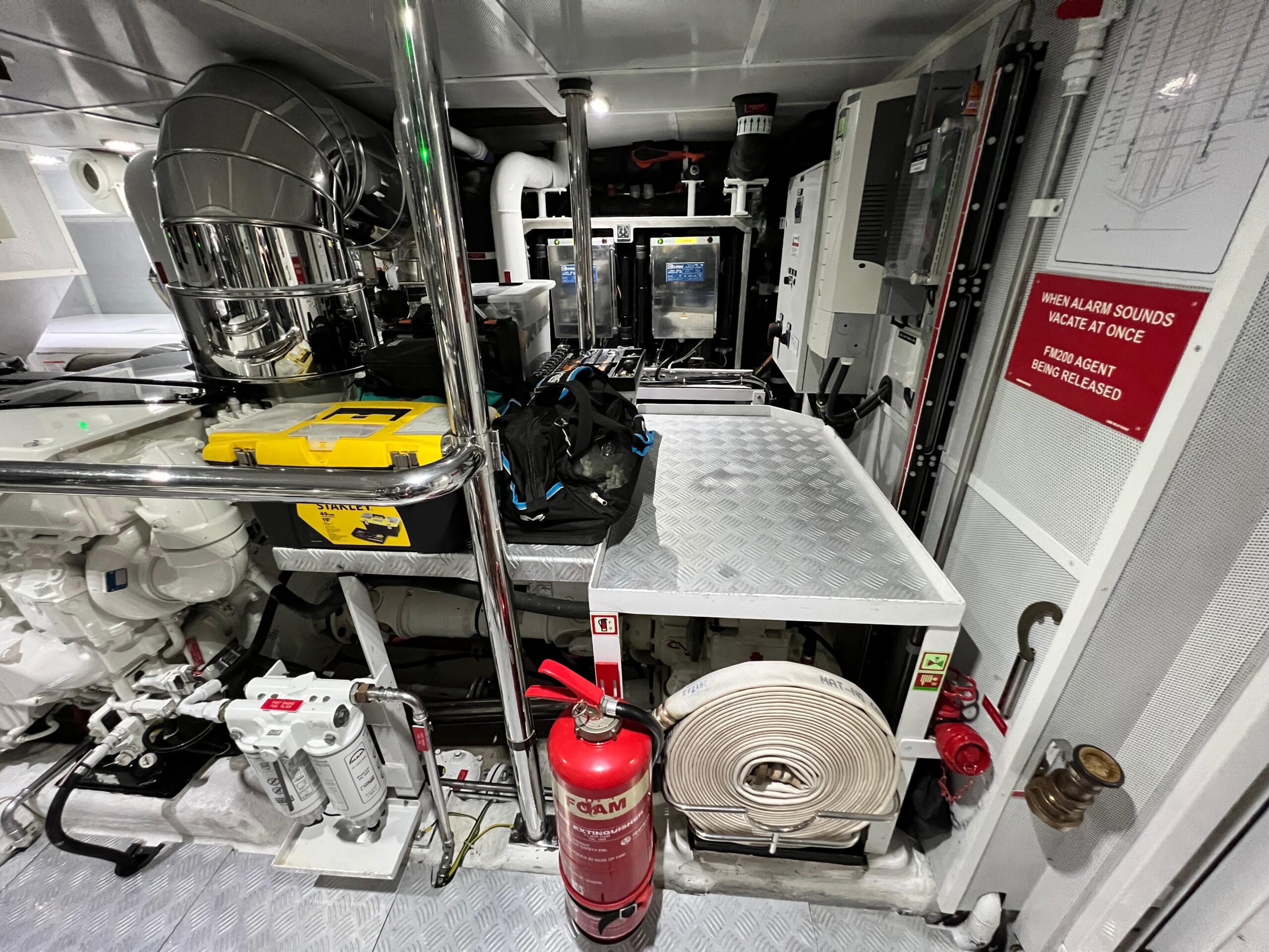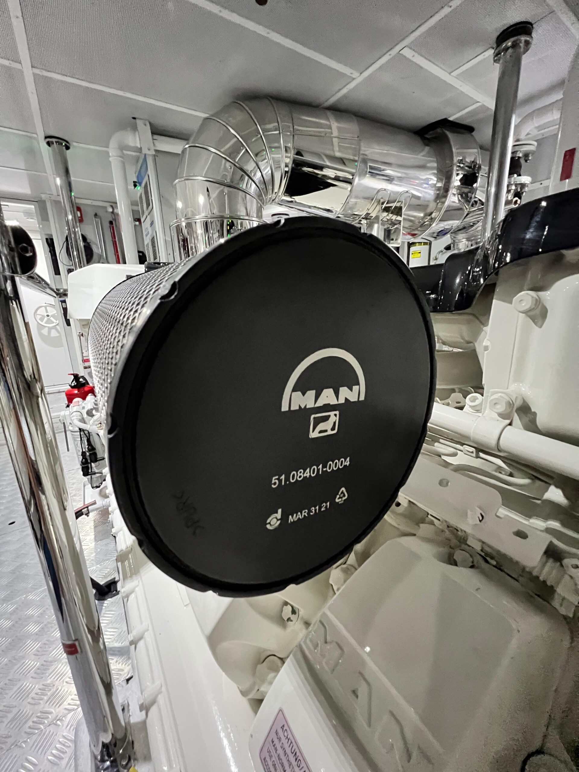 Два двигателя MAN V12 и общий запас топлива 15 700 литров обеспечивают крейсерскую скорость 17 узлов и максимальную скорость 23 узла. Это мореходная и комфортная полуводоизмещающая яхта с низким расходом топлива, отлично оснащённая для дальних круизов.
