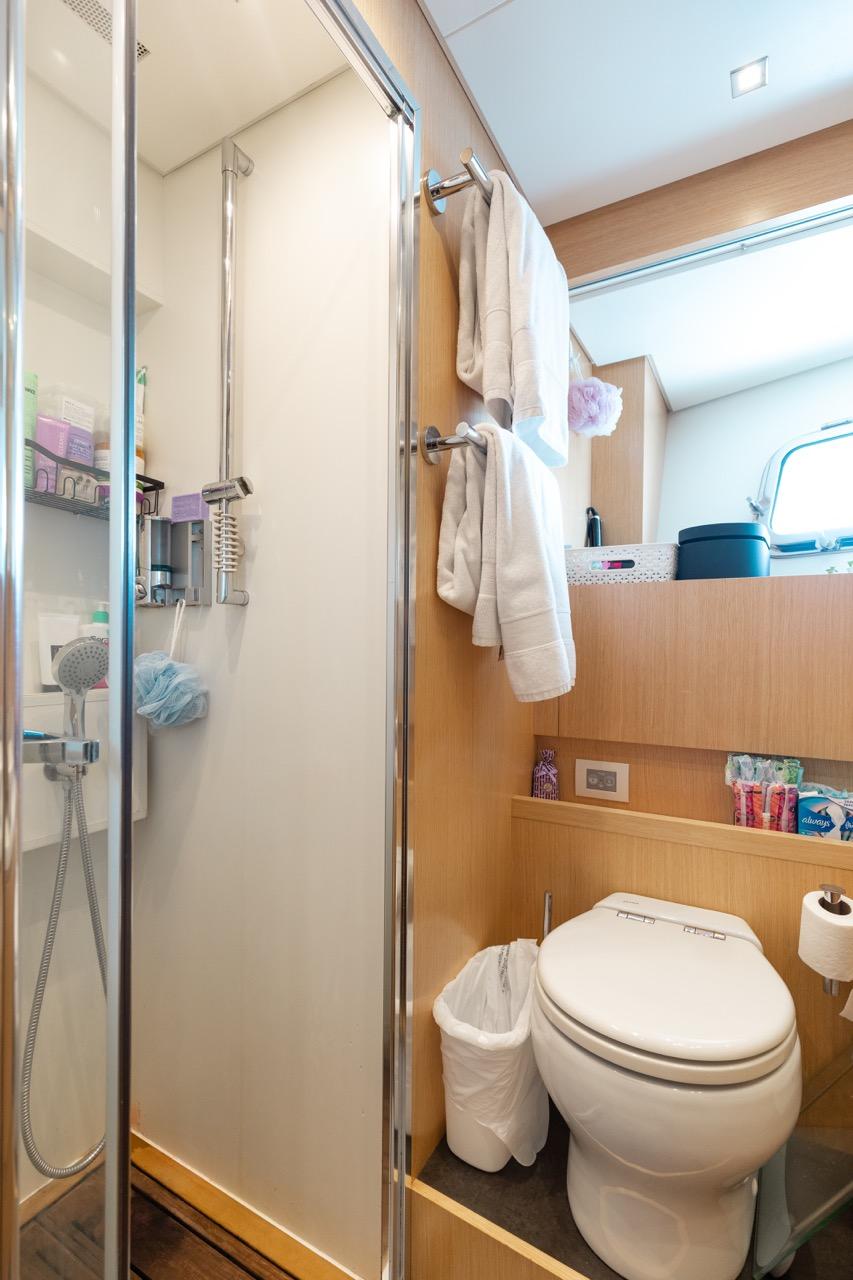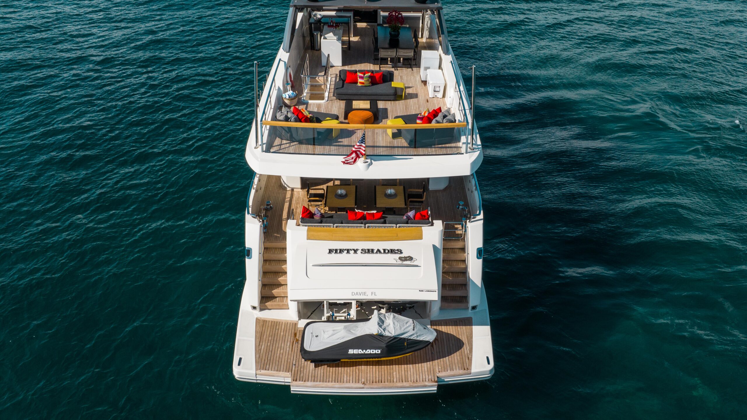 Fifty Shades получила полностью обновлённый интерьер от известного дизайнера Каллена Мозера, который создал яркую и выразительную концепцию по всей яхте. Вся обивка и текстиль были заменены, а индивидуально подобранные арт-объекты подчёркивают общий стиль. Главная каюта расположена на главной палубе, а также имеются четыре гостевые каюты, каждая с собственной ванной комнатой — идеальный вариант для семейного отдыха или чартерного использования.