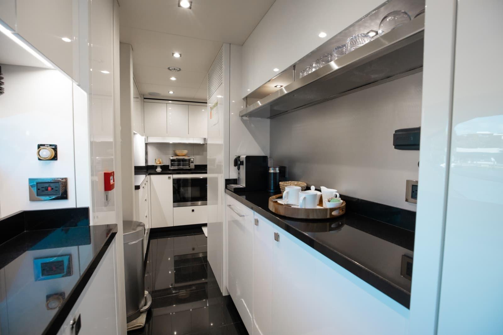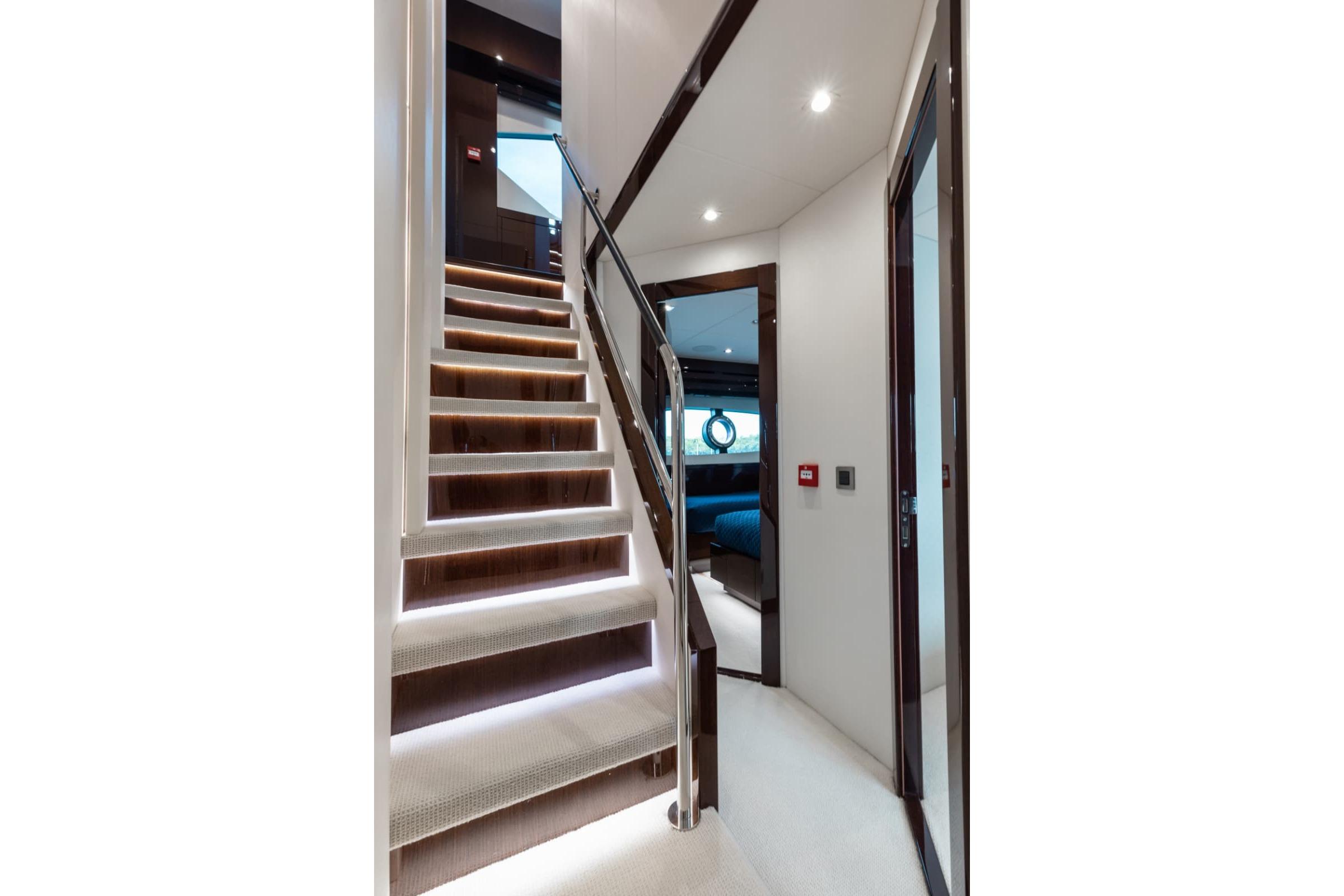 Ключевой особенностью является уникальная планировка главной палубы с оригинальной конфигурацией мастер-каюты, обеспечивающей дополнительное пространство и гибкость, характерные для яхт более высокого класса. Роскошная мастер-каюта расположена на главной палубе, при этом лестница в носовой части ведёт на промежуточный уровень с гардеробной зоной и просторной ванной комнатой. Приподнятая рулевая рубка позволяет максимально эффективно использовать пространство главной палубы — решение, действительно выдающееся для яхты такого размера.