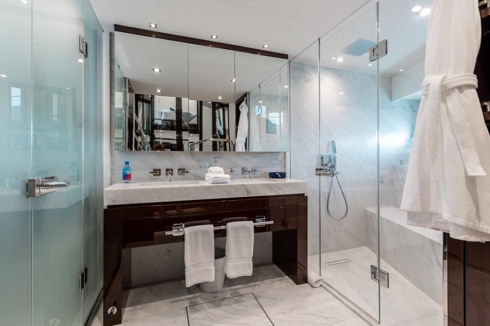 Мастер-каюта на главной палубе с эффектной трёхуровневой ванной комнатой (triplex en suite)