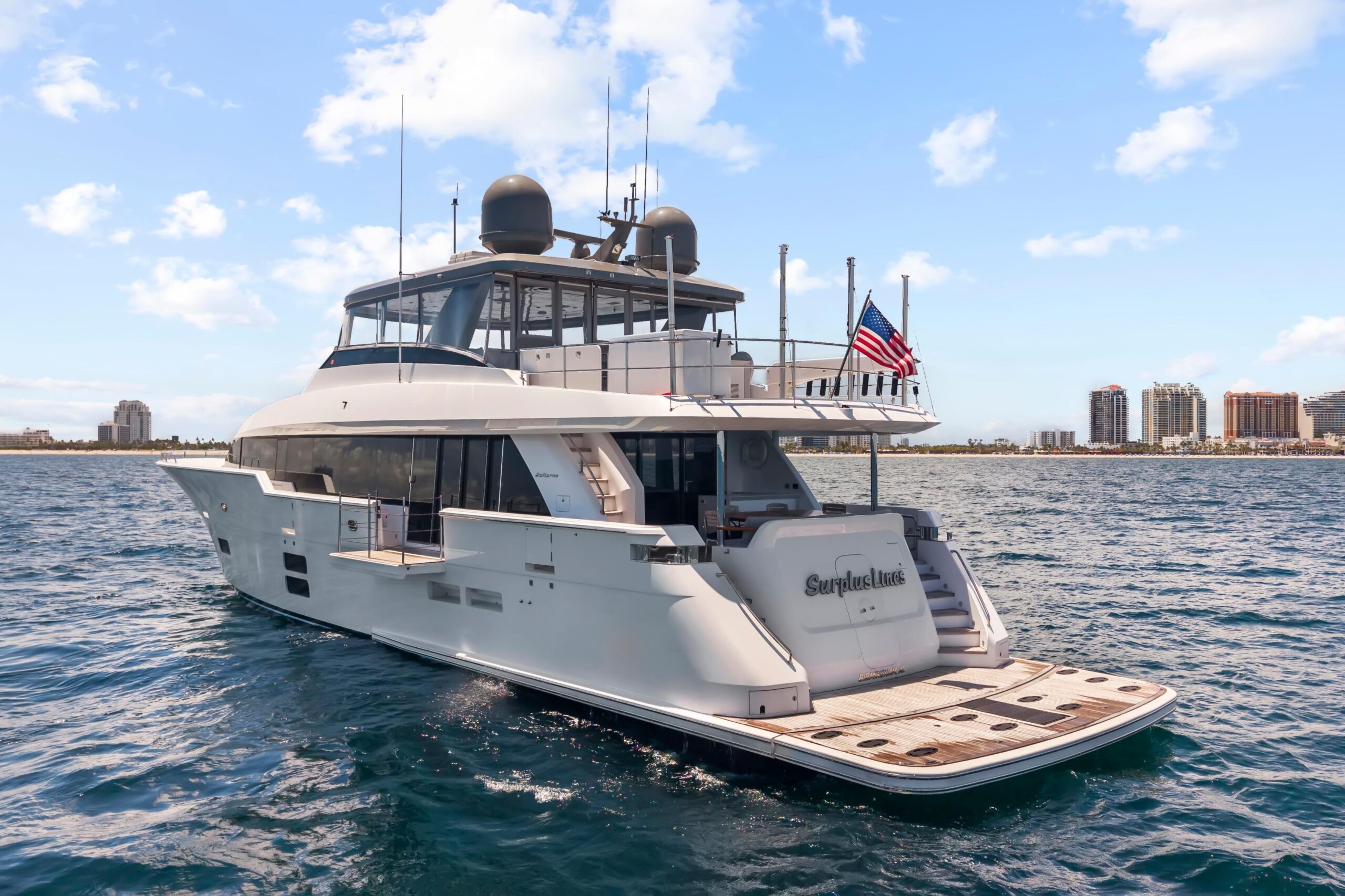 Hatteras M90 Panacera «SURPLUS LINES», спущенная на воду в 2019 году, — это кастомная моторная яхта, созданная для большой семьи и оснащённая более чем на 2 миллиона долларов индивидуальных опций. Яхта приводится в движение двигателями Caterpillar C32 мощностью по 1900 л.с. (2200 моточасов) и оборудована системой джойстикового управления CAT360, обеспечивающей отличные ходовые качества и комфортное управление.