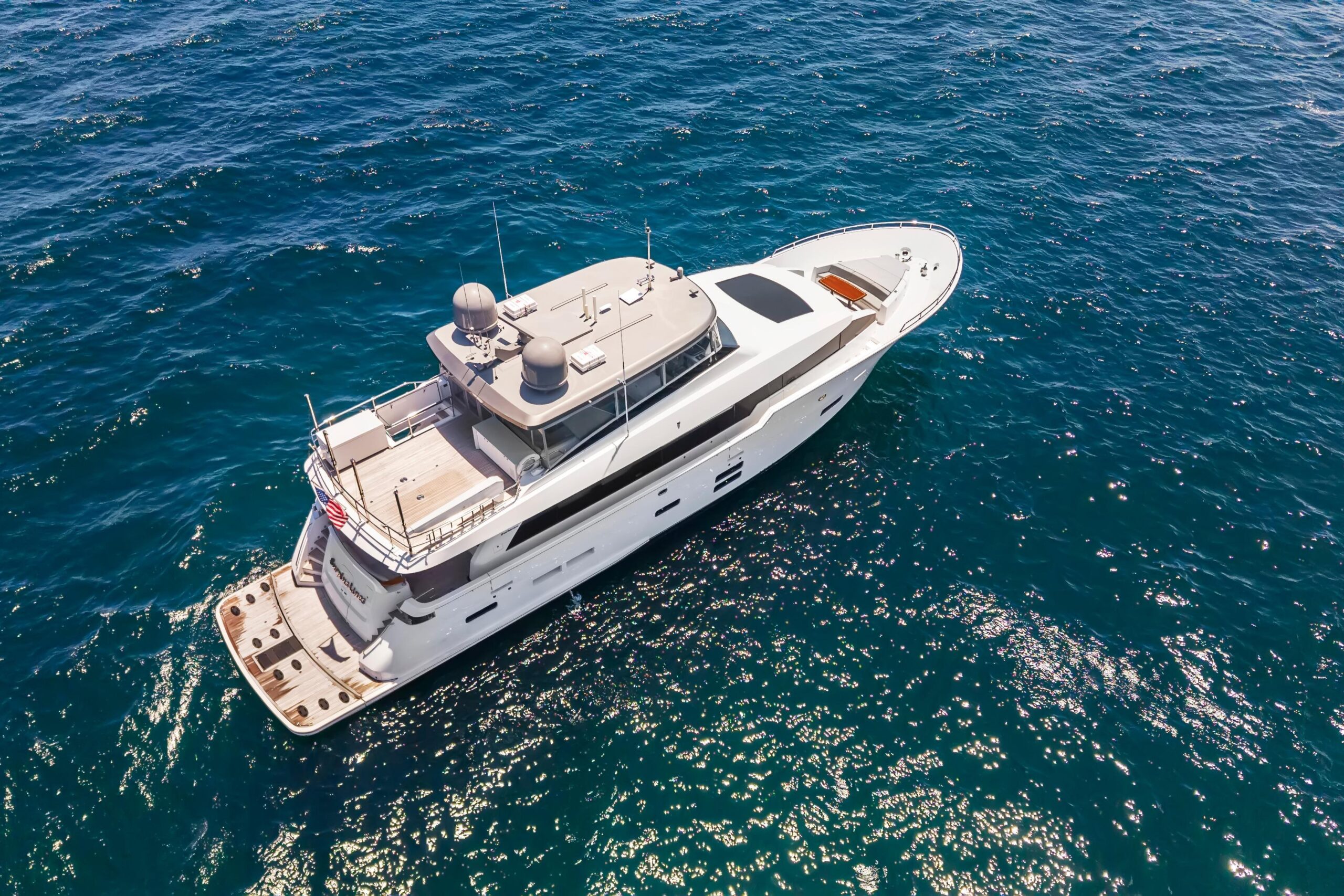 Кормовая часть флайбриджа — универсальная и открытая. Улучшенный телескопический кран-давит позволяет поднимать водные игрушки, включая гидроциклы и Seabob. Зону можно оборудовать столом и стульями Release Marine для ужинов или коктейлей; при необходимости всё убирается в индивидуальную систему хранения. Также в корме есть гриль из нержавеющей стали, а тень создают парусные навесы Pipe Welders — отличное место для отдыха на свежем воздухе.