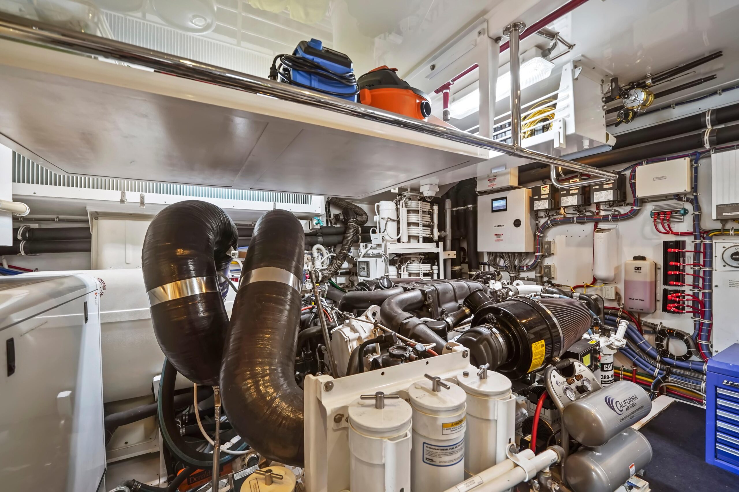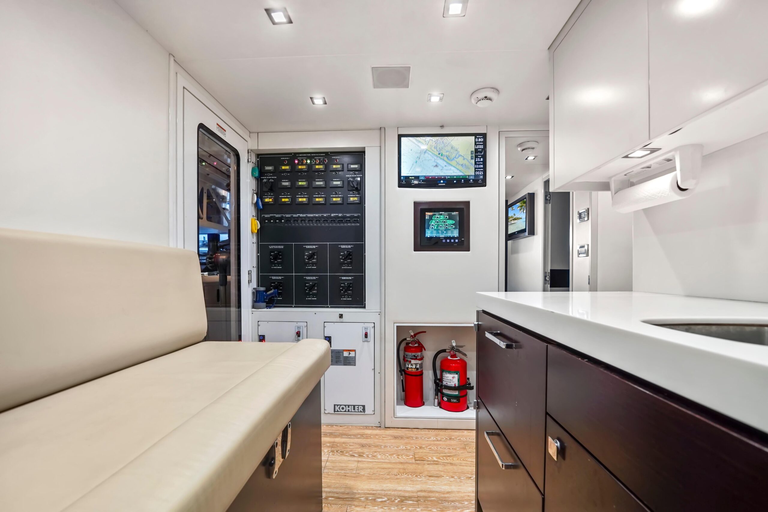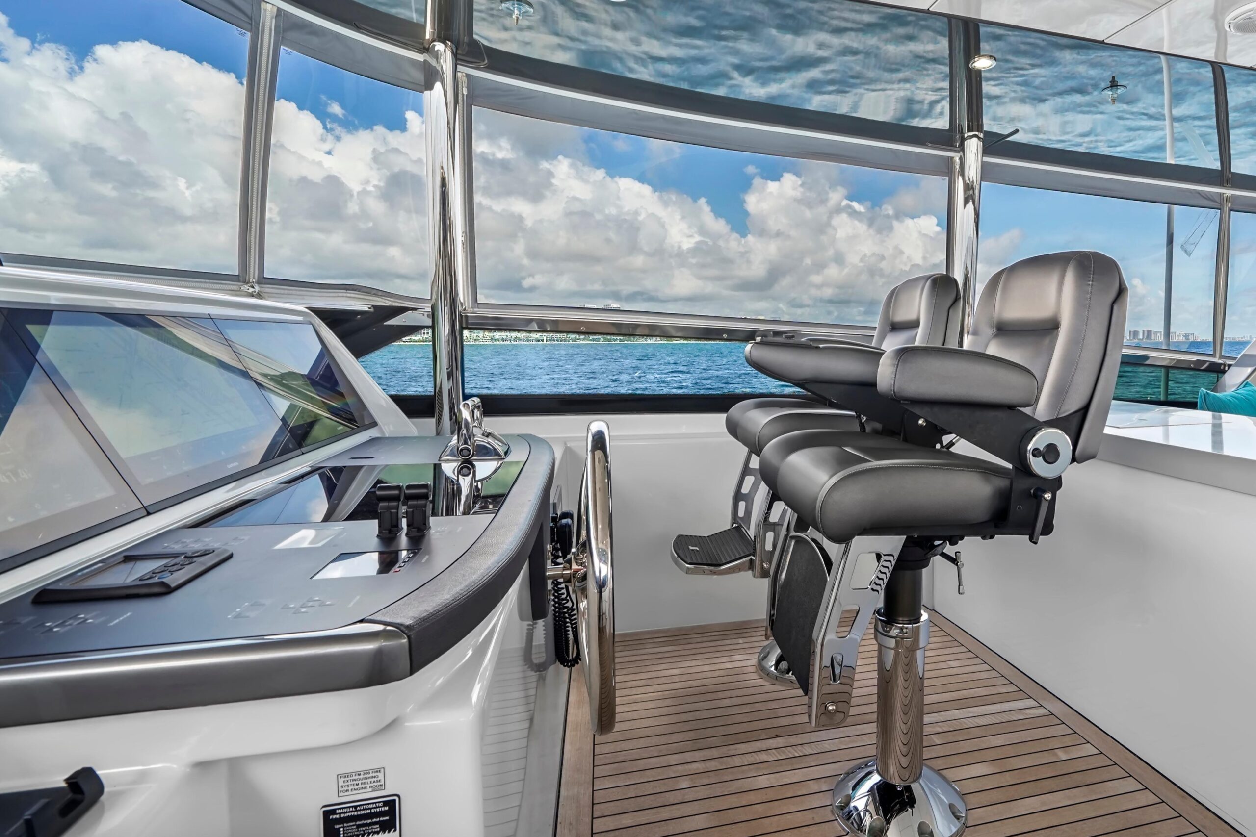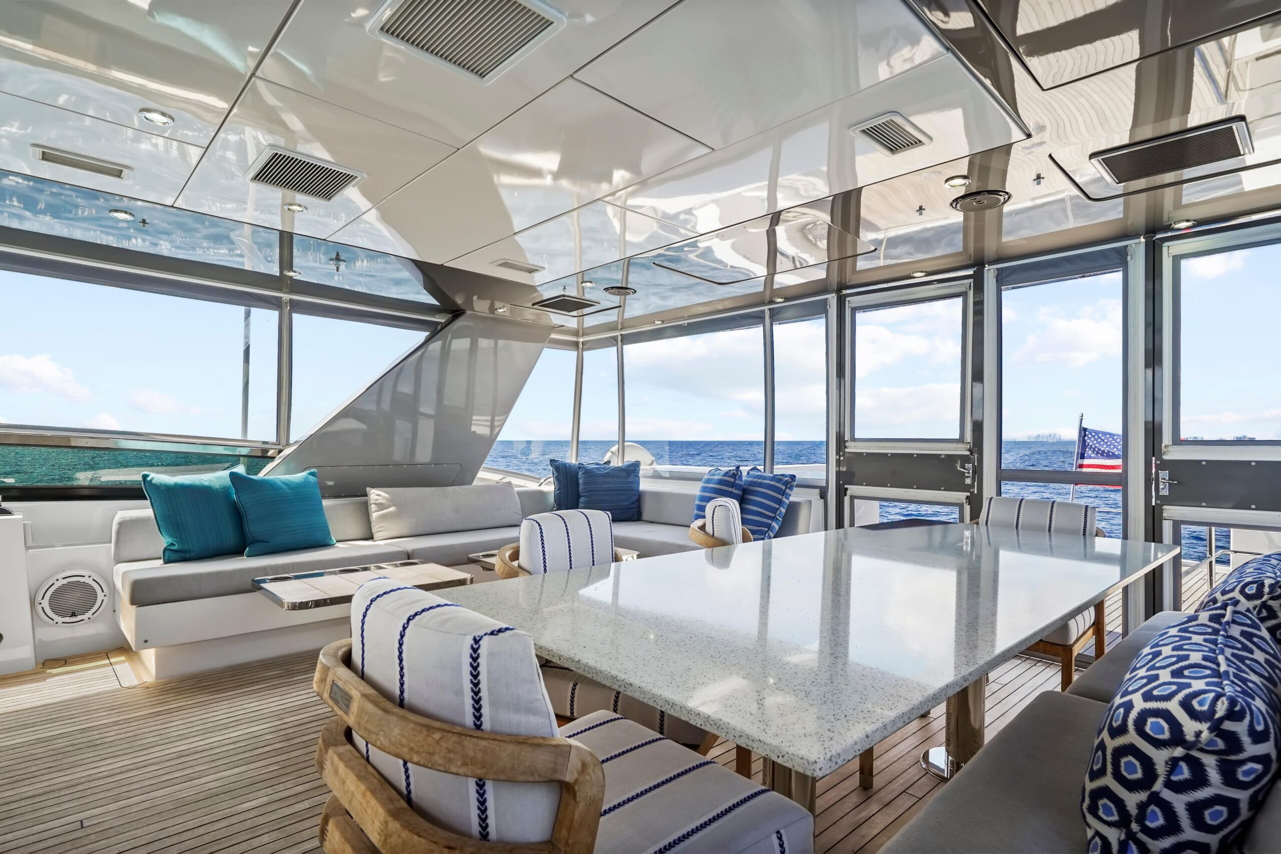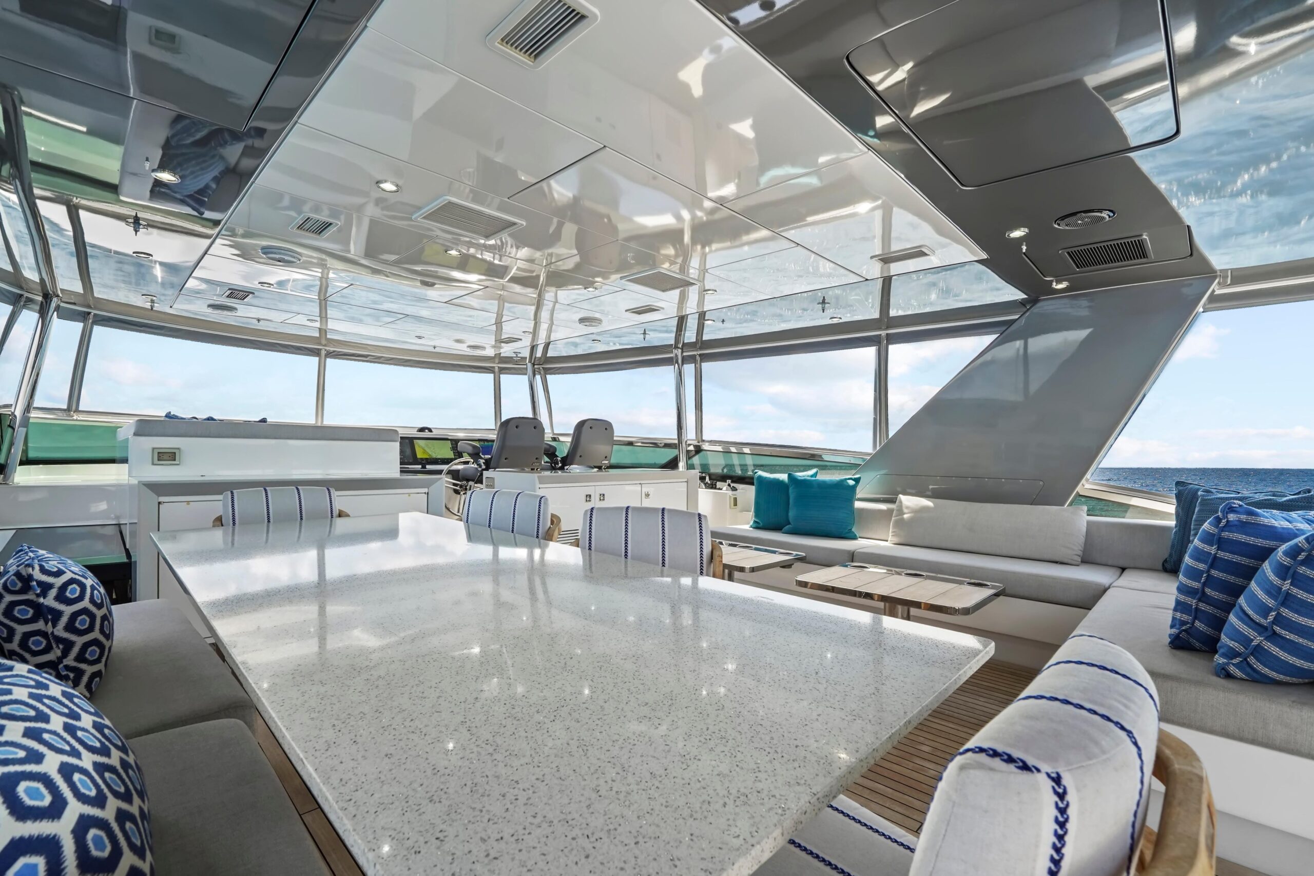 Сразу за зоной сидений слева встроенный шкаф содержит индивидуальный кулер, подключённый к льдогенератору Eskimo с высокой производительностью. Справа, за креслами рулевого, — шкаф с мойкой и тремя холодильниками для напитков. Дальше в корме — большой Г-образный диван со встроенным хранением и два коктейльных столика Release Marine. Слева — обеденный стол на восемь и выдвижной телевизор, интегрированный в хардтоп. Все A/V-системы управляются через Crestron iPad. Для швартовки на флайбридже предусмотрены крыловые посты управления (wing stations) по левому и правому борту — с управлением носовым/кормовым подруливателями, CAT360 джойстиком и машинными рычагами для точного маневрирования и отличной видимости.
