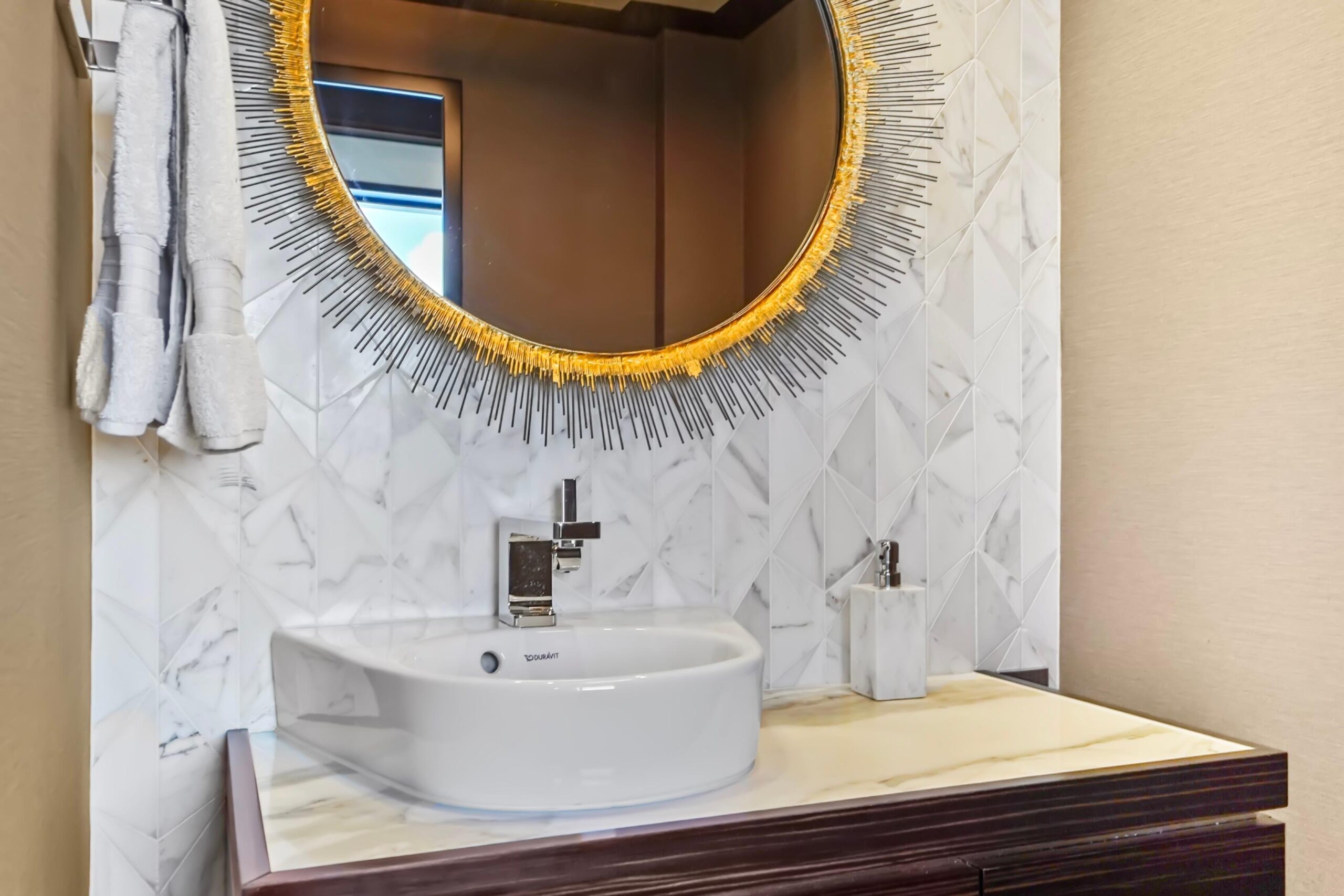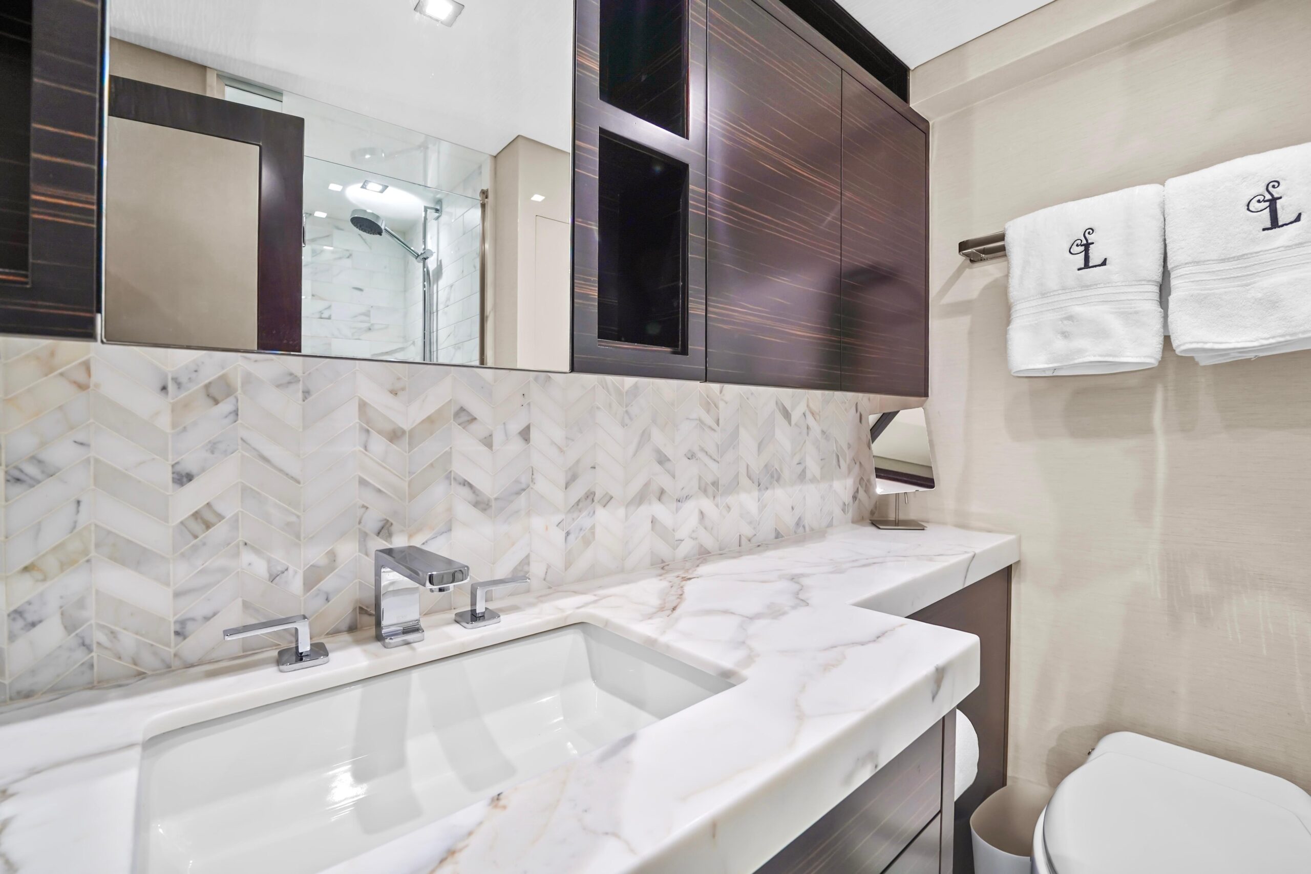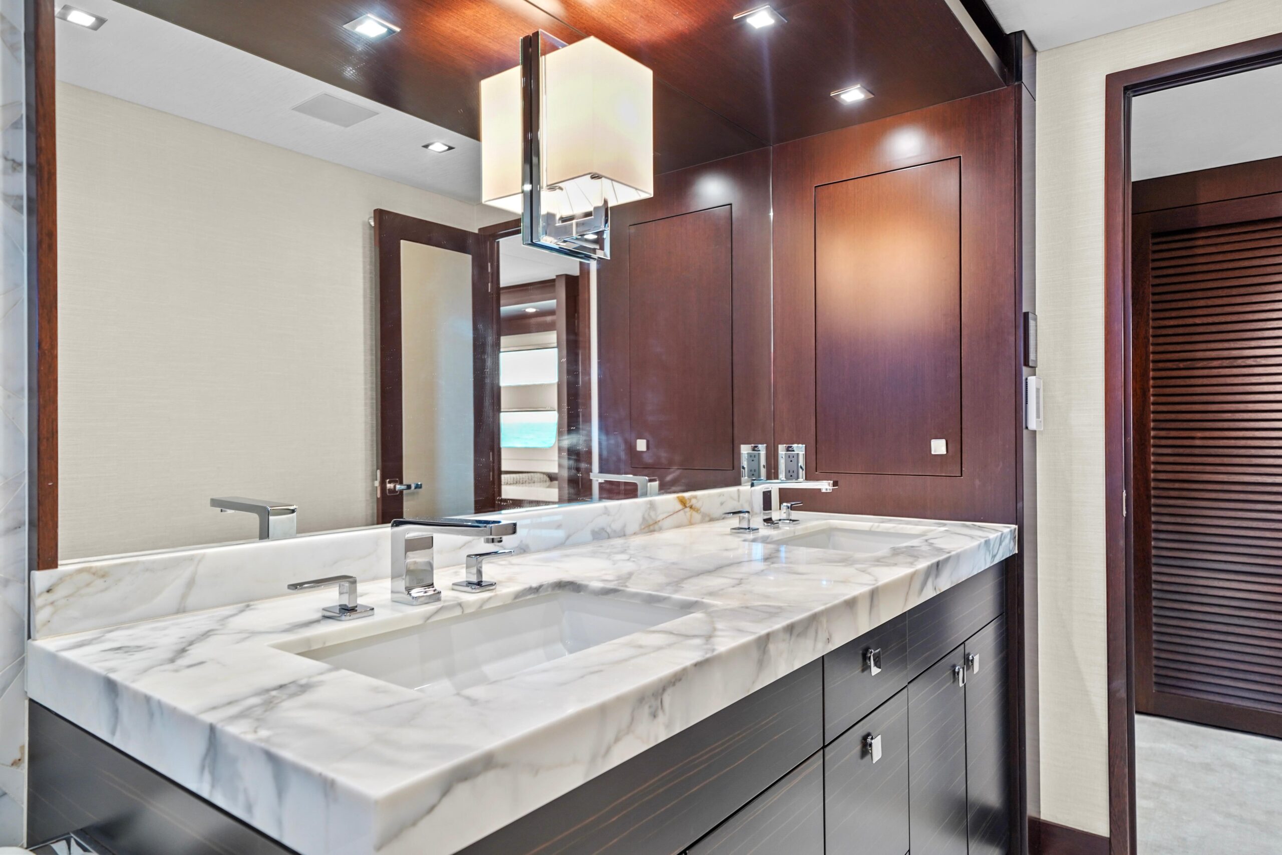 Мастер-каюта, расположенная в средней части ближе к корме, впечатляет объёмом — заметно больше, чем у предыдущих Hatteras 90 Panacera, с дополнительными 22 дюймами пространства и в нос, и в корму. Центральный элемент — кровать king-size с хранением под основанием, подъём осуществляется электроприводом. По левому борту под окном — индивидуальная односпальная кушетка, которая служит диваном/лаунжем: удобно отдыхать, читать или использовать как дополнительное место для детей. По правому борту — встроенные ящики для хранения; два шкафа расположены в кормовой части и по левому борту. Ванная комната ensuite также премиальна: тёплый пол, большая двойная раковина и просторная душевая «walk-in». Сразу за пределами мастер-каюты — индивидуальный кофейный бар с холодильником для напитков снизу, местом для кофемашины на столешнице и хранением бокалов сверху.