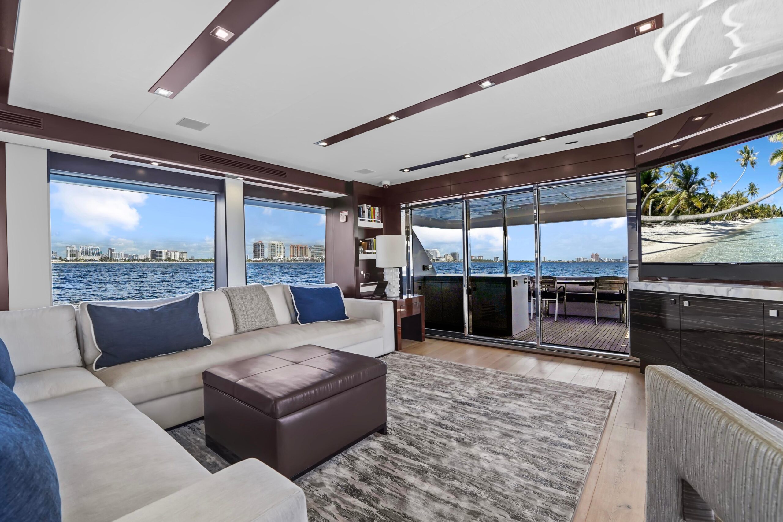 Просторный салон выполнен в современном стиле: светлый пол из белого дуба и мебель в светлых тонах, кресло «club chair» по левому борту и большой Г-образный диван со встроенным хранением по правому. Большие окна и непрямое освещение усиливают ощущение открытого пространства. Раздвижные стеклянные двери ведут на откидной балкон по левому борту.