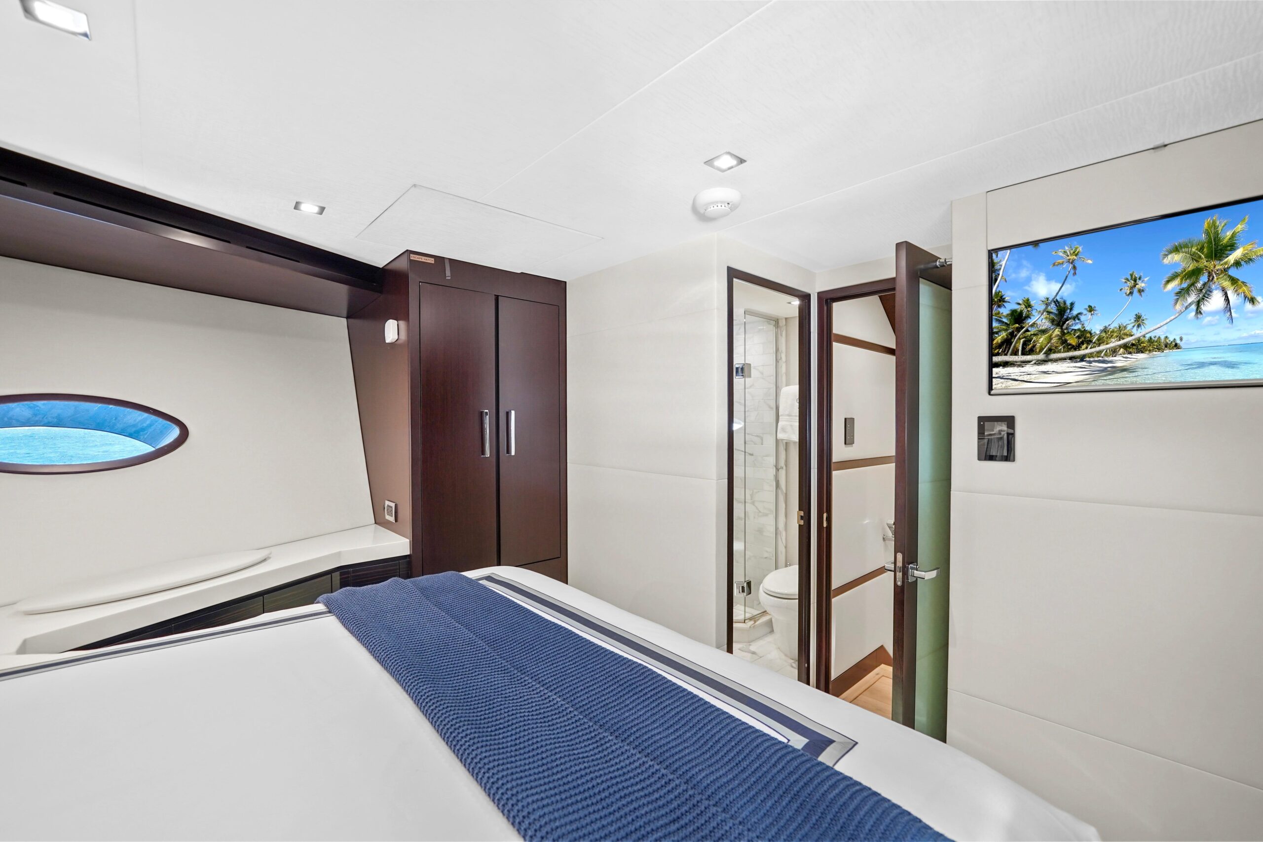 Носовая VIP-каюта оснащена центральной двуспальной кроватью (queen) и санузлом ensuite с тёплым полом. Blackout-шторы, электрошторы и управление Crestron обеспечивают максимальный комфорт гостей.