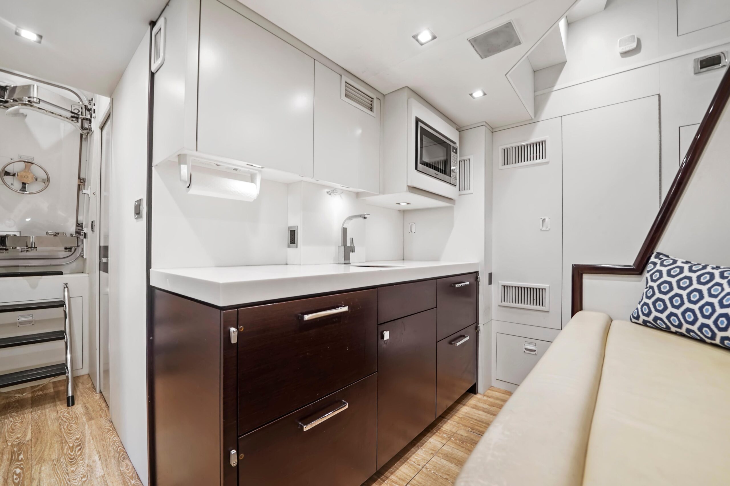 Камбуз отлично подходит для приготовления и приёма гостей: обновлённая техника Wolf, холодильник Sub-Zero и винный шкаф. В передней части — динетта на шесть человек; световые люки и большие окна дают много естественного света.