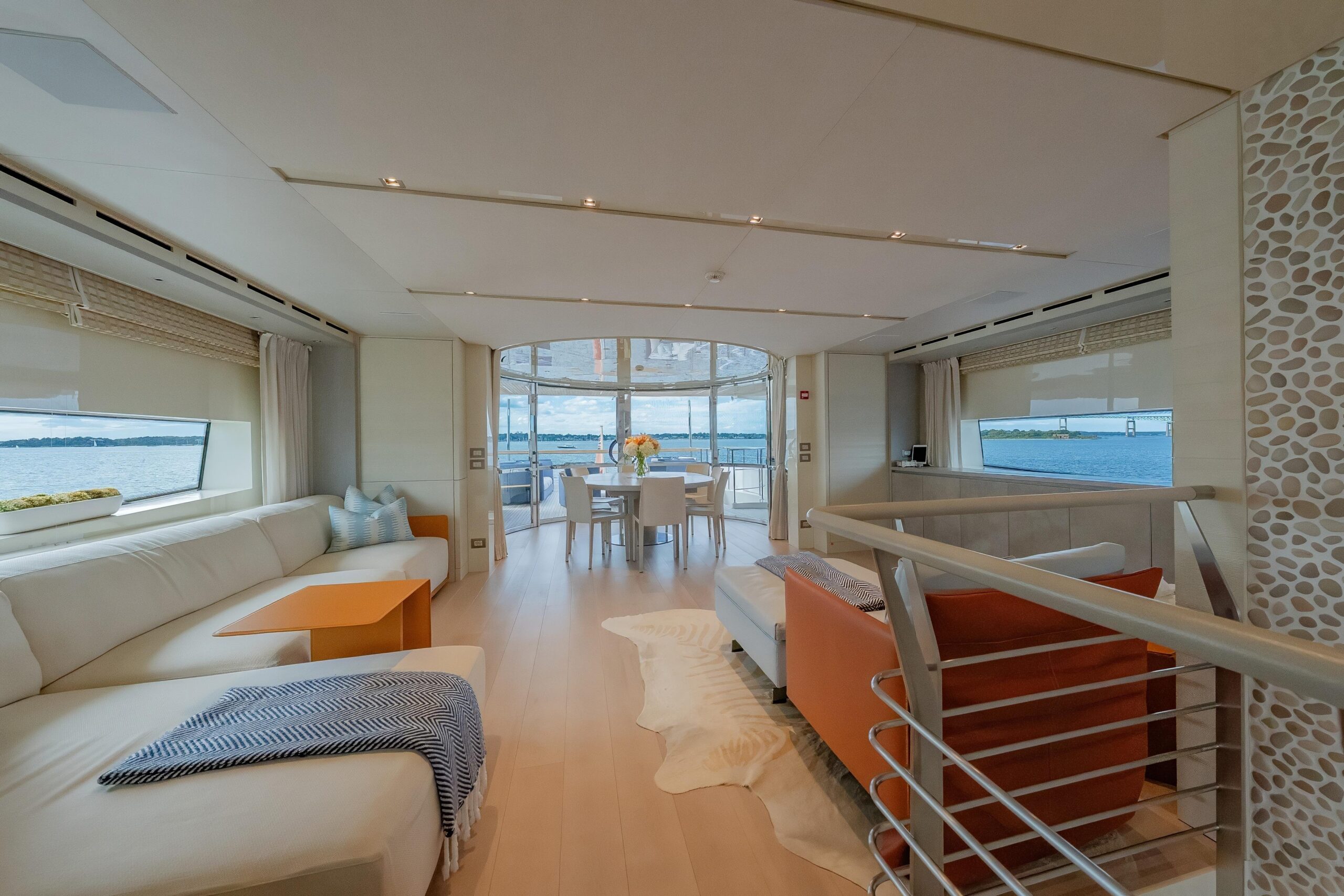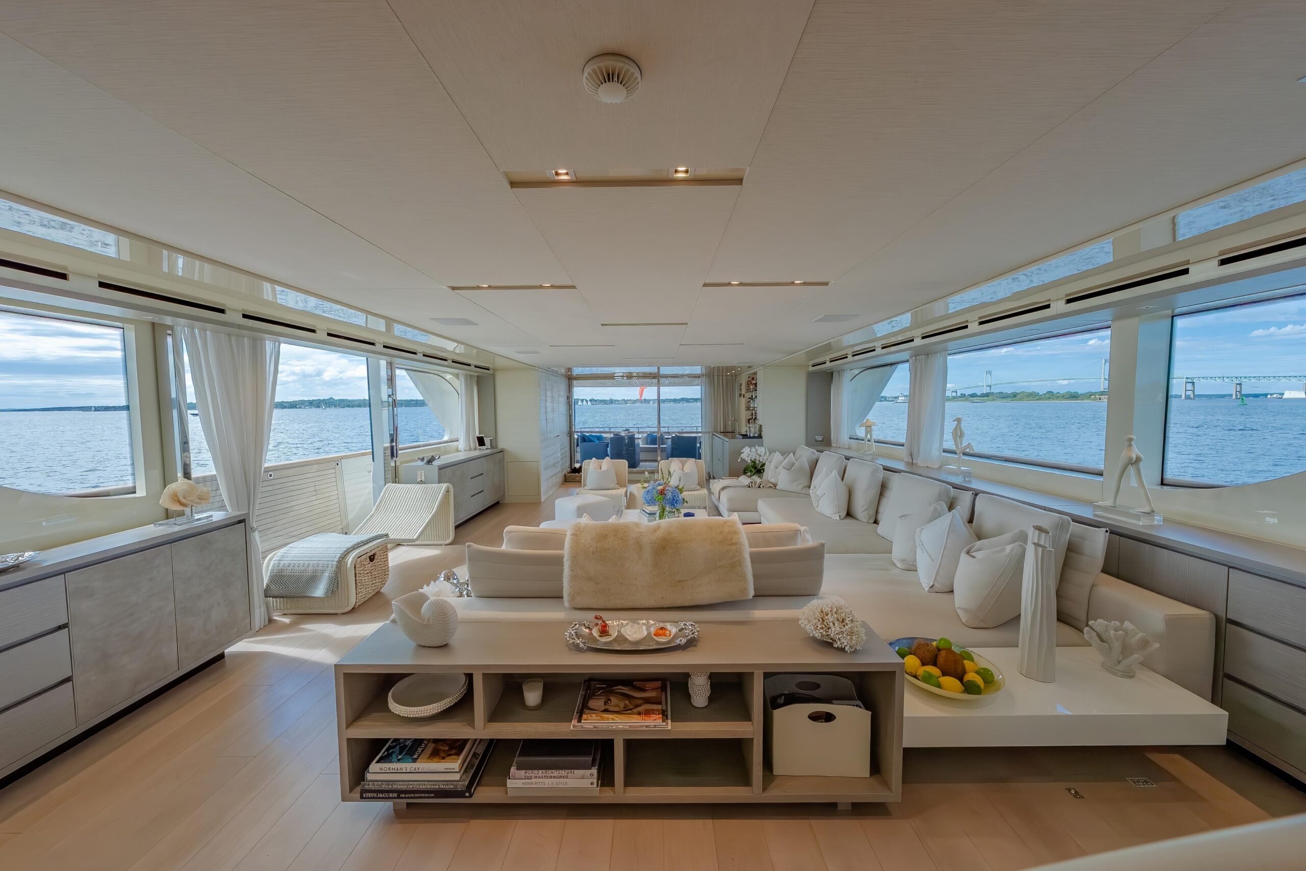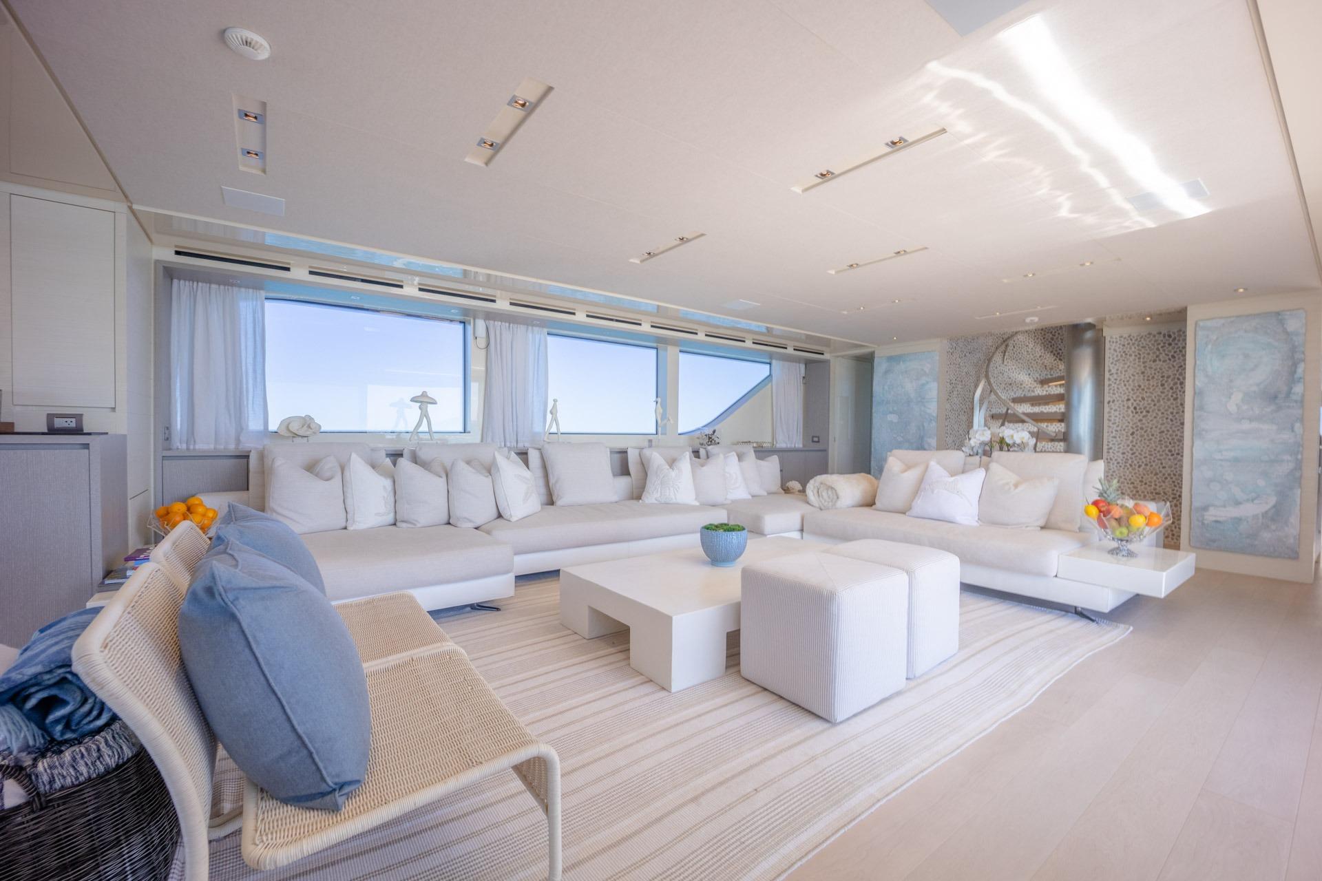 Интерьер выполнен в стиле «St. Barts» от Marty Lowe, сочетая прибрежную цветовую палитру с атмосферой непринуждённой роскоши. Среди ключевых зон на борту — полноширинный скайлаунж, панорамный главный салон с морским балконом, а также обширные зоны для отдыха и приёма гостей на открытом воздухе на всех палубах, включая флайбридж с джакузи, соляриями и баром.