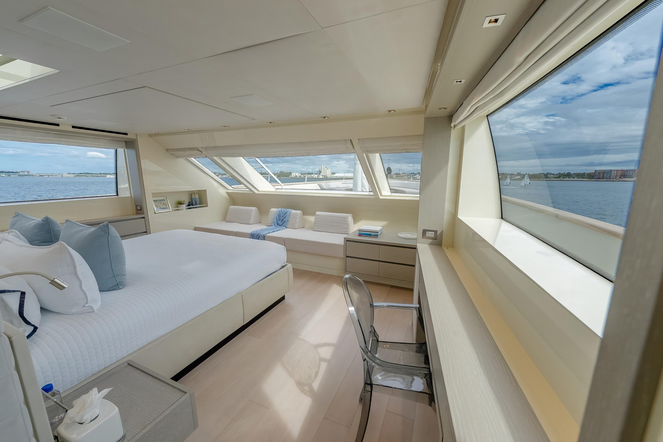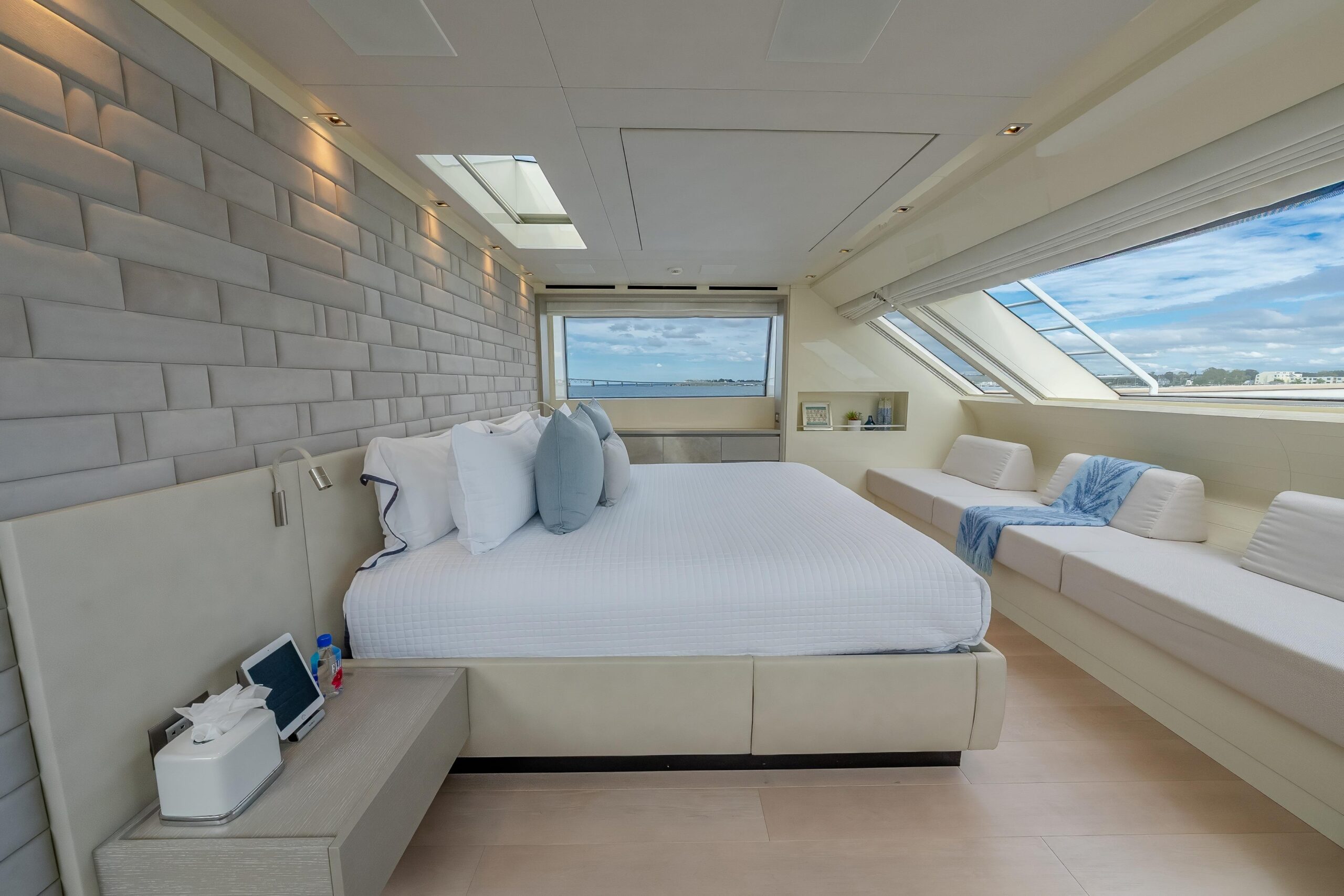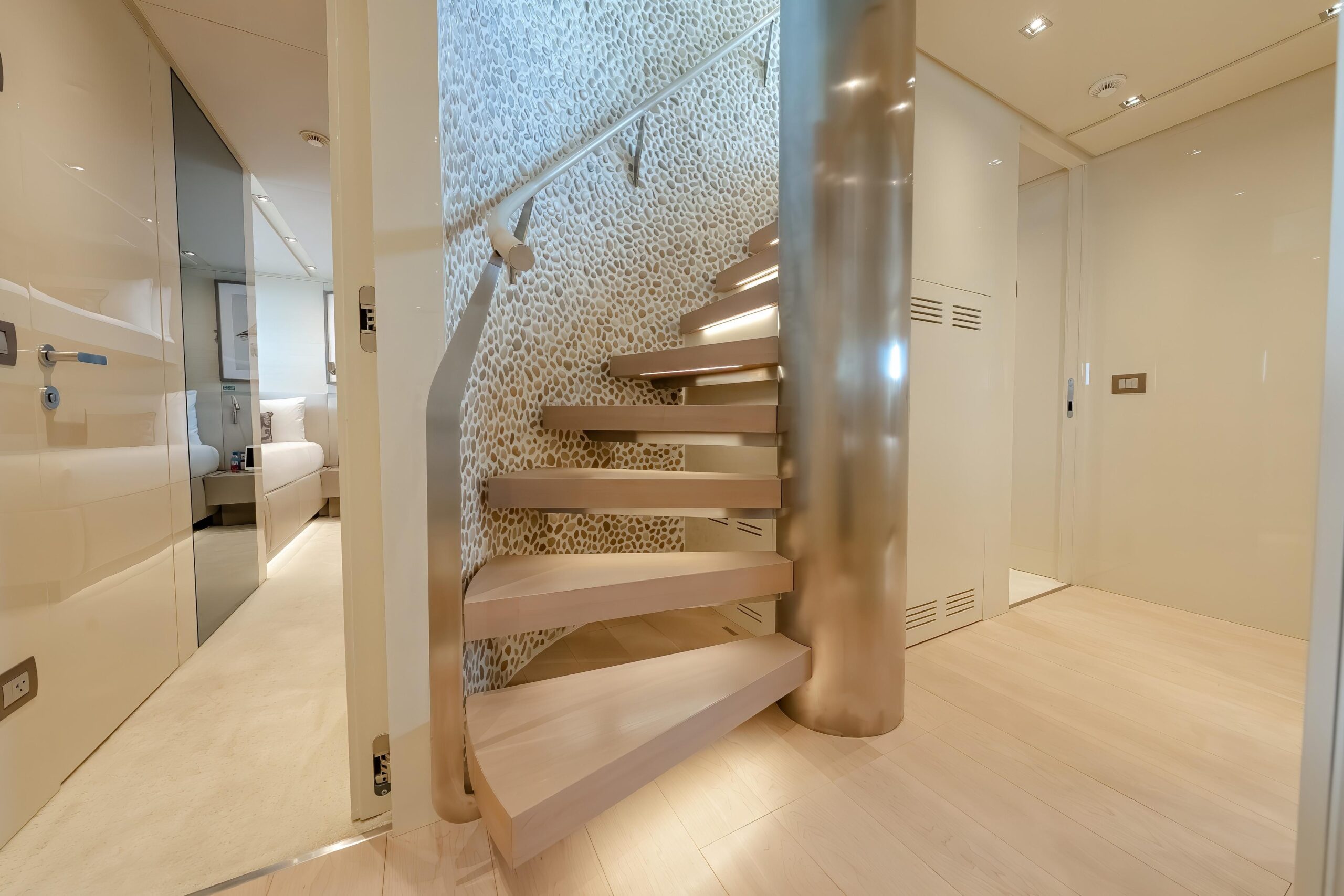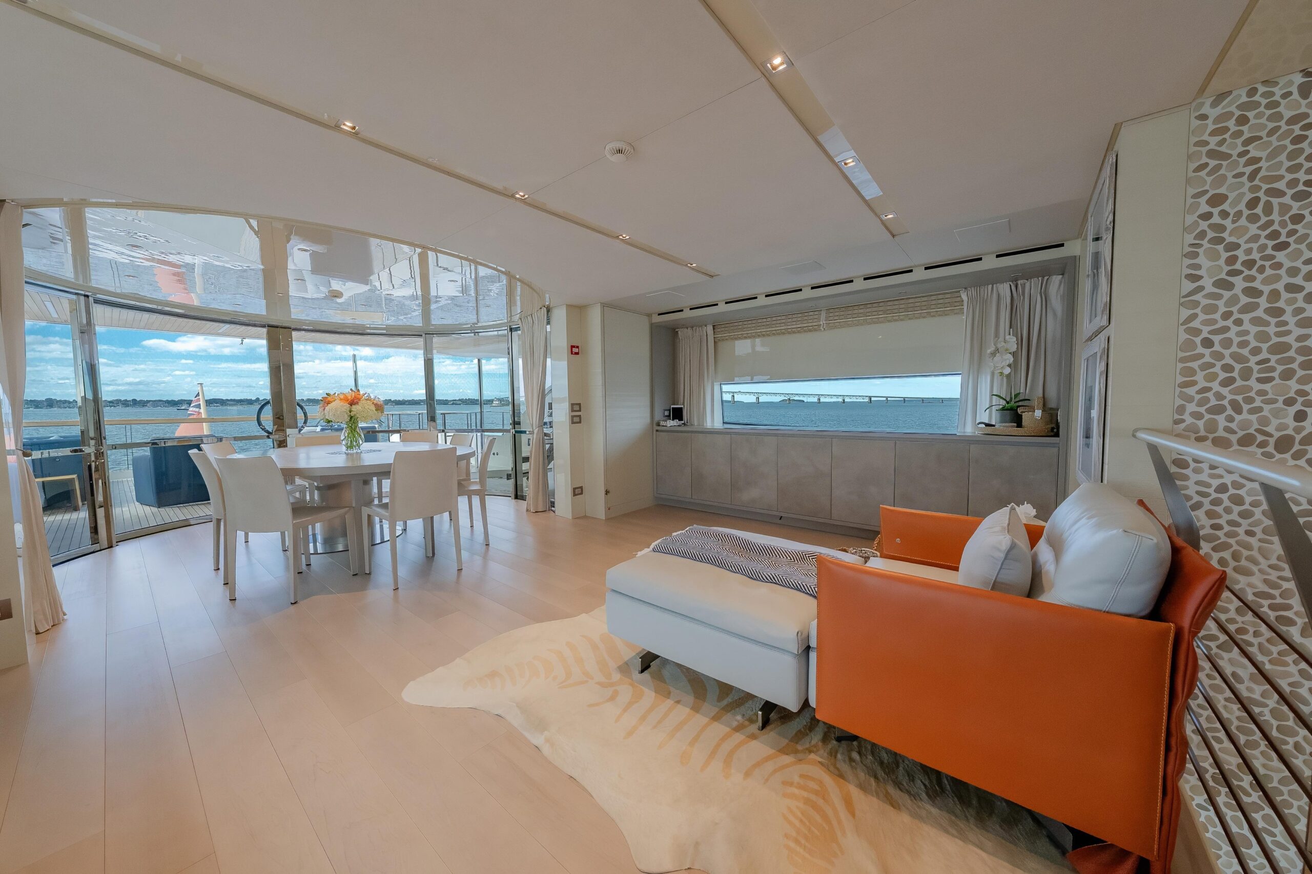 Интерьер выполнен в стиле «St. Barts» от Marty Lowe, сочетая прибрежную цветовую палитру с атмосферой непринуждённой роскоши. Среди ключевых зон на борту — полноширинный скайлаунж, панорамный главный салон с морским балконом, а также обширные зоны для отдыха и приёма гостей на открытом воздухе на всех палубах, включая флайбридж с джакузи, соляриями и баром.