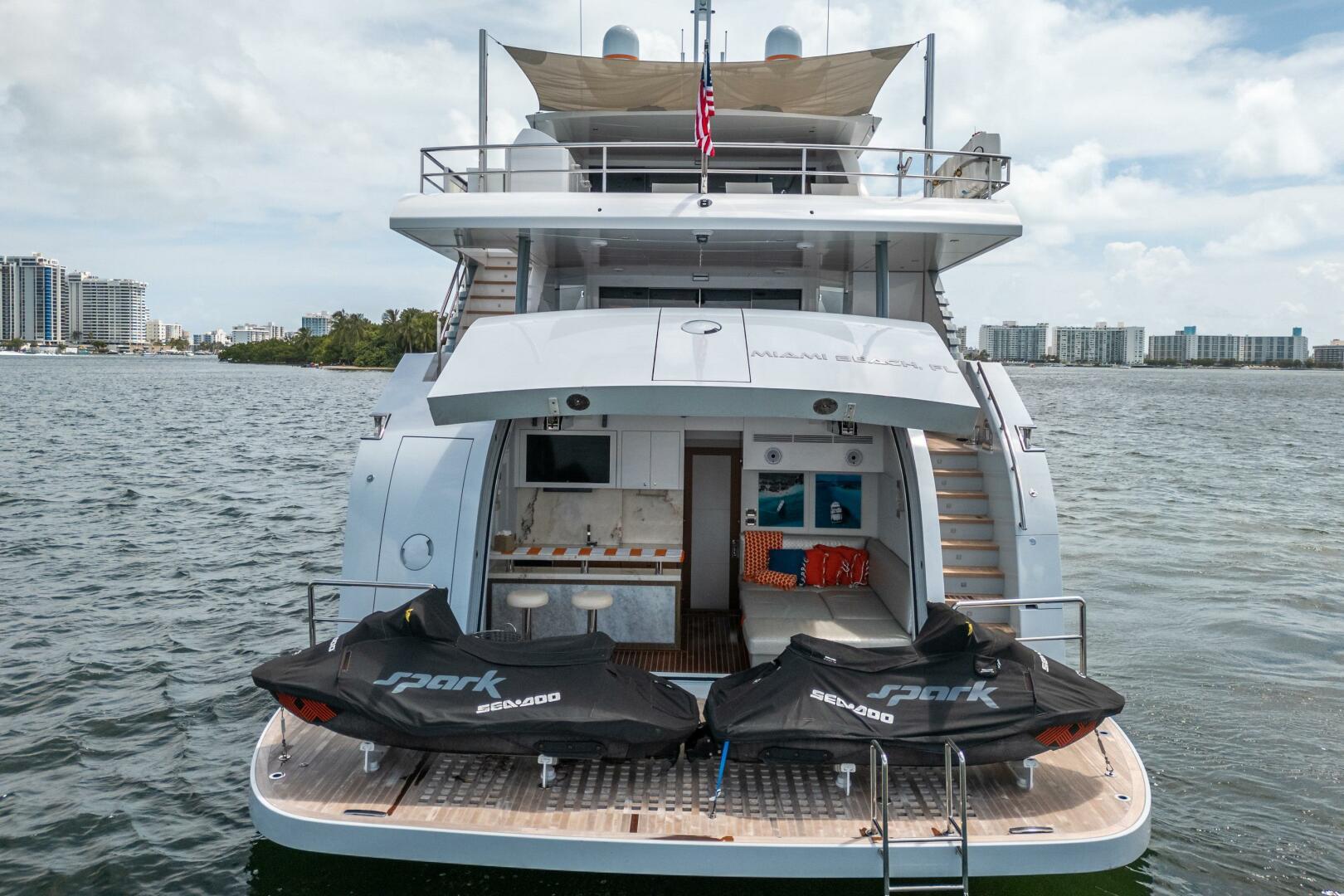 оснащённым баром со стойкой и табуретами, а также U-образной лаунж-зоной по правому борту. В beach club