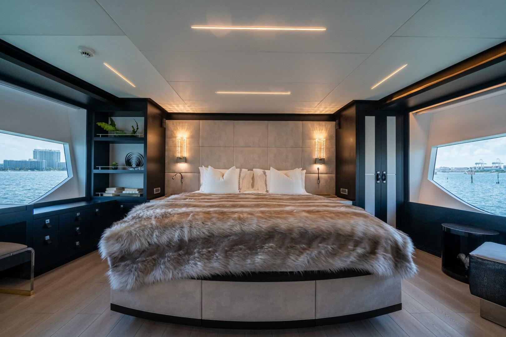 Спускаясь на главную палубу, вы попадаете в мастер-каюту во всю ширину корпуса (full-beam), расположенную