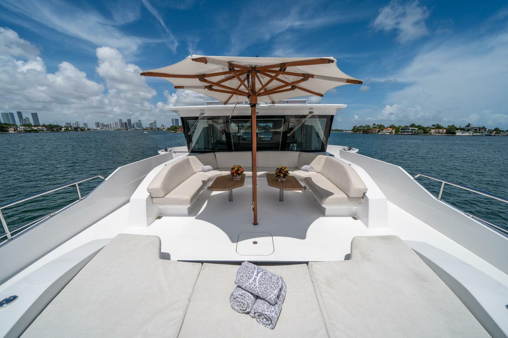 На верхней палубе перед постом управления расположена большая U-образная лаунж-зона с кофейными столиками,