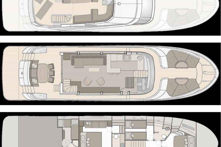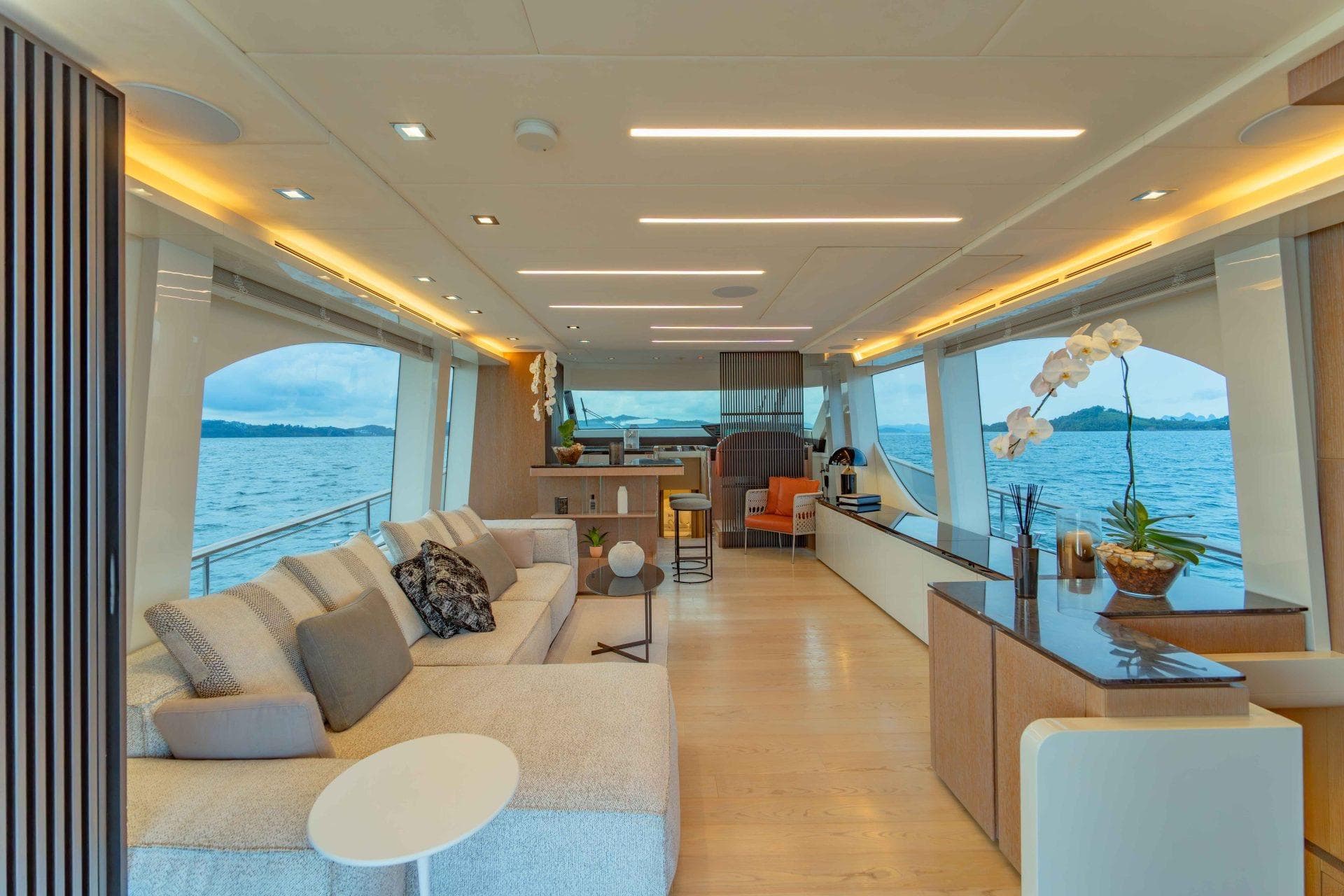 Открытая планировка главной палубы напоминает дизайнерский пентхаус, объединяя внутренние и внешние пространства благодаря большим окнам, наполняющим интерьер естественным светом. Салон и камбуз продуманы как для приёма гостей, так и для повседневного комфорта, а снаружи обширный флайбридж предлагает зоны отдыха под хардтопом, полноценную зону BBQ и бар с раковиной, лежаки и обеденную зону на свежем воздухе — всё создано для общения, комфорта и свободы.