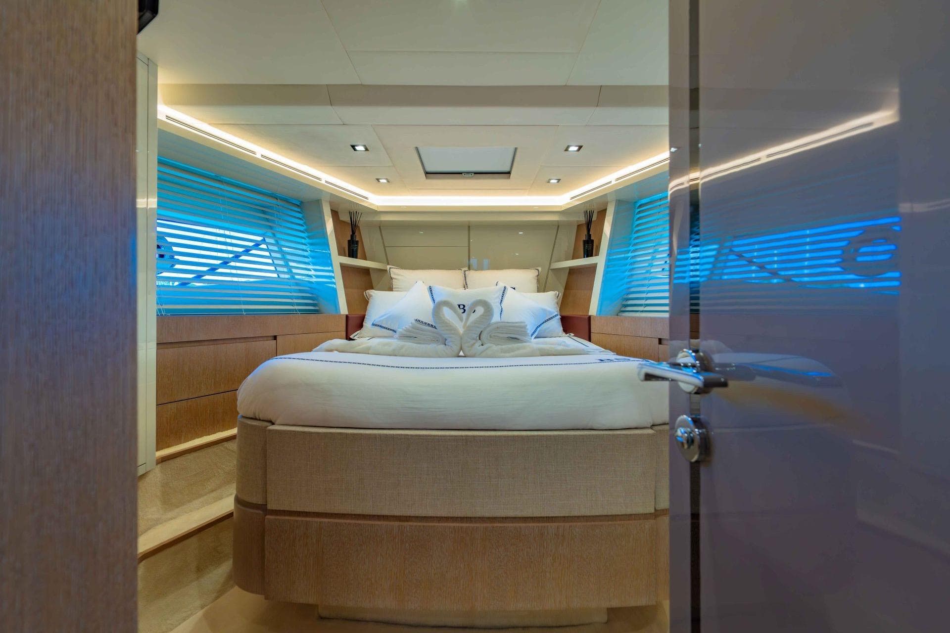 На нижней палубе расположены четыре прекрасно оборудованные каюты, рассчитанные на размещение до восьми гостей. Мастер-каюта во всю ширину корпуса с доступом по отдельной лестнице — особая изюминка, редко встречающаяся в этом размерном классе. Три роскошные ванные комнаты, отдельные каюты для экипажа из двух человек и все современные удобства обеспечивают длительные переходы в полном комфорте.