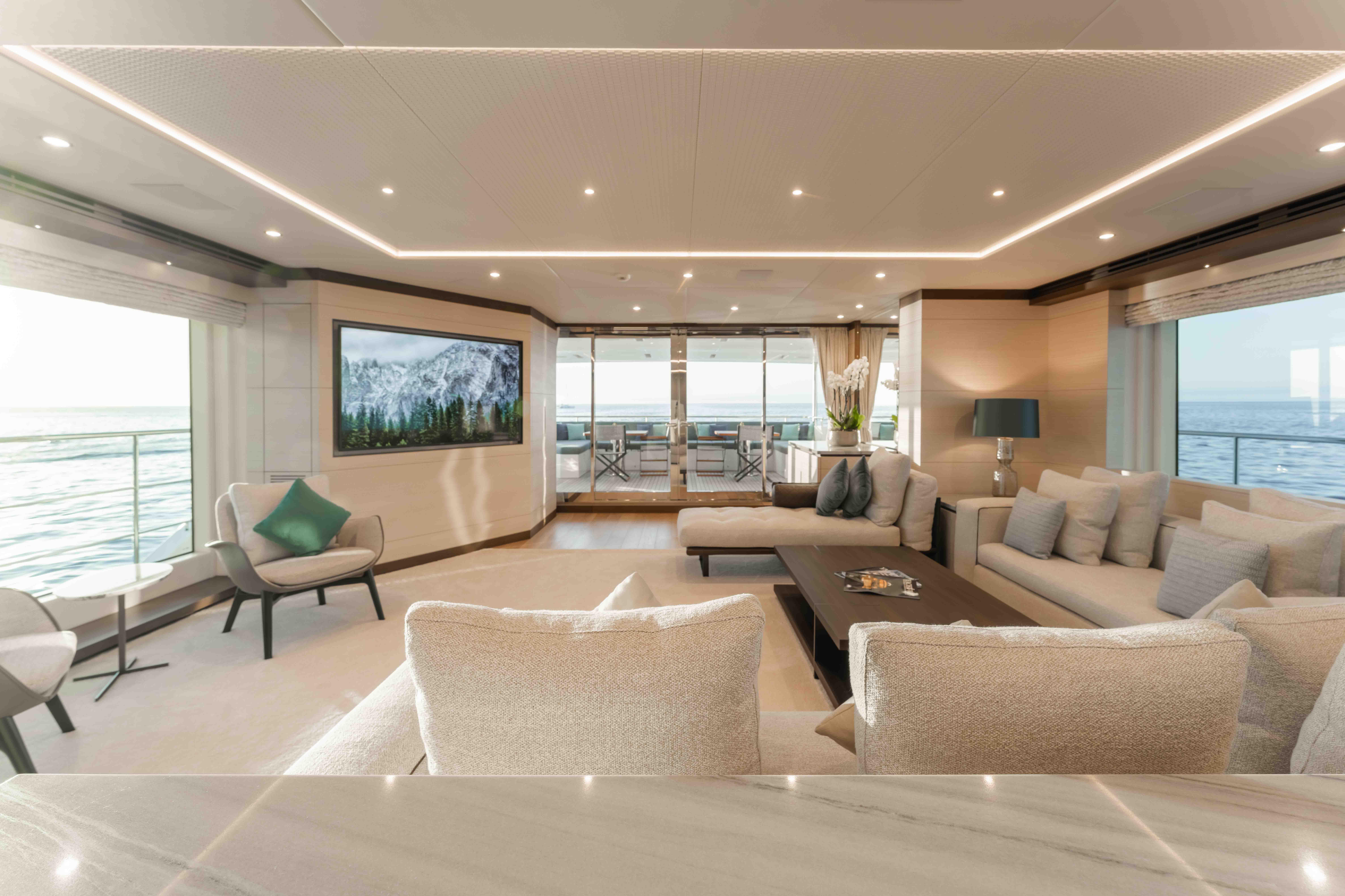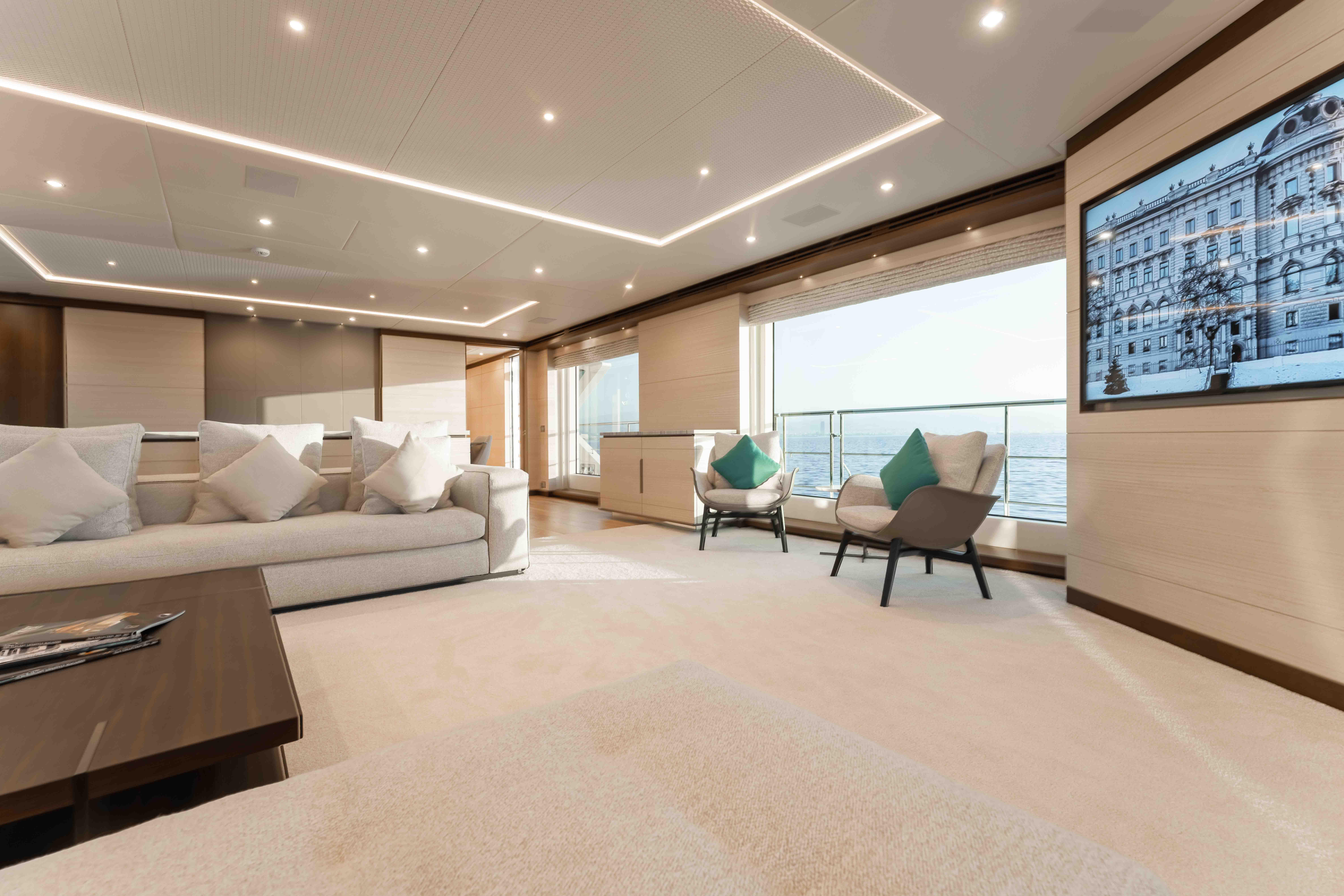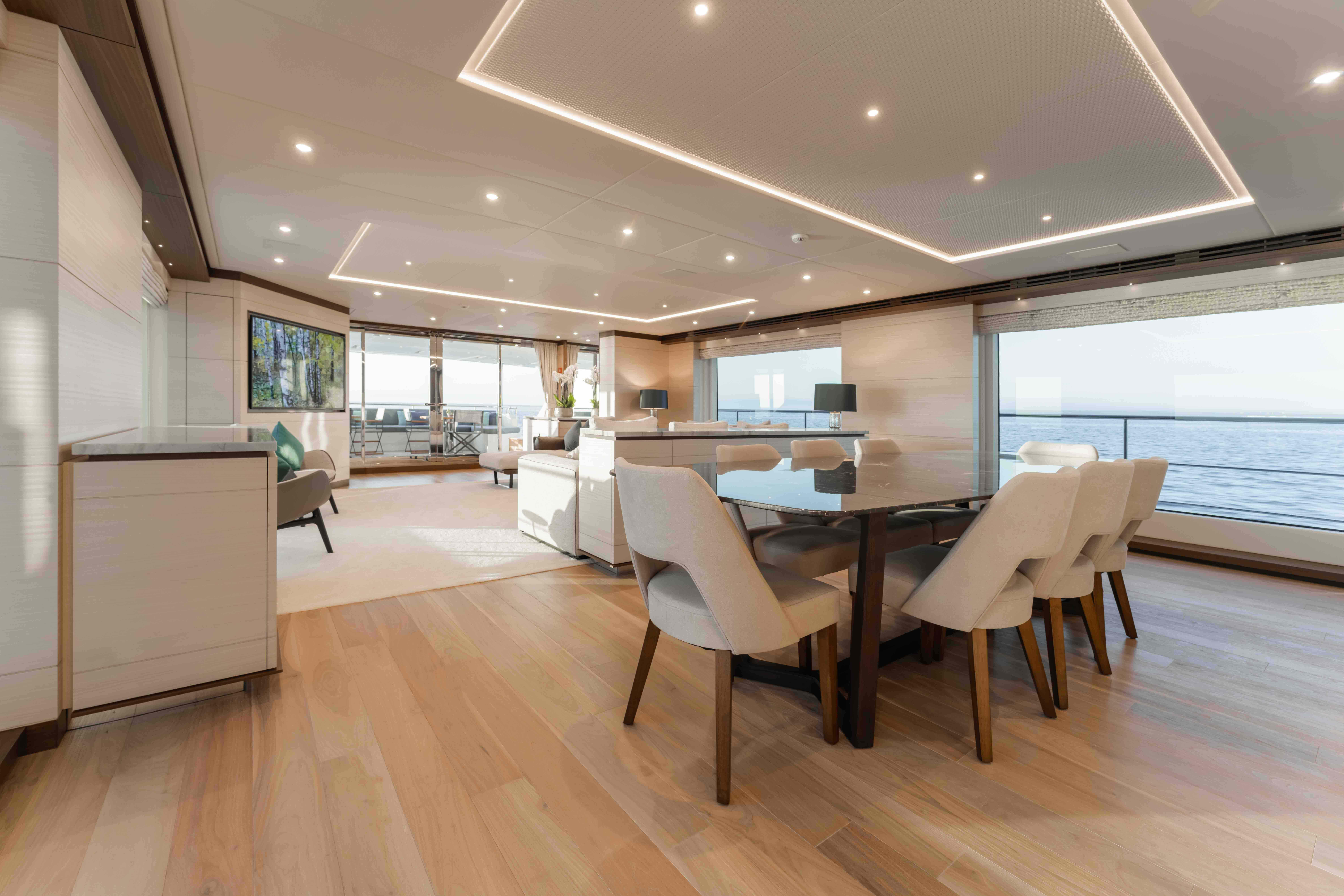 Главный салон Exinity наполнен естественным светом благодаря окнам от пола до потолка. Интерьер, разработанный студией RWD, гармонично сочетает тёмные и светлые древесные отделки. Большой формальный обеденный стол из мрамора рассчитан на размещение до 10 гостей. Просторный скайлаунж оснащён баром, карточным столом и зоной отдыха с большим телевизором.