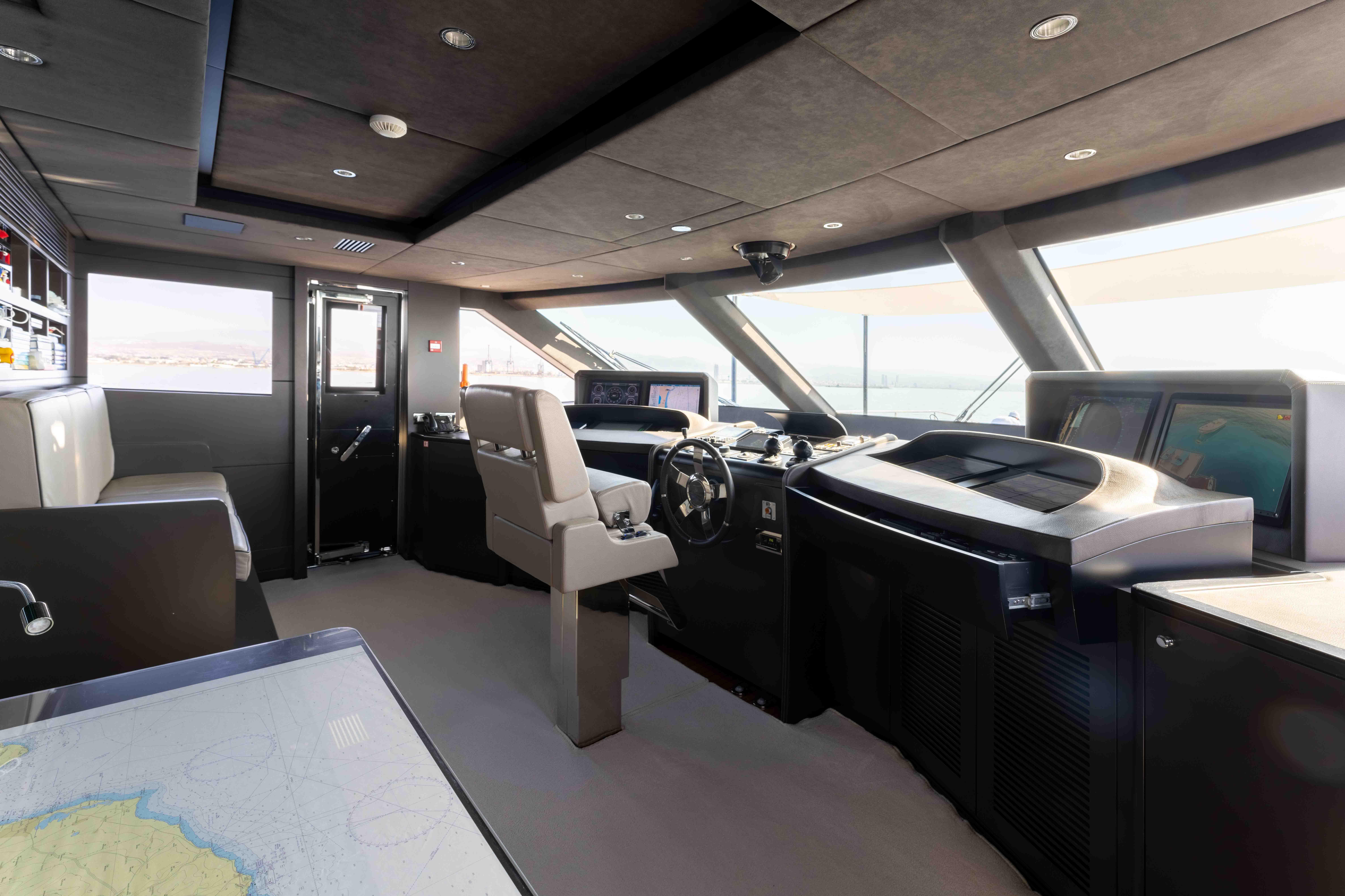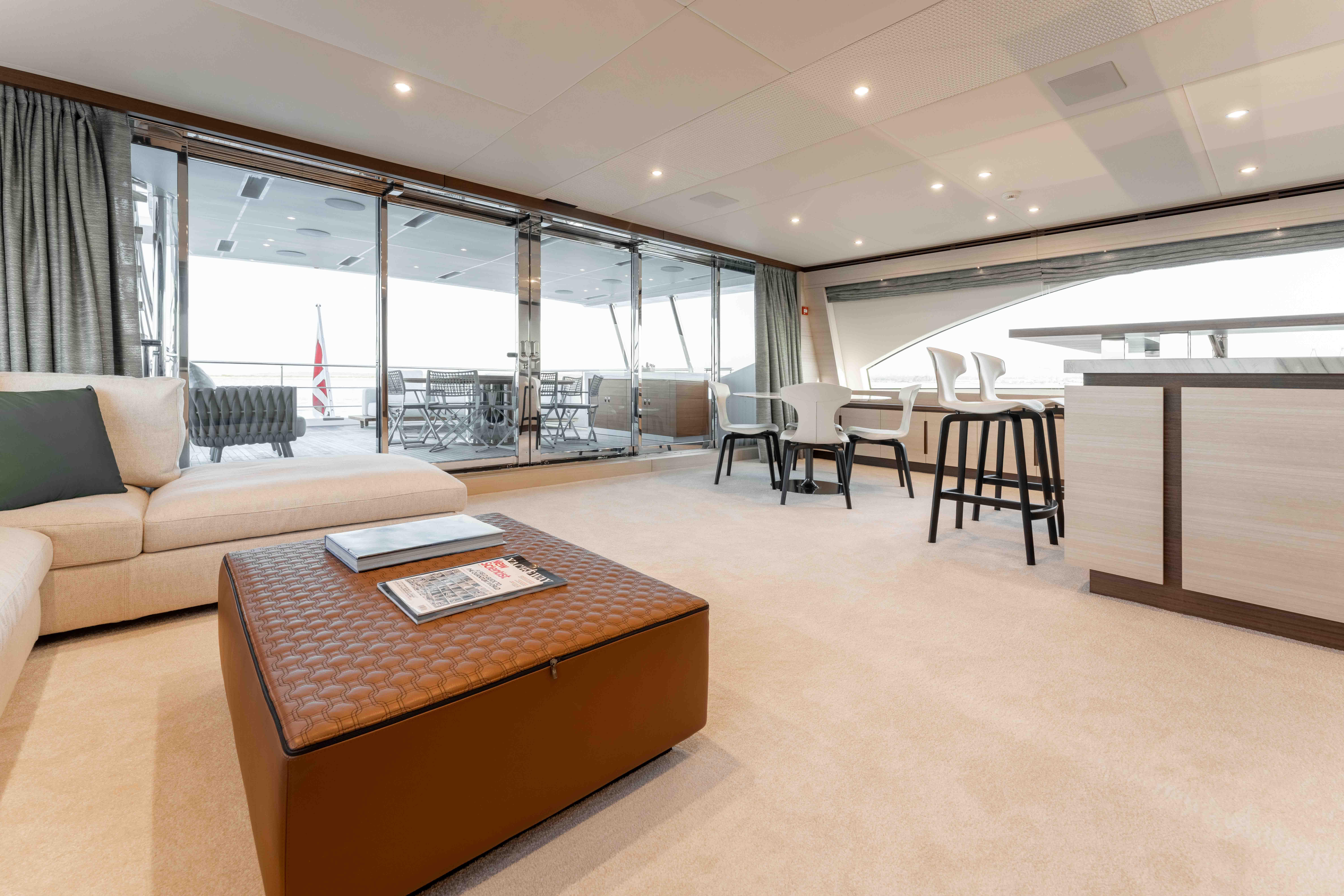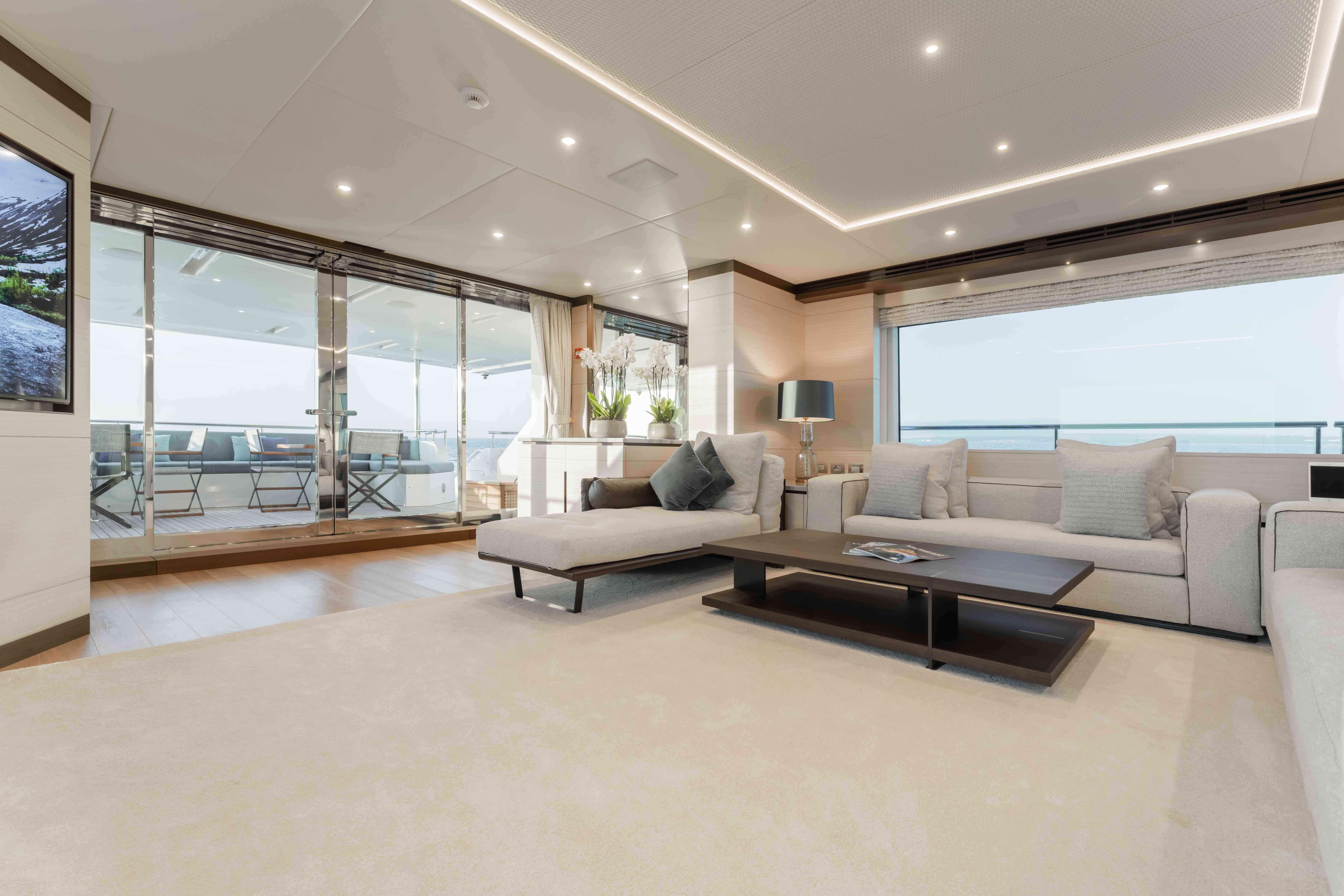 Главный салон Exinity наполнен естественным светом благодаря окнам от пола до потолка. Интерьер, разработанный студией RWD, гармонично сочетает тёмные и светлые древесные отделки. Большой формальный обеденный стол из мрамора рассчитан на размещение до 10 гостей. Просторный скайлаунж оснащён баром, карточным столом и зоной отдыха с большим телевизором.