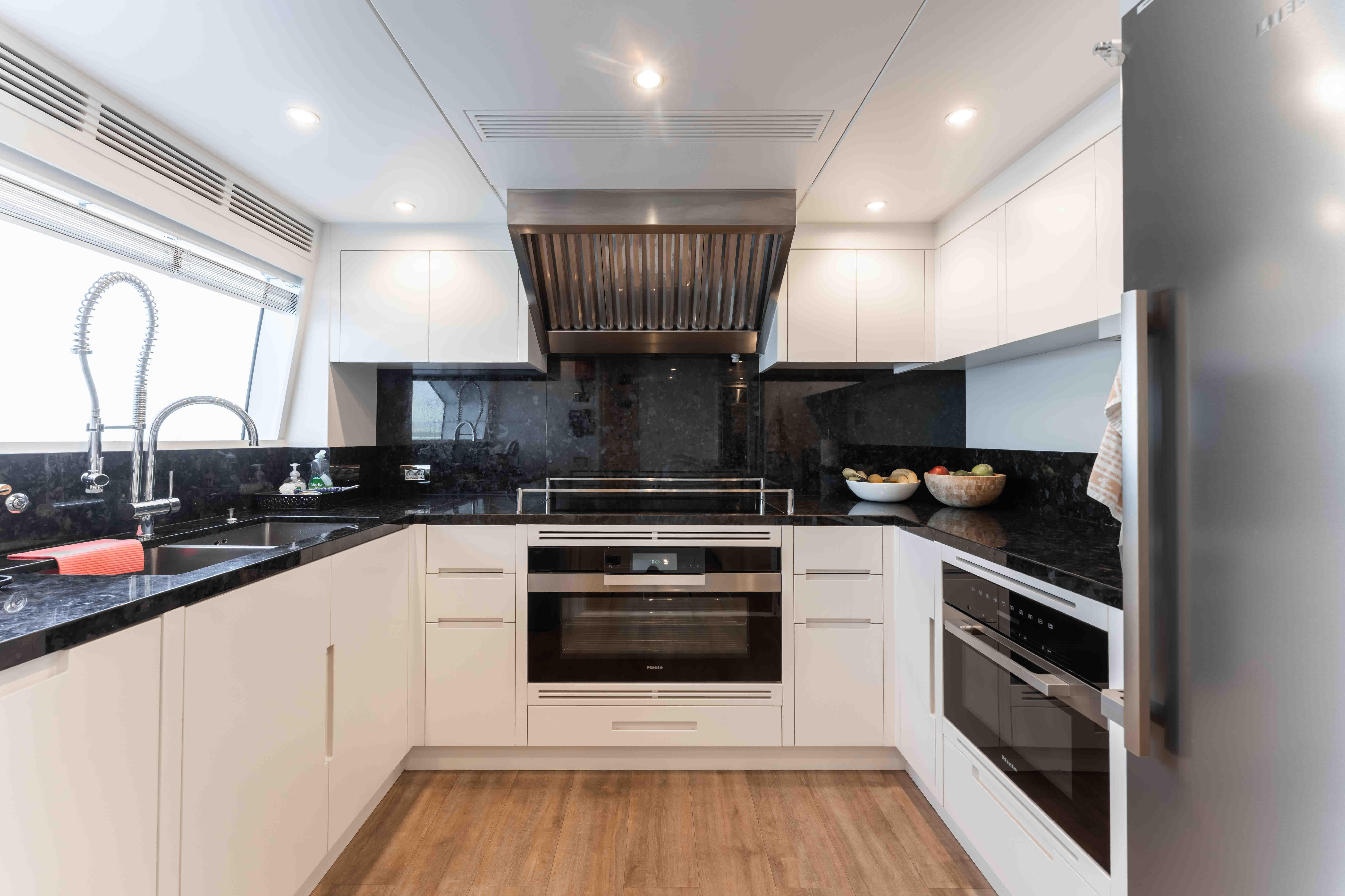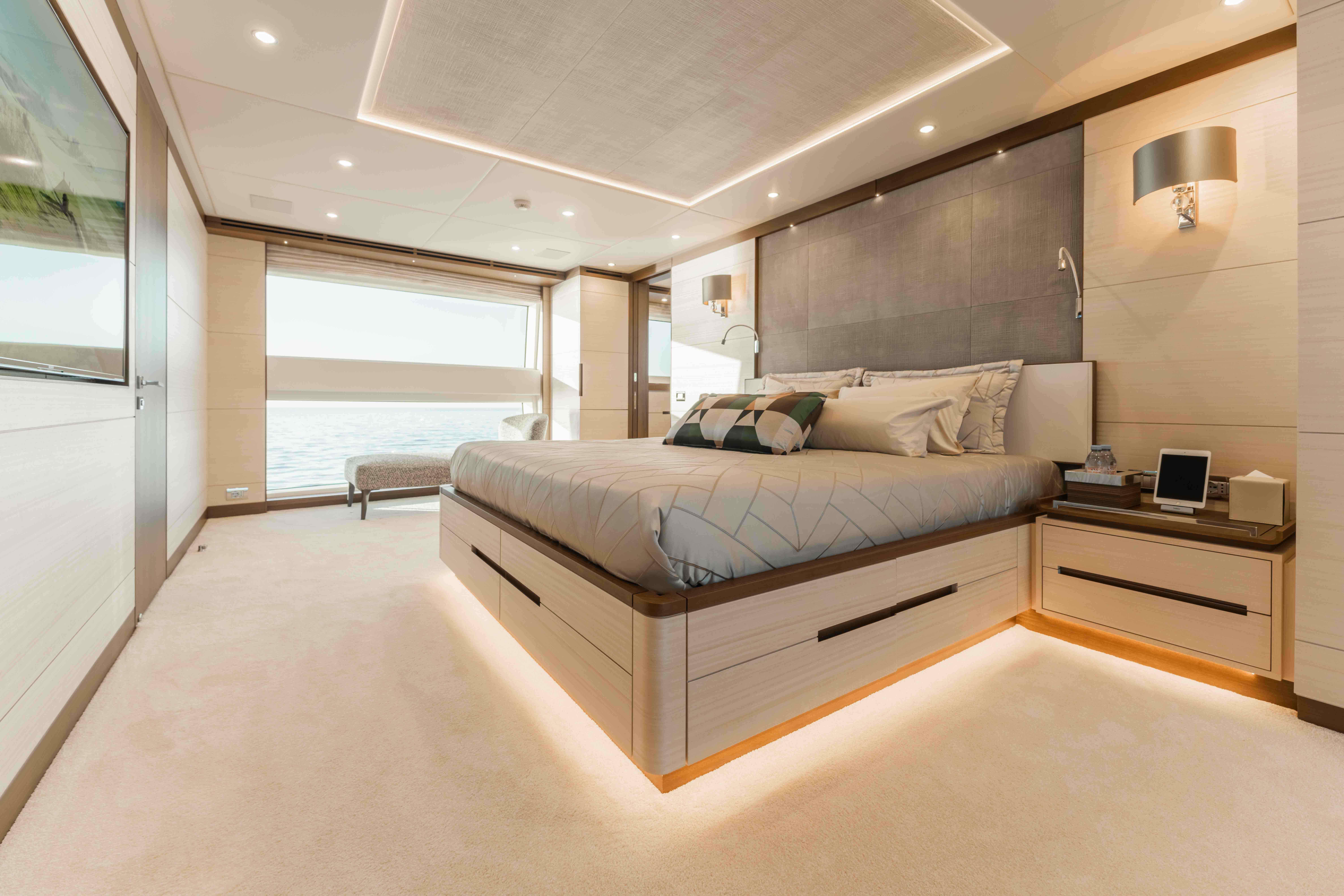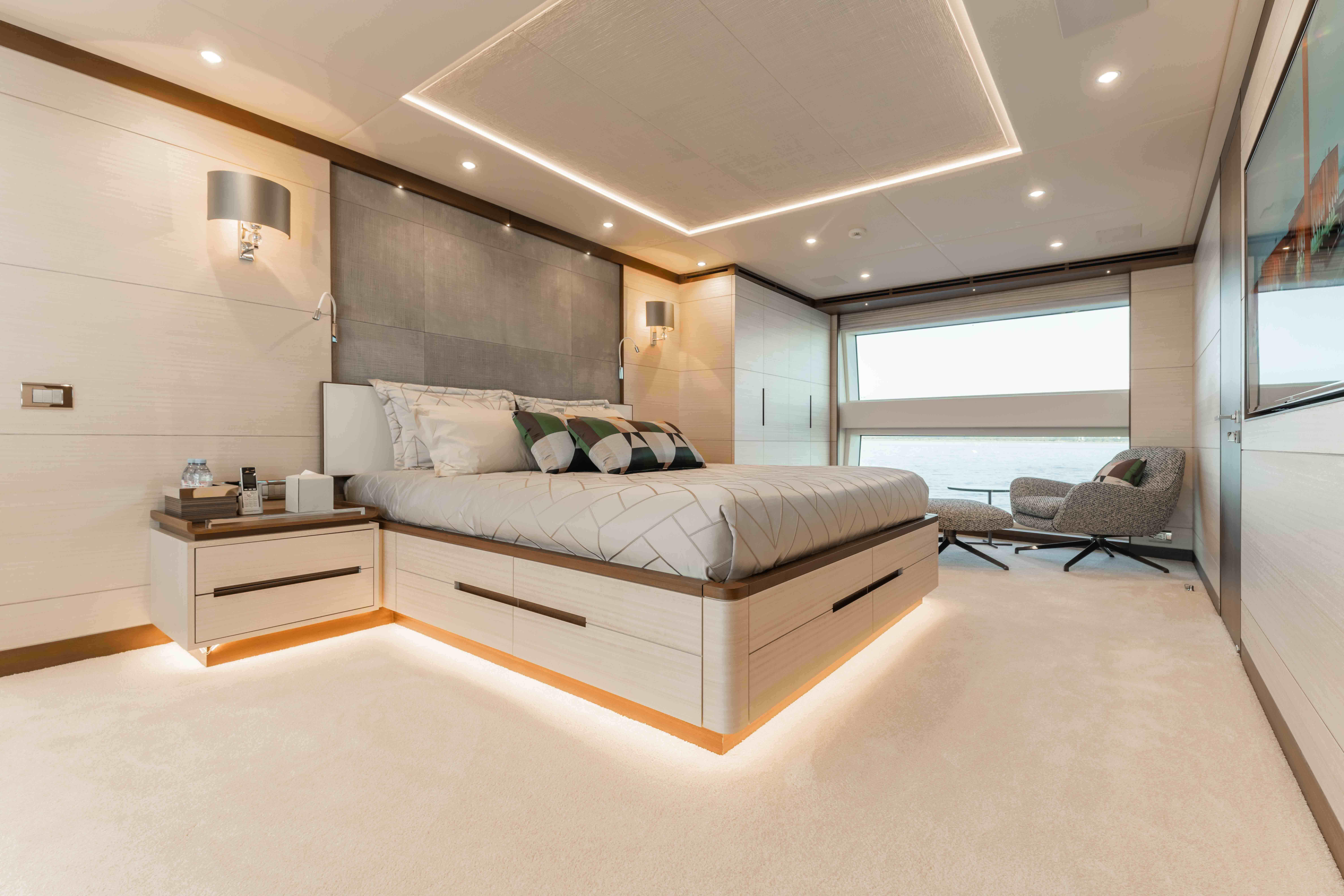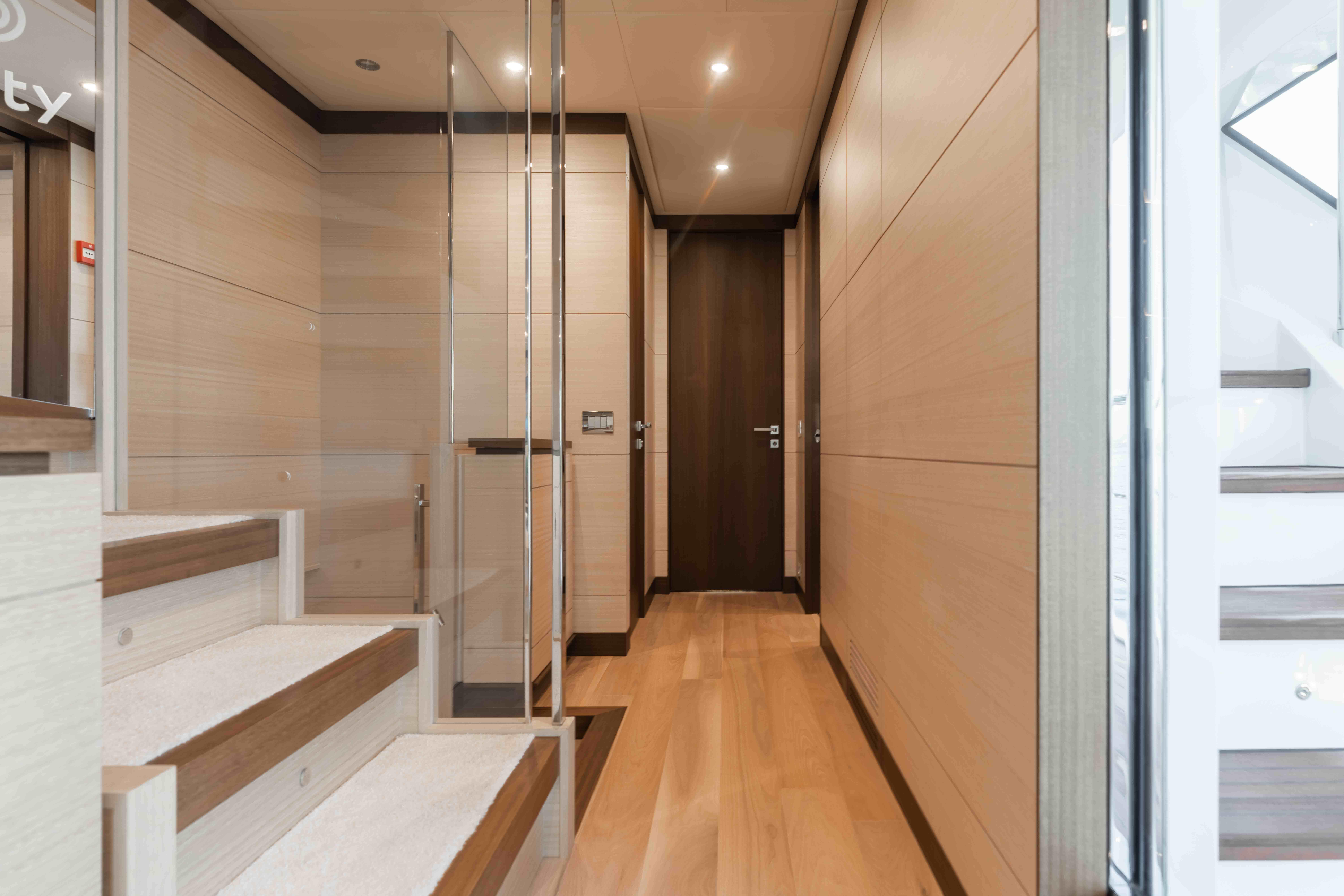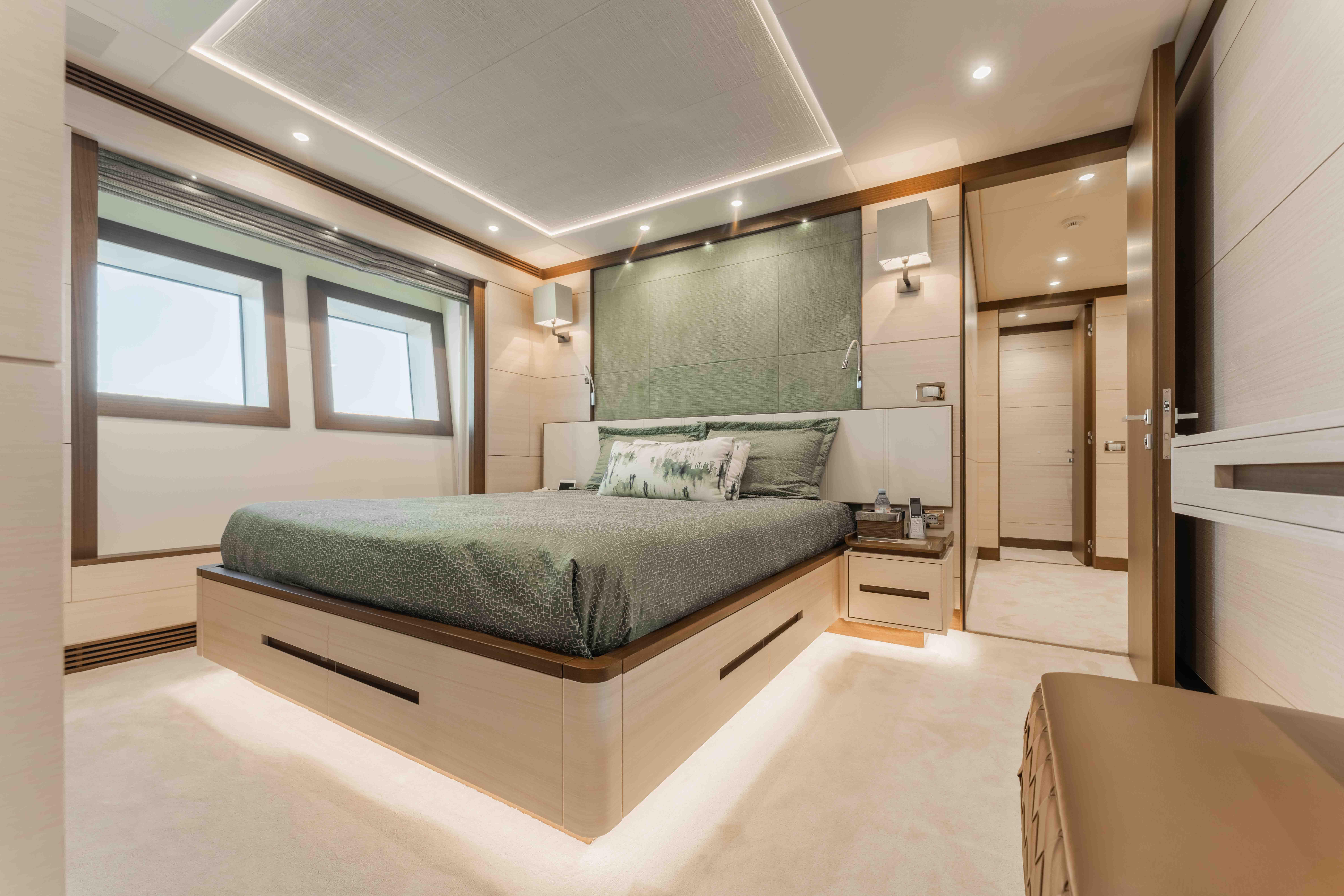 Exinity принимает на борту до 11 гостей в пяти каютах. Просторная каюта владельца на главной палубе наполнена естественным светом благодаря панорамным окнам от пола до потолка и оснащена гардеробной, а также раздельной ванной комнатой «his & hers» с душем. Дополнительно предусмотрены четыре гостевые каюты: две с кроватями queen-size и две с раздельными кроватями; в левой каюте с раздельными кроватями имеется дополнительное спальное место Pullman. Все гостевые каюты оборудованы собственными ванными комнатами. Для экипажа предусмотрены три каюты и отдельная каюта капитана за рулевой рубкой, что позволяет разместить до 7 членов экипажа.