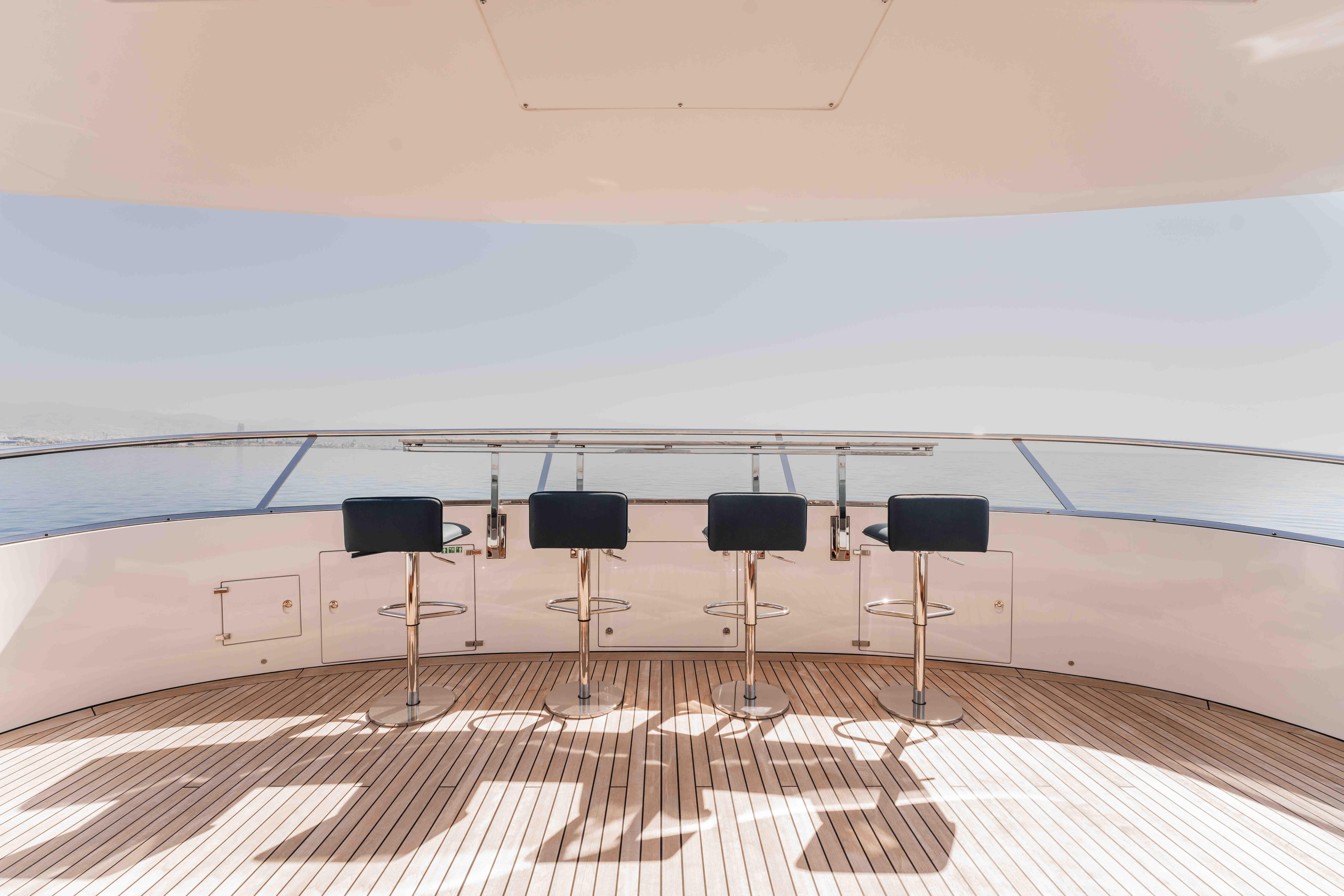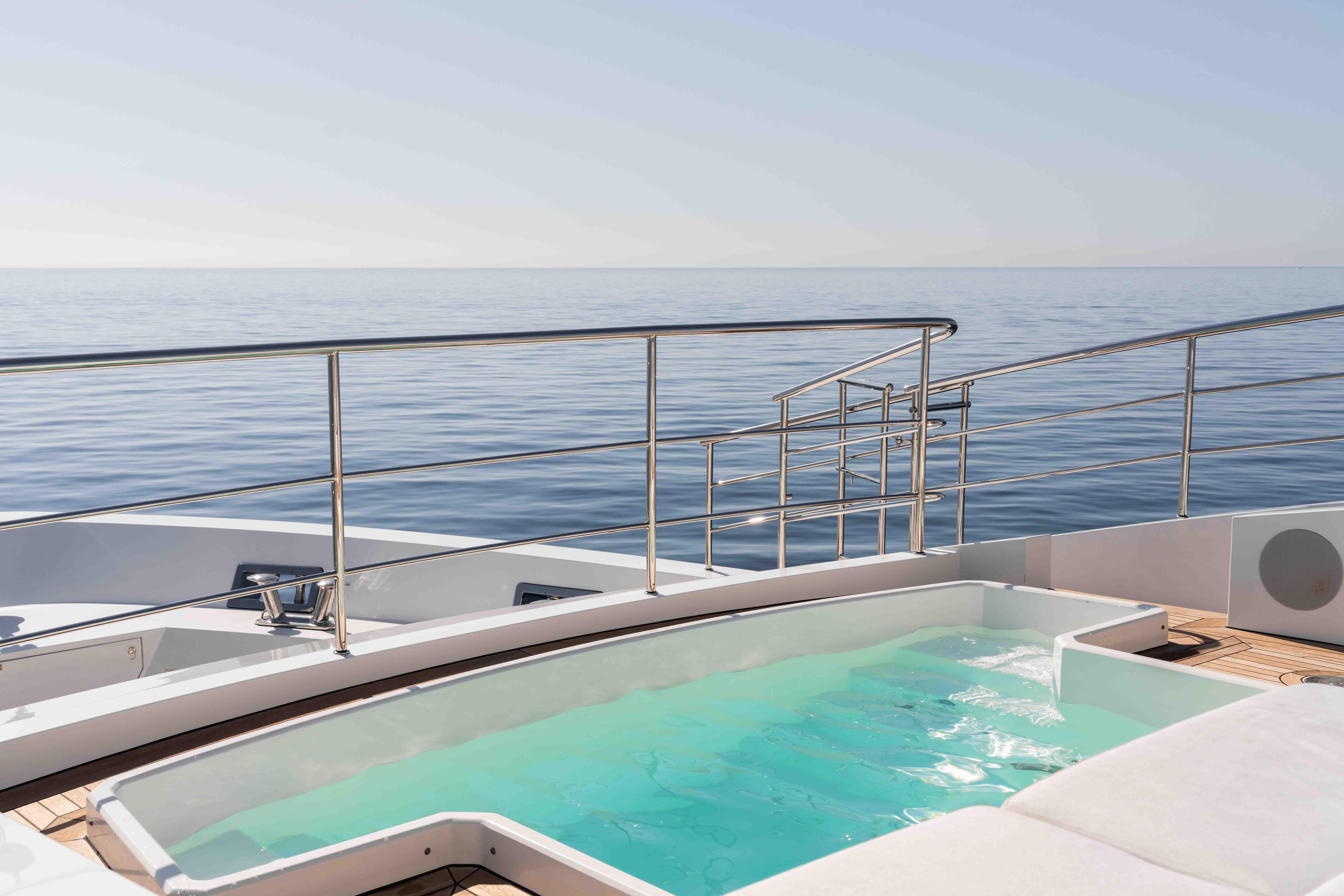 Exinity в полной мере отражает фирменную эстетику Benetti благодаря своим чётким, стремительным внешним линиям и обилию удобств. На носовой палубе расположено большое индивидуально спроектированное джакузи / мини-бассейн, окружённое зонами отдыха, где гости могут расслабиться и наслаждаться уединением и панорамными видами. Сандек Exinity идеально подходит для приёма гостей: здесь есть бар, множество лаунж-зон и раздвижная крыша, обеспечивающая полноценный формат отдыха на открытом воздухе. Завершает гостевой комфорт отлично оборудованный бич-клаб с большой купальной платформой и отдельным дневным санузлом.