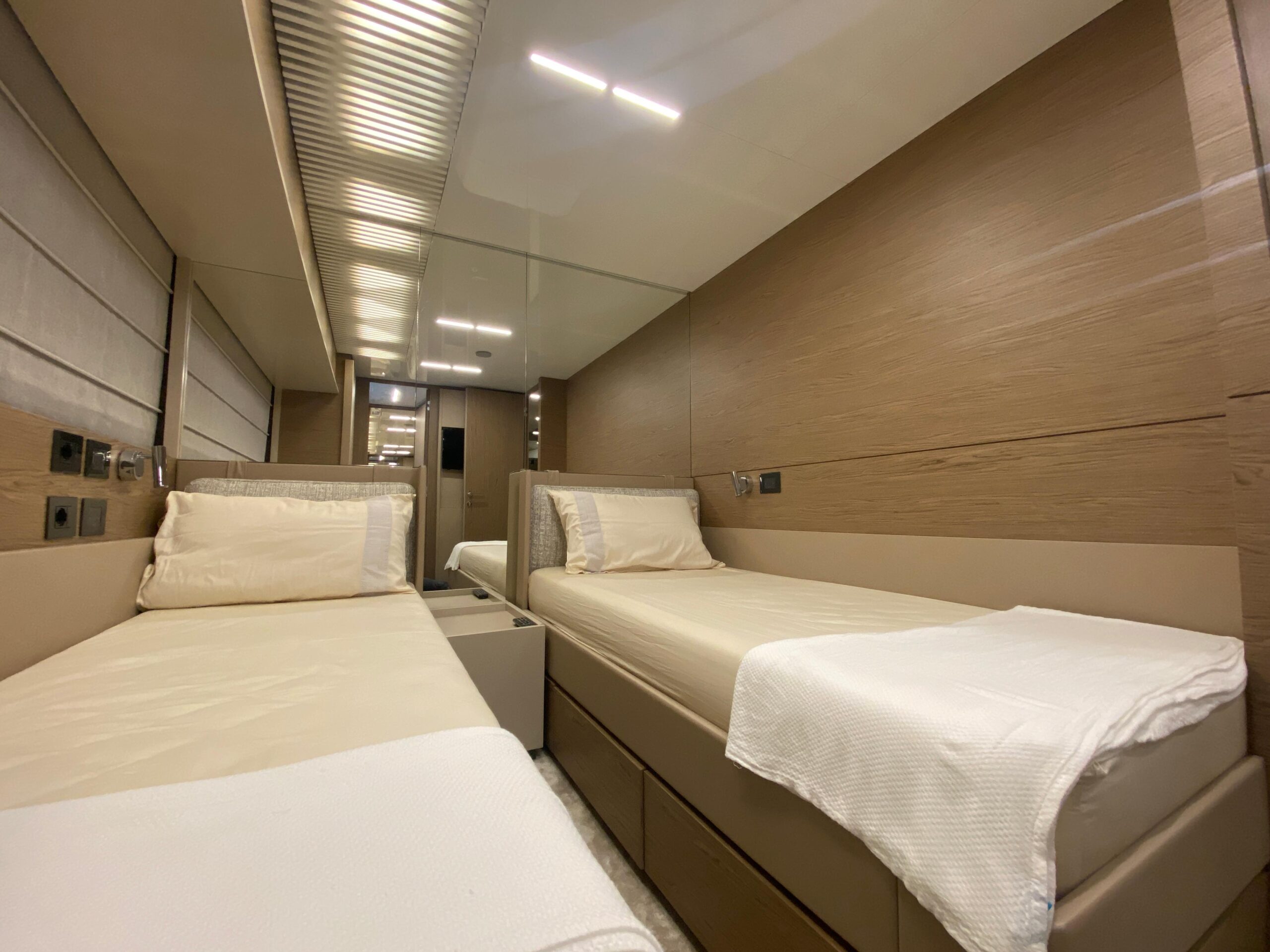 Благодаря очень продуманной планировке и интерьерным решениям яхта предлагает впечатляющий внутренний объём и просторные палубы. Она размещает до 10 гостей в 5 роскошных каютах, включая просторную мастер-каюту на главной палубе с гардеробной walk-in и ванной комнатой, 2 VIP-каюты и 2 каюты с раздельными кроватями на нижней палубе.