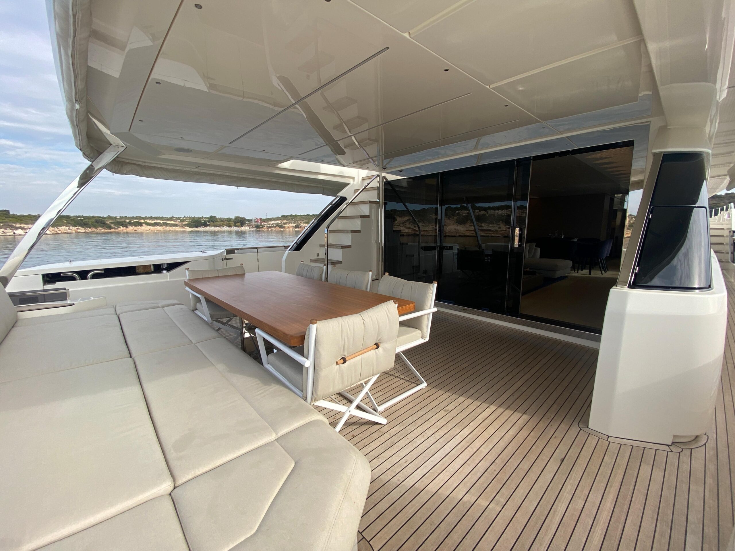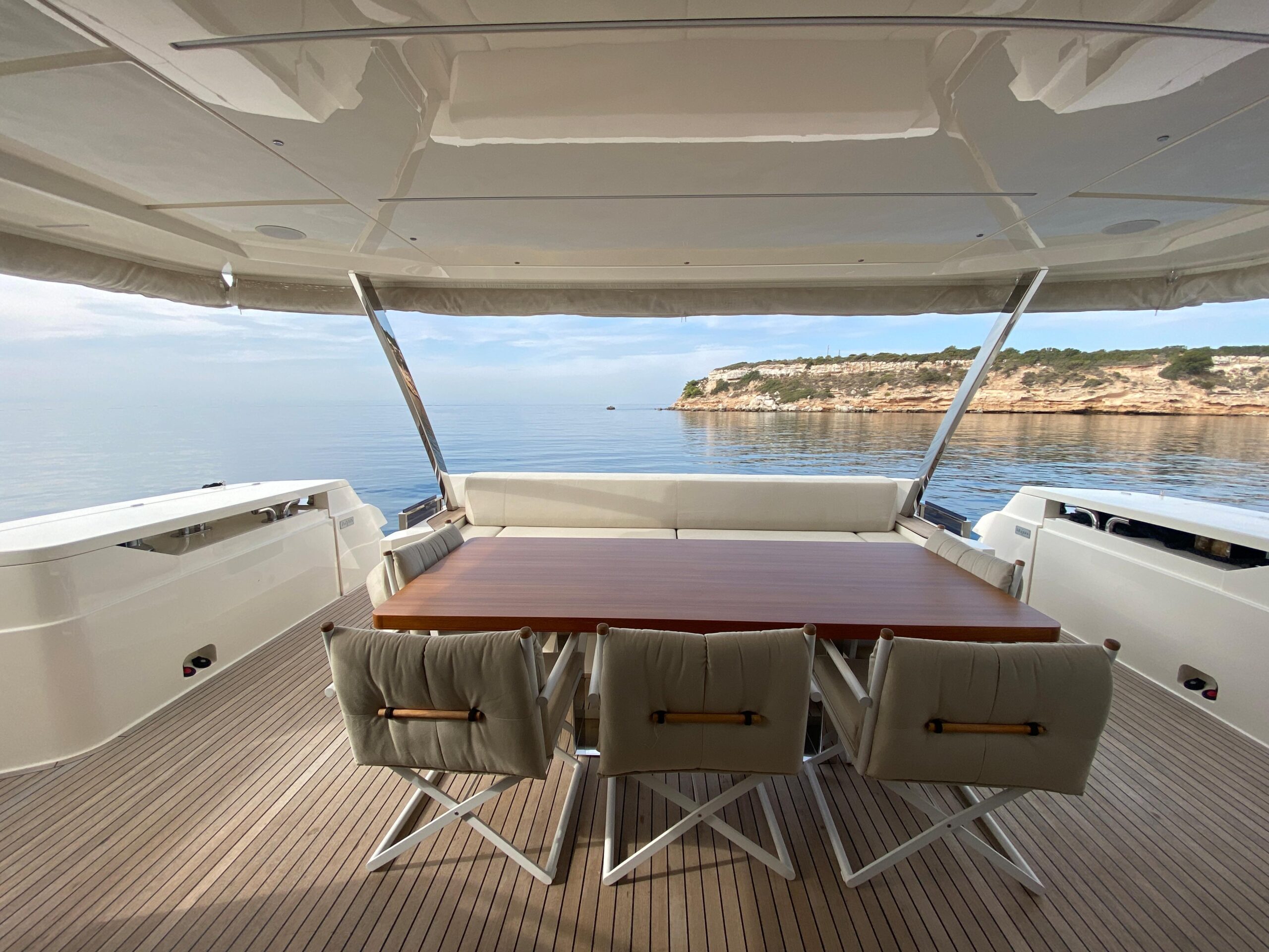 Просторная солнечная палуба оборудована большими лежаками, баром с грилем и второй обеденной зоной на открытом воздухе, защищённой жёстким хардтопом с электрически открывающимся люком.