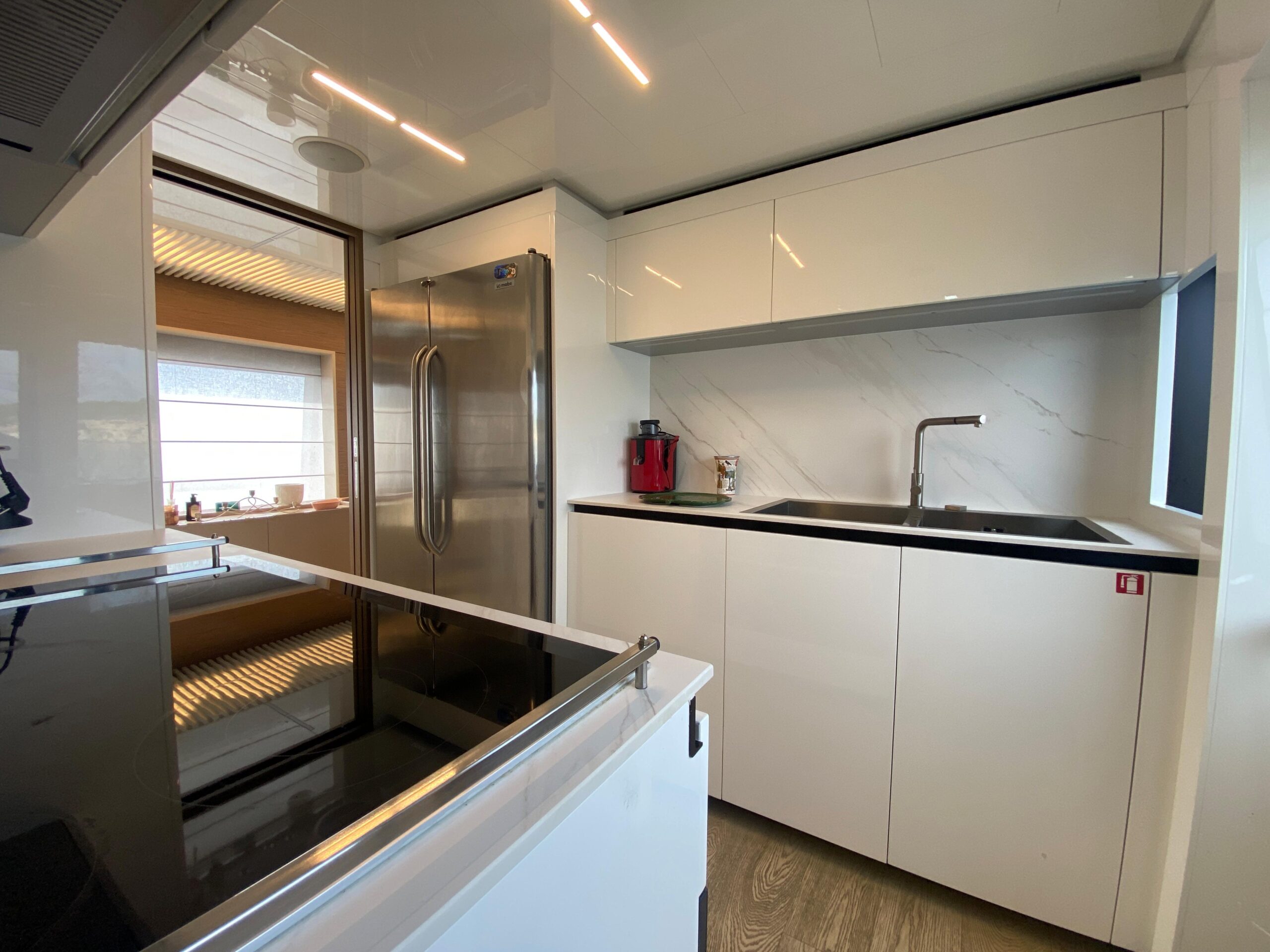На кормовой палубе расположена первая обеденная зона «al fresco», тогда как салон разделён на уютную лаунж-зону и большую обеденную зону. Полностью оборудованный камбуз на главной палубе ведёт к высокотехнологичной рулевой рубке, а также к комфортной кают-компании экипажа и 3 каютам для размещения до 5 членов экипажа.
