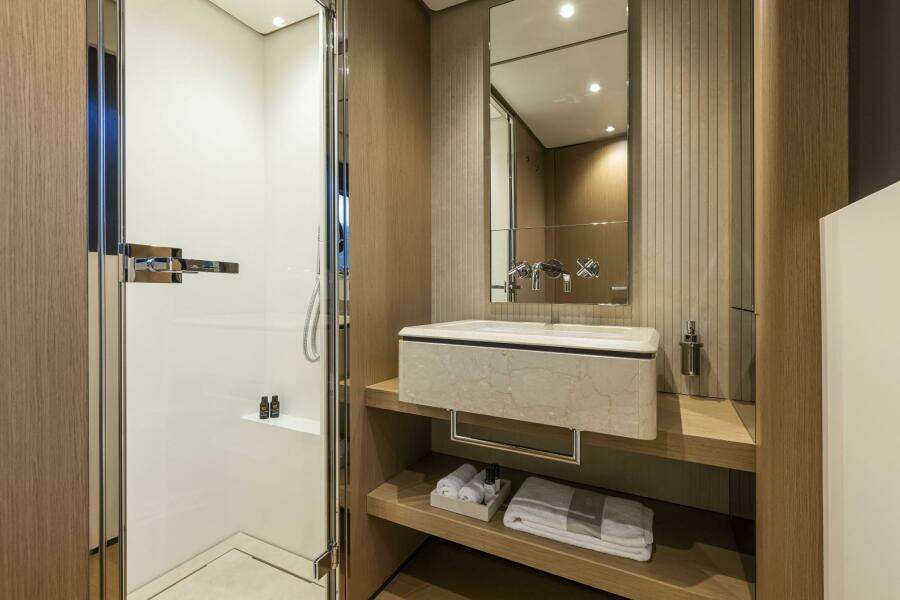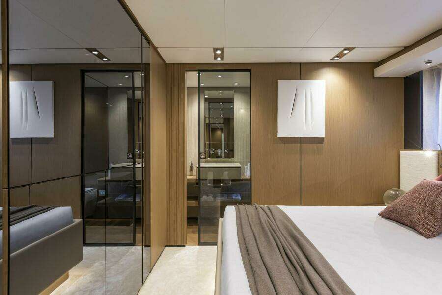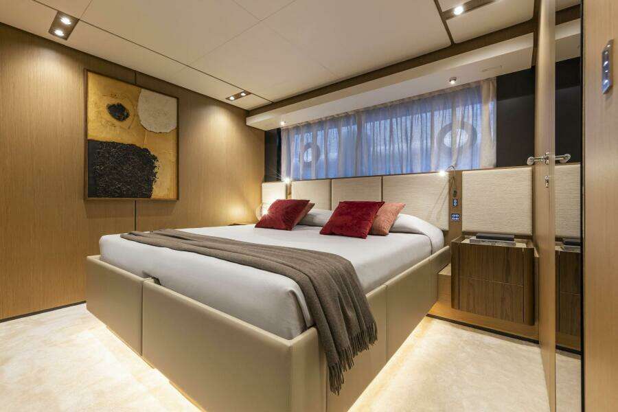 При длине 30,13 м и ширине 6,81 м она сочетает изящные итальянские линии с просторным флайбриджем, панорамными окнами салона от пола до потолка и полноразмерной мастер-каютой во всю ширину корпуса на главной палубе. Четыре гостевые каюты на нижней палубе комфортно размещают до 10 гостей.