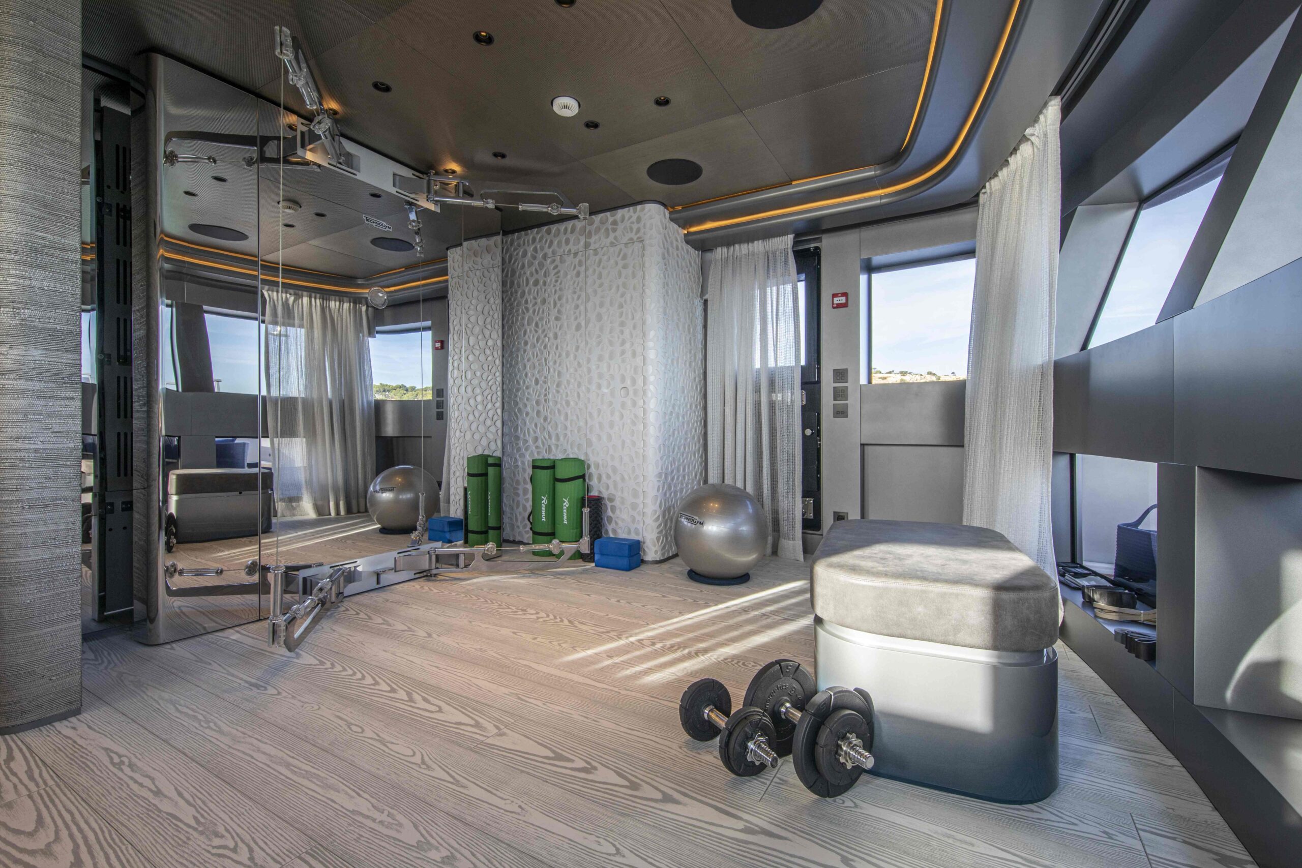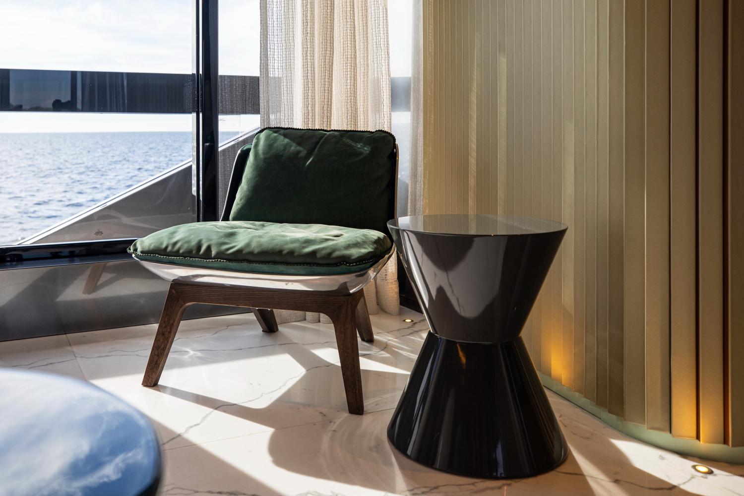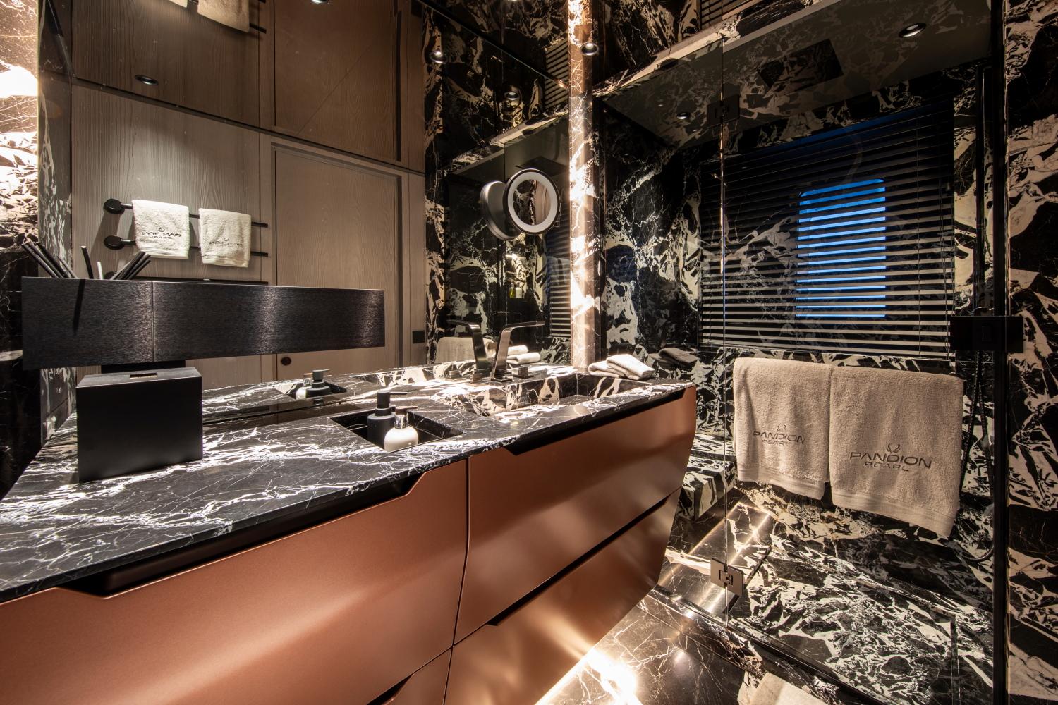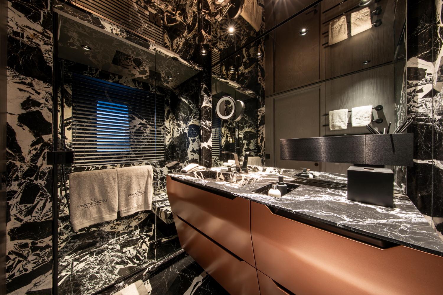 Благодаря ультраширокой ширине корпуса 9 метров и внутреннему объёму почти 490 GT, PANDION PEARL может разместить до 12 гостей в пяти роскошных каютах, включая уникальную мастер-каюту, занимающую три палубы. Эта каюта, спроектированная как полноценные приватные апартаменты площадью около 150 м² и организованная на трёх уровнях, является поистине инновационным и беспрецедентным решением для яхты данного размера.